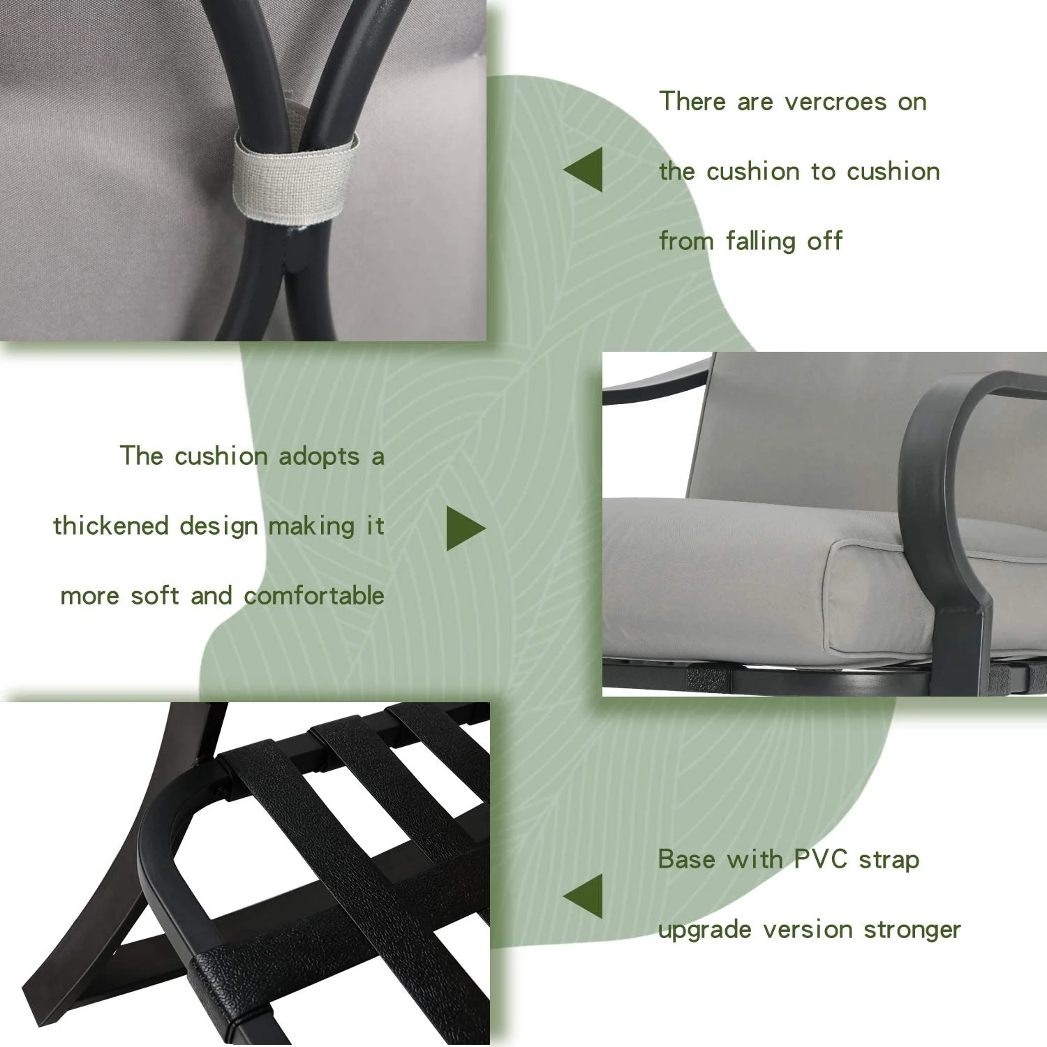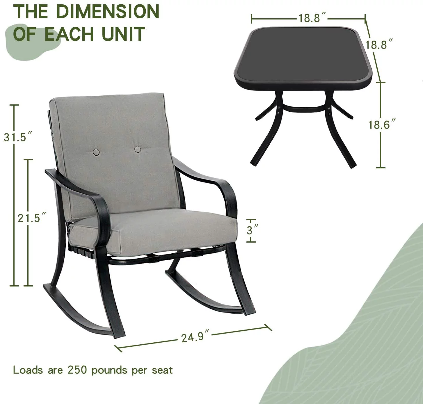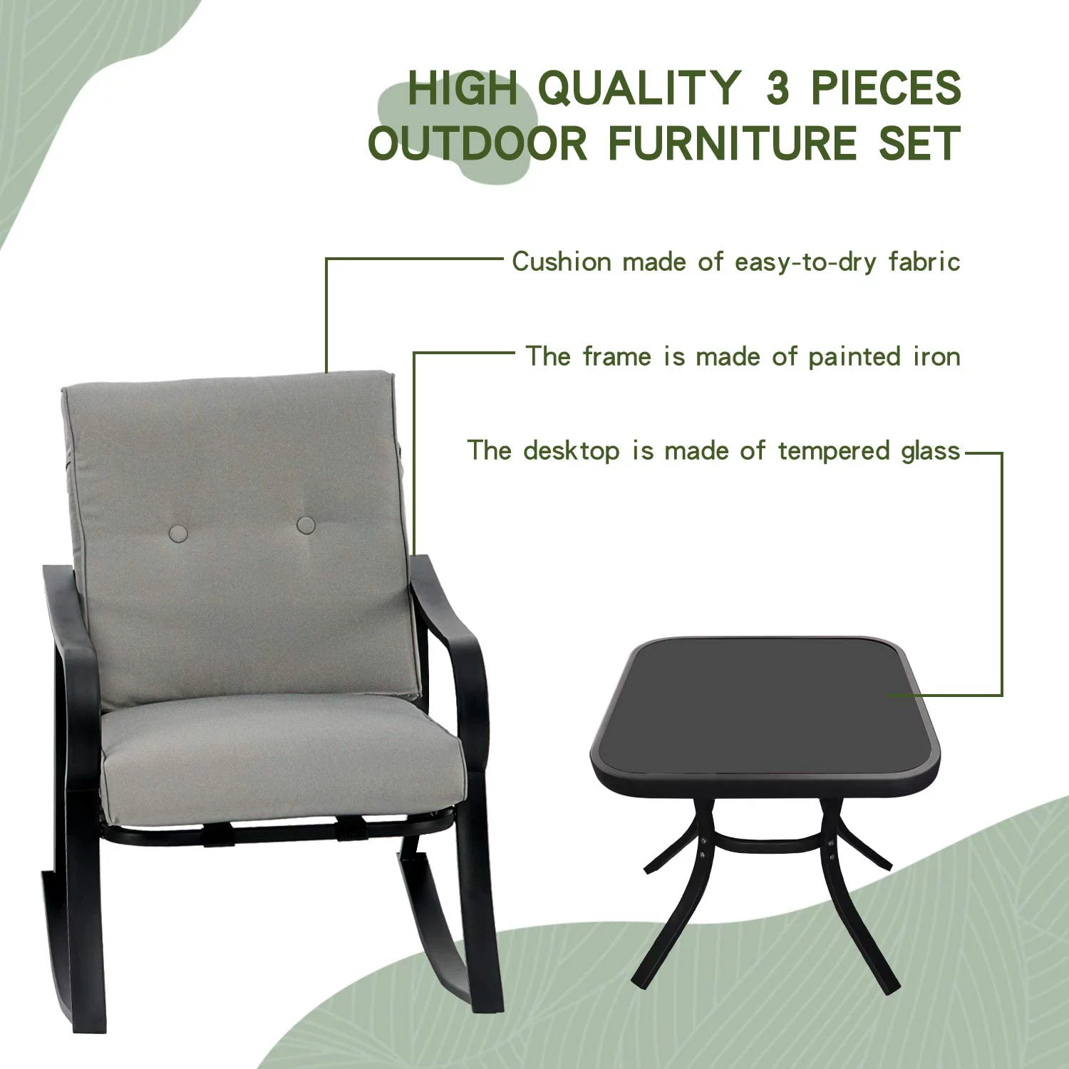 SOLAURA 3-Piece Outdoor Rocking Chairs Set, Black Iron Patio Furniture with Gray Thickened Cushion & Glass Coffee Table