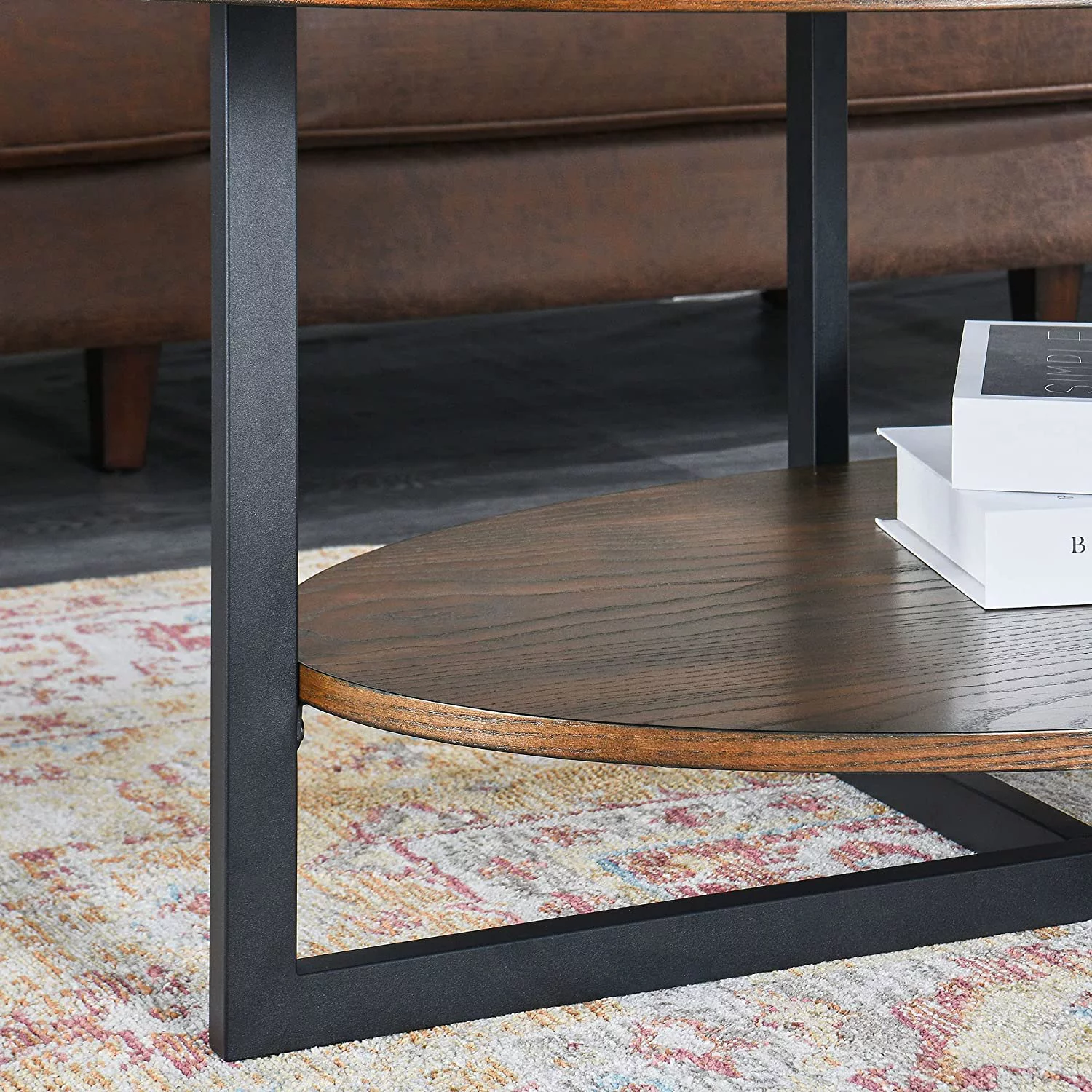 Wood Oval Coffee Table with Cross Metal Legs 43.3" 2-Tier Modern Industrail Center Table with Open Shelf Polished Edging Cocktail Tea Table for Living Room Bedroom Home Rustic Natur