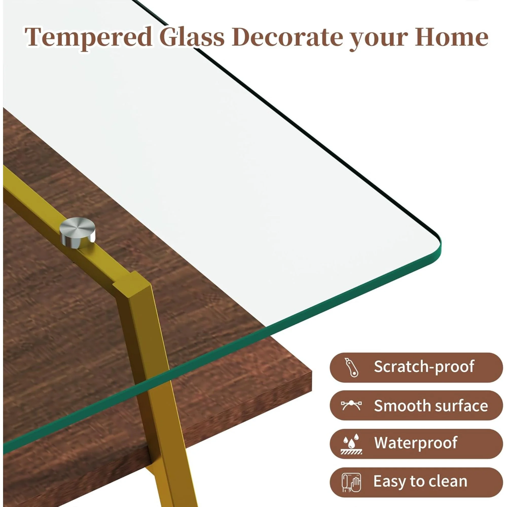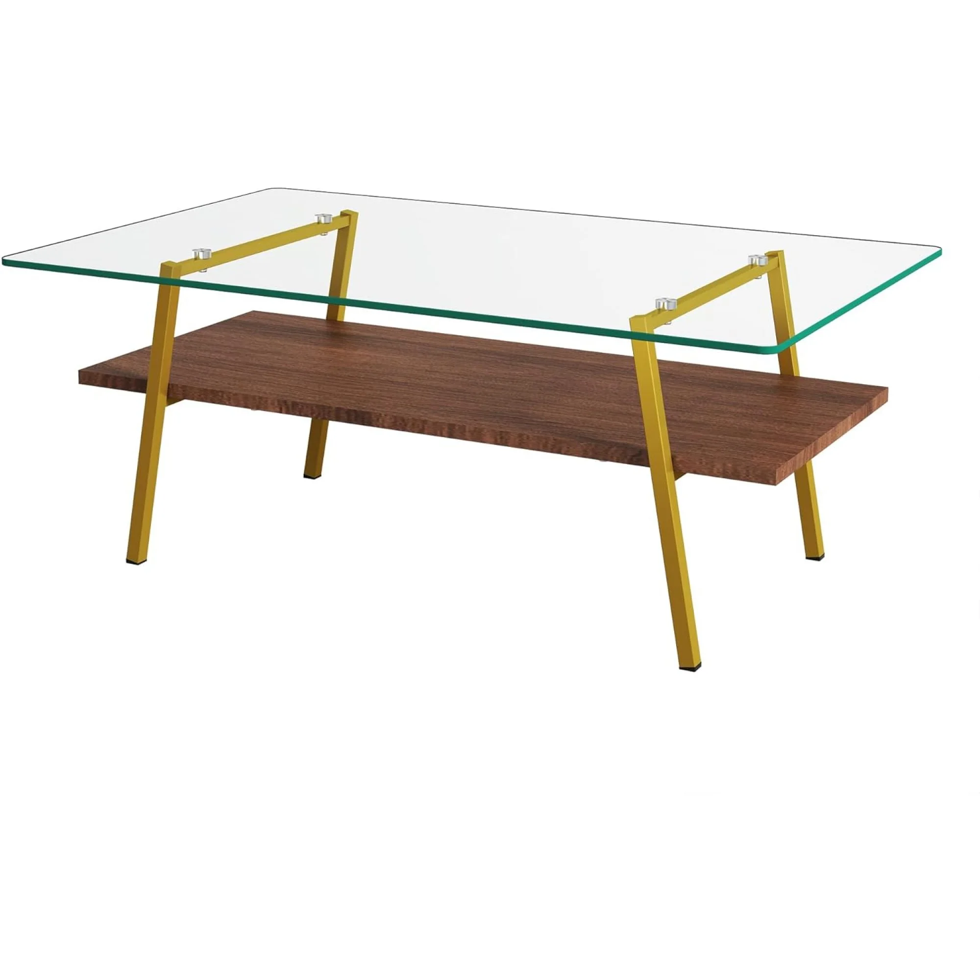 BJSN Glass Coffee Table for Living Room Small Gold Mid Century Coffee Table for Living Room with Wood Shelves (Black Frame, Transparent Glass Brown Wood)