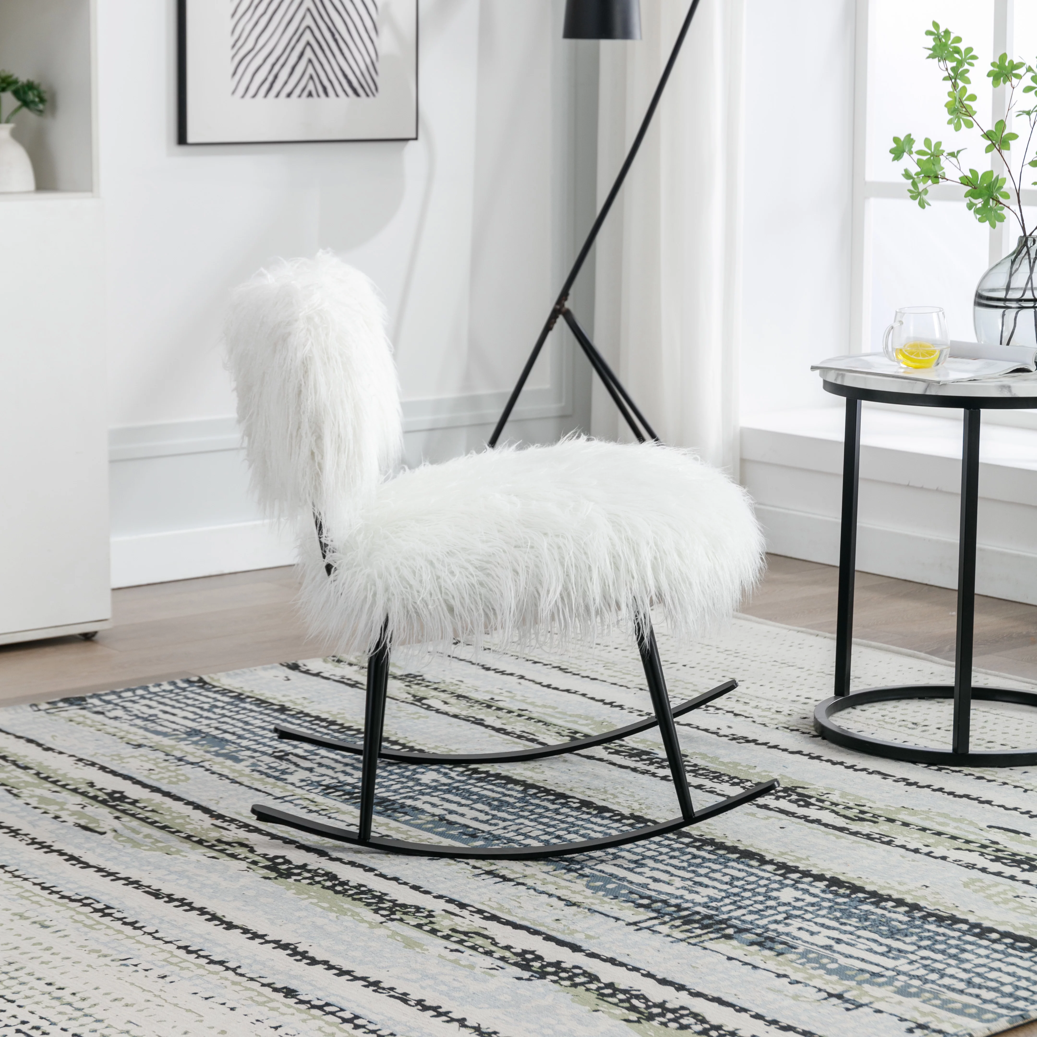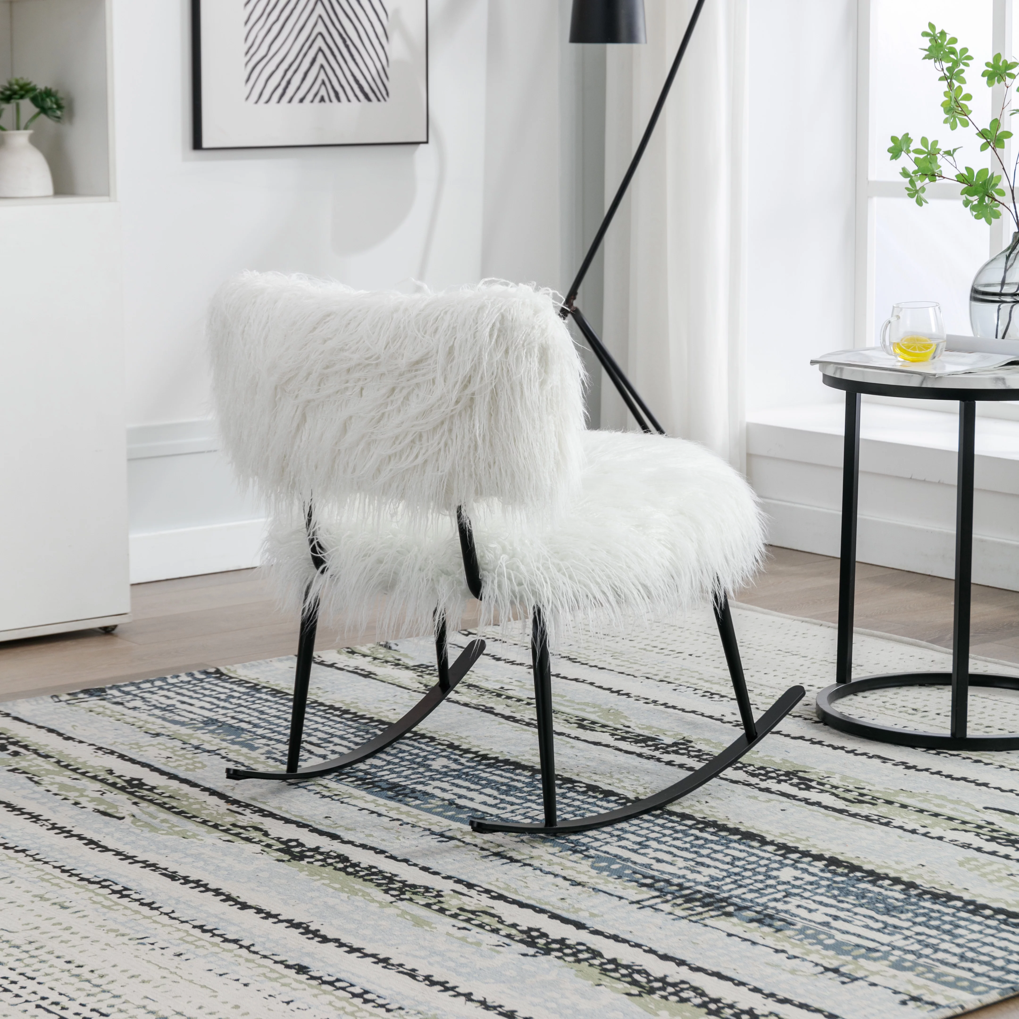 paproos 25.2'' Wide Faux Fur Plush Nursery Rocking Chair, Baby Nursing Chair with Metal Rocker, Fluffy Upholstered Glider Chair, Comfy Mid Century Modern Chair for Living Room, Bedroom, White