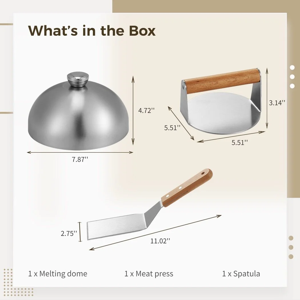 3Pcs Griddle Accessories Set, includes Steak Cover, Meat Press, Spatula, Stainless Steel Melting Dome & Grill Press Kit with Turner for Blackstone & Camp Chef Griddle