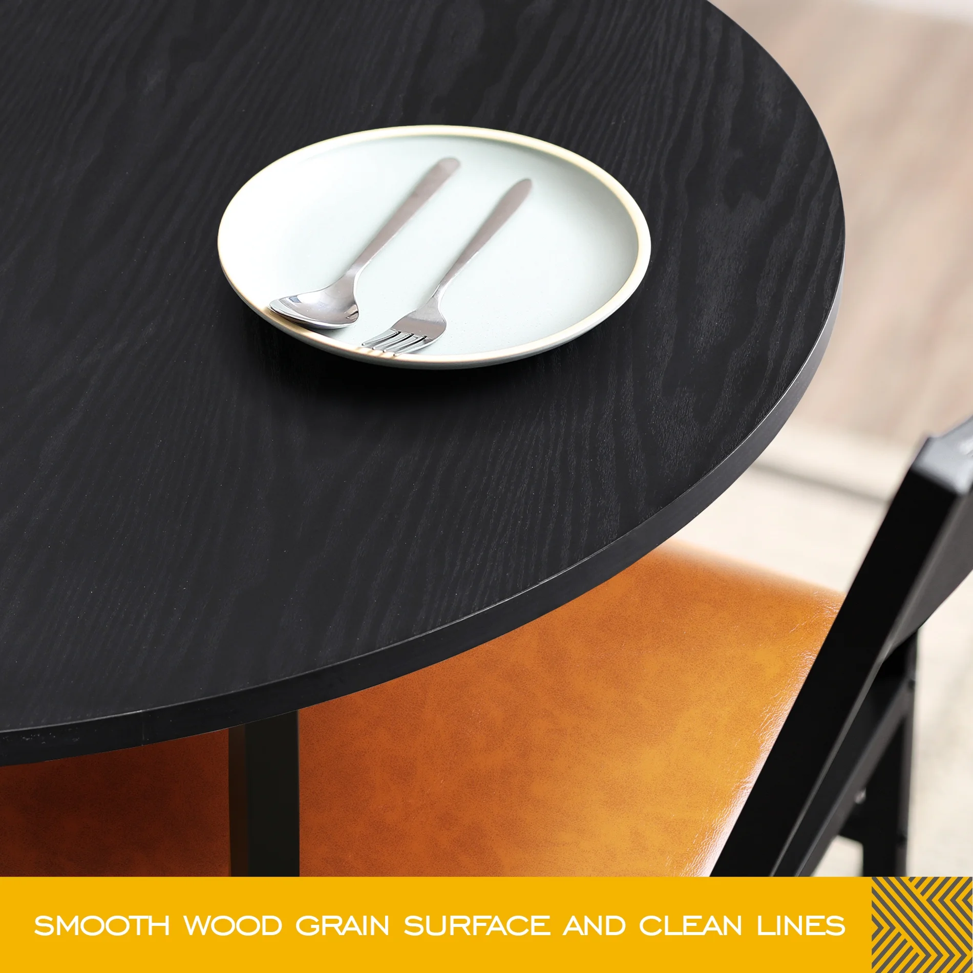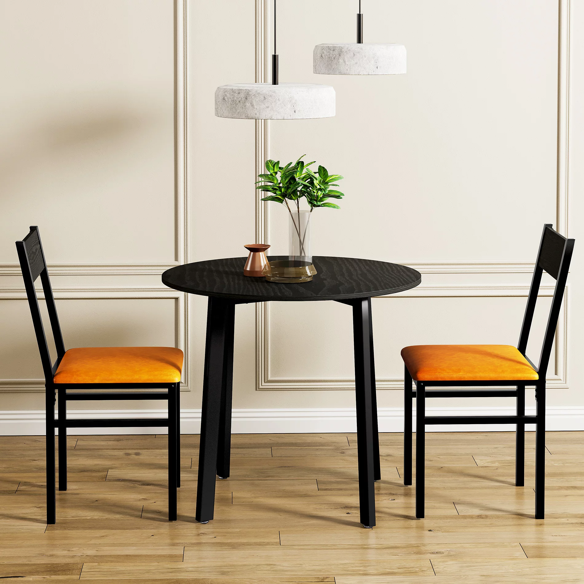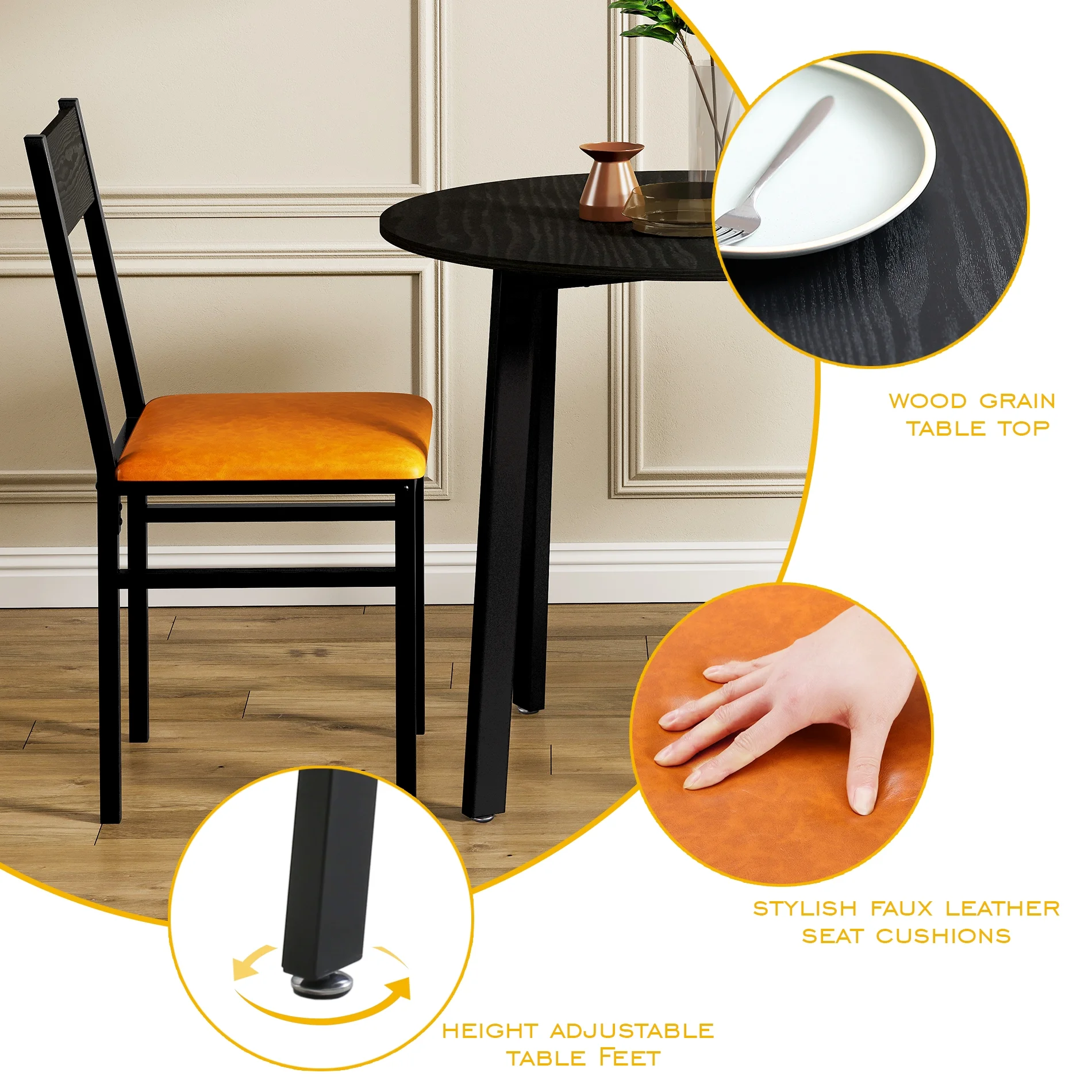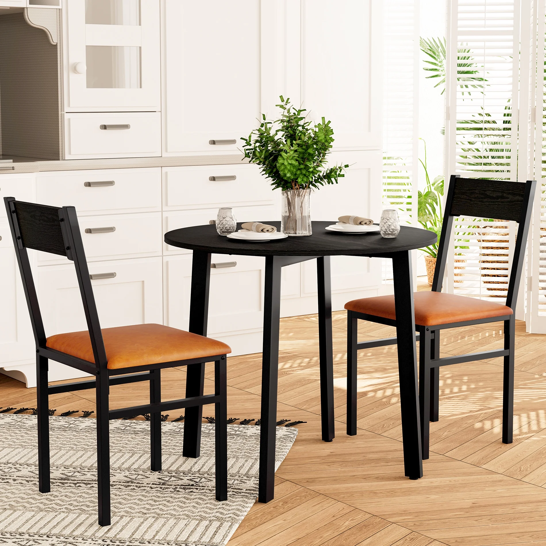 3 Piece Round Dining Table Set with 2 Cushioned Chairs, Small Kitchen Table Set for 2, Black & Brown