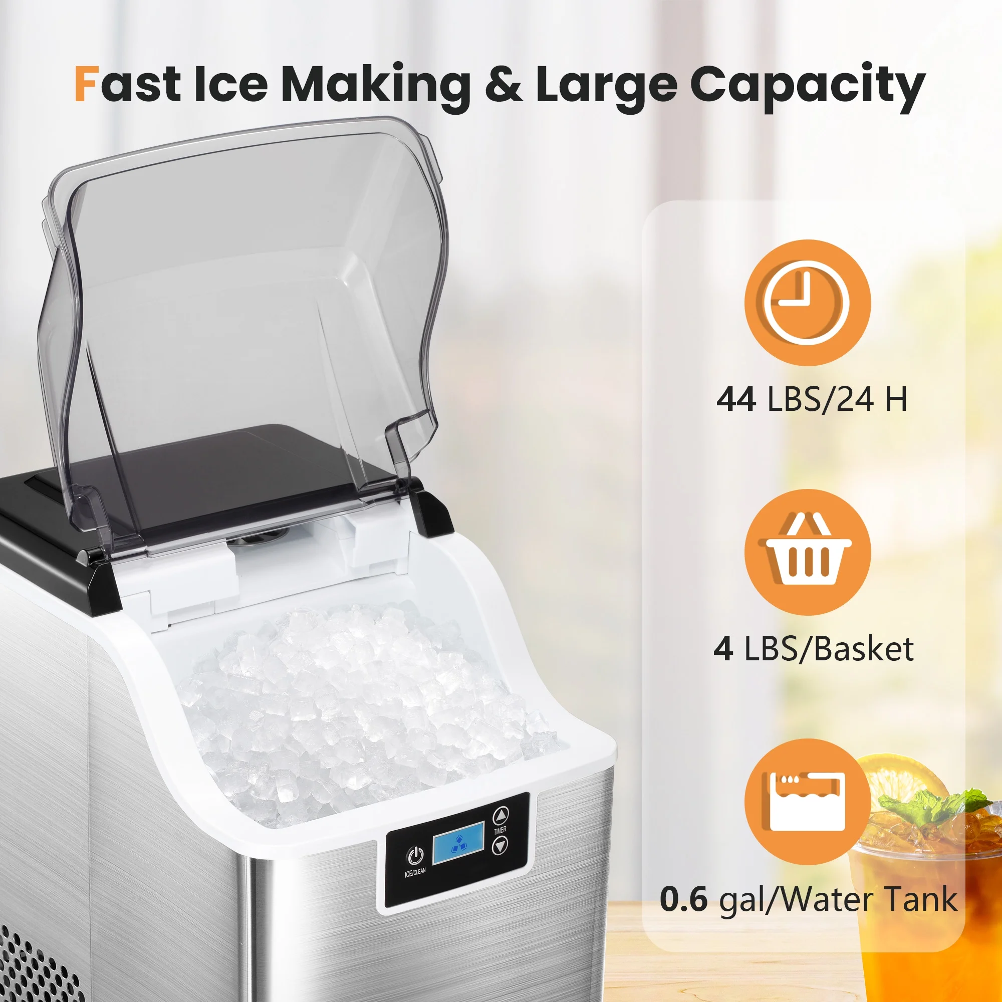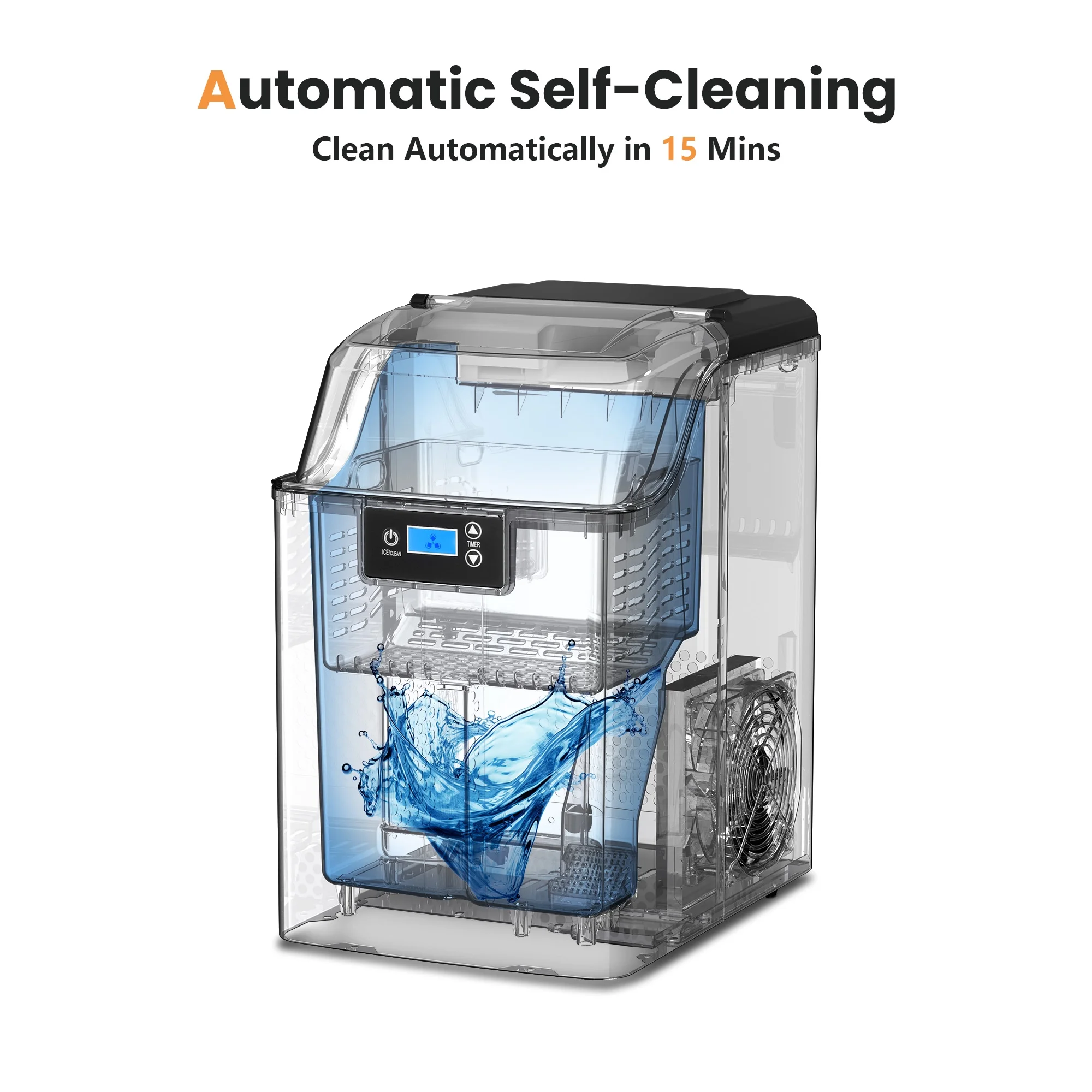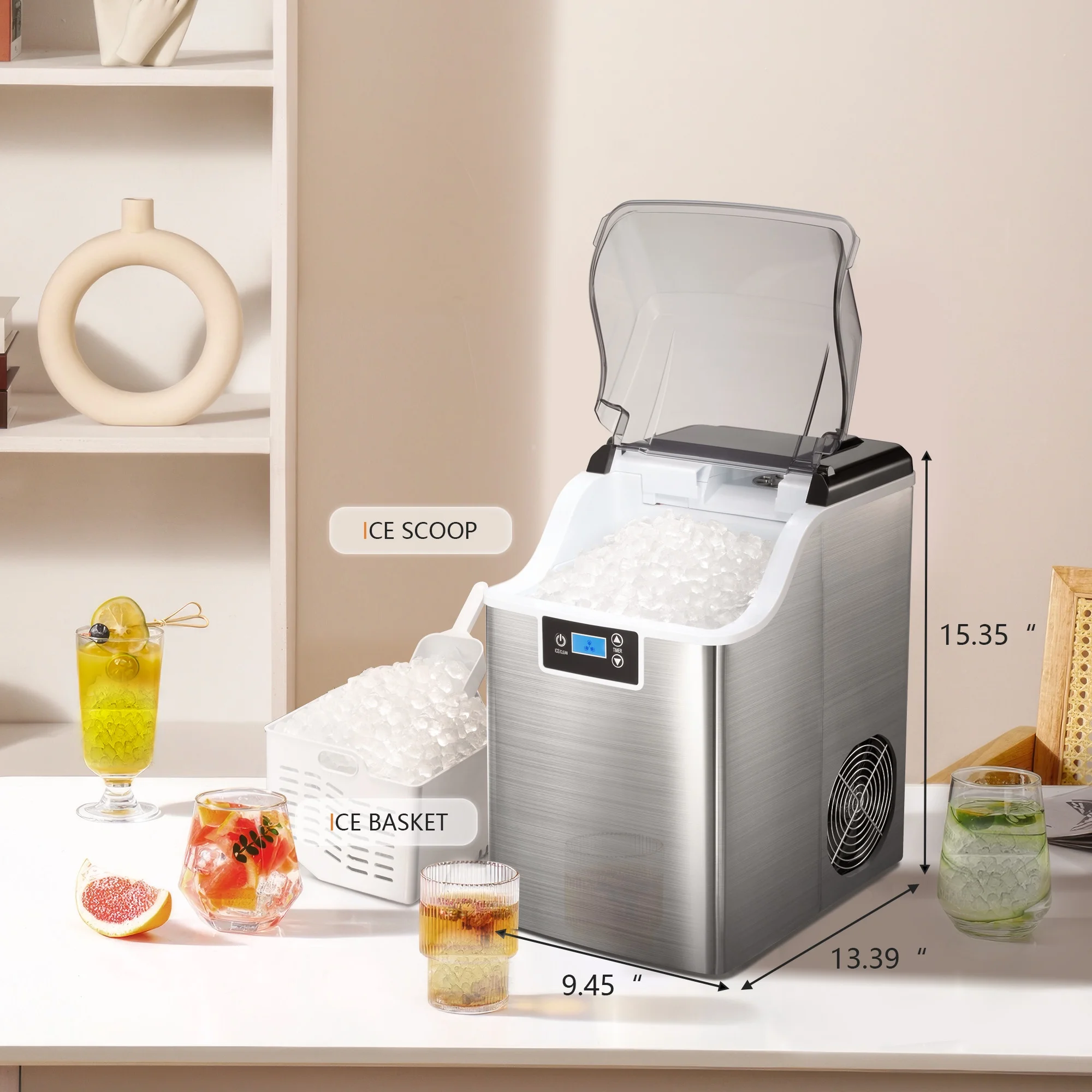 Besttey Countertop Ice Maker, Nugget Chewable Soft Ice, 44 lbs/24 H, Auto-Cleaning, Portable/Compact, w/ Basket & Scoop, Silver