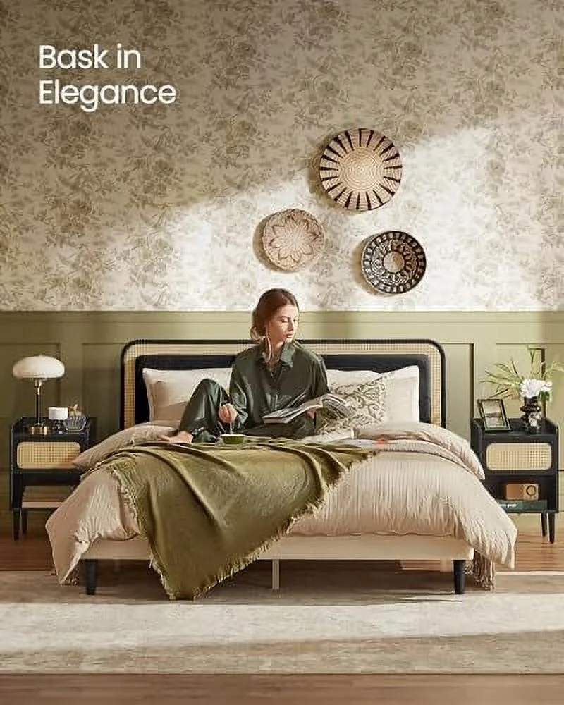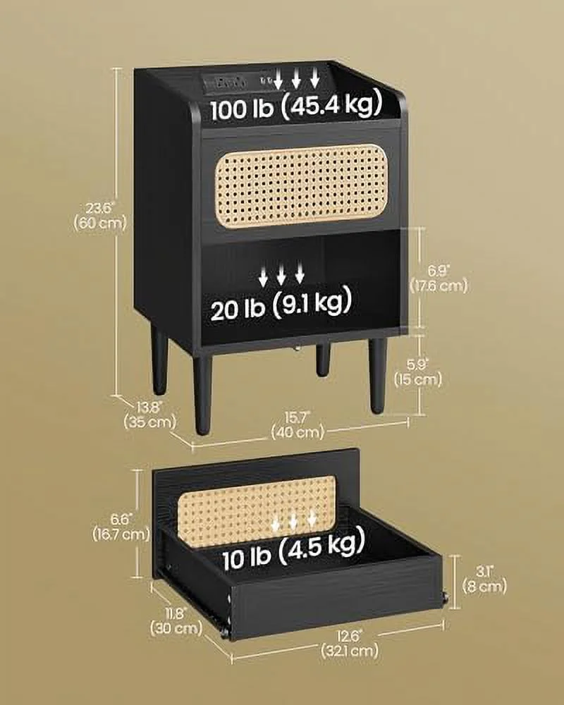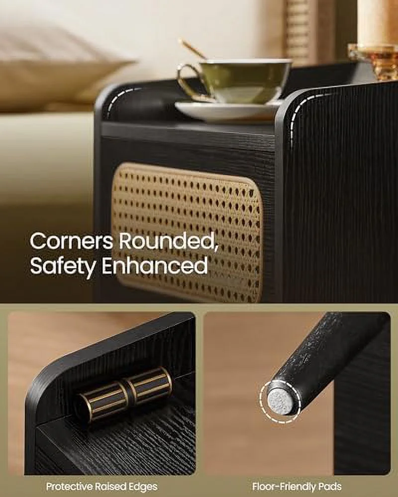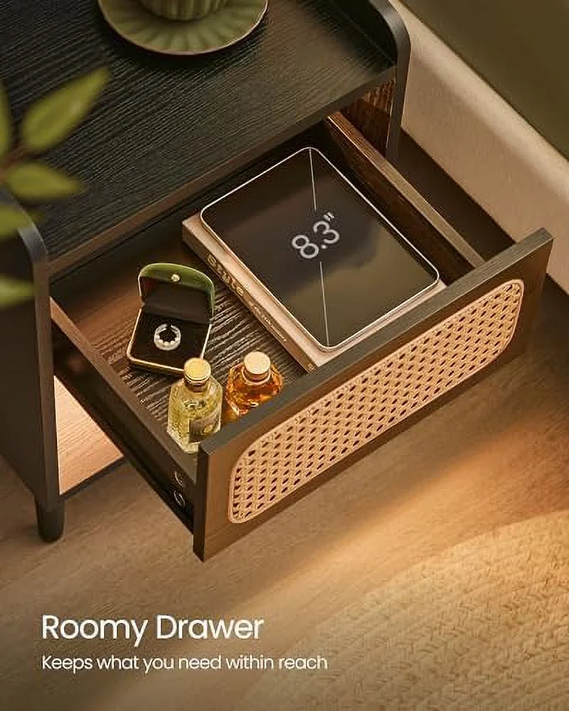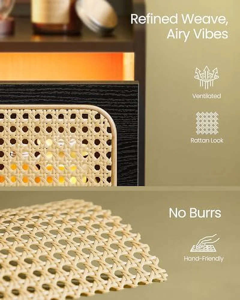 RUNFAYBIU BOHOVEN Collection - Nightstands with Charging Station Bedside Tables with Motion Sensor Lights Rattan-Like Side End Tables Solid Wood Legs for Bedroom Style Oak Beige