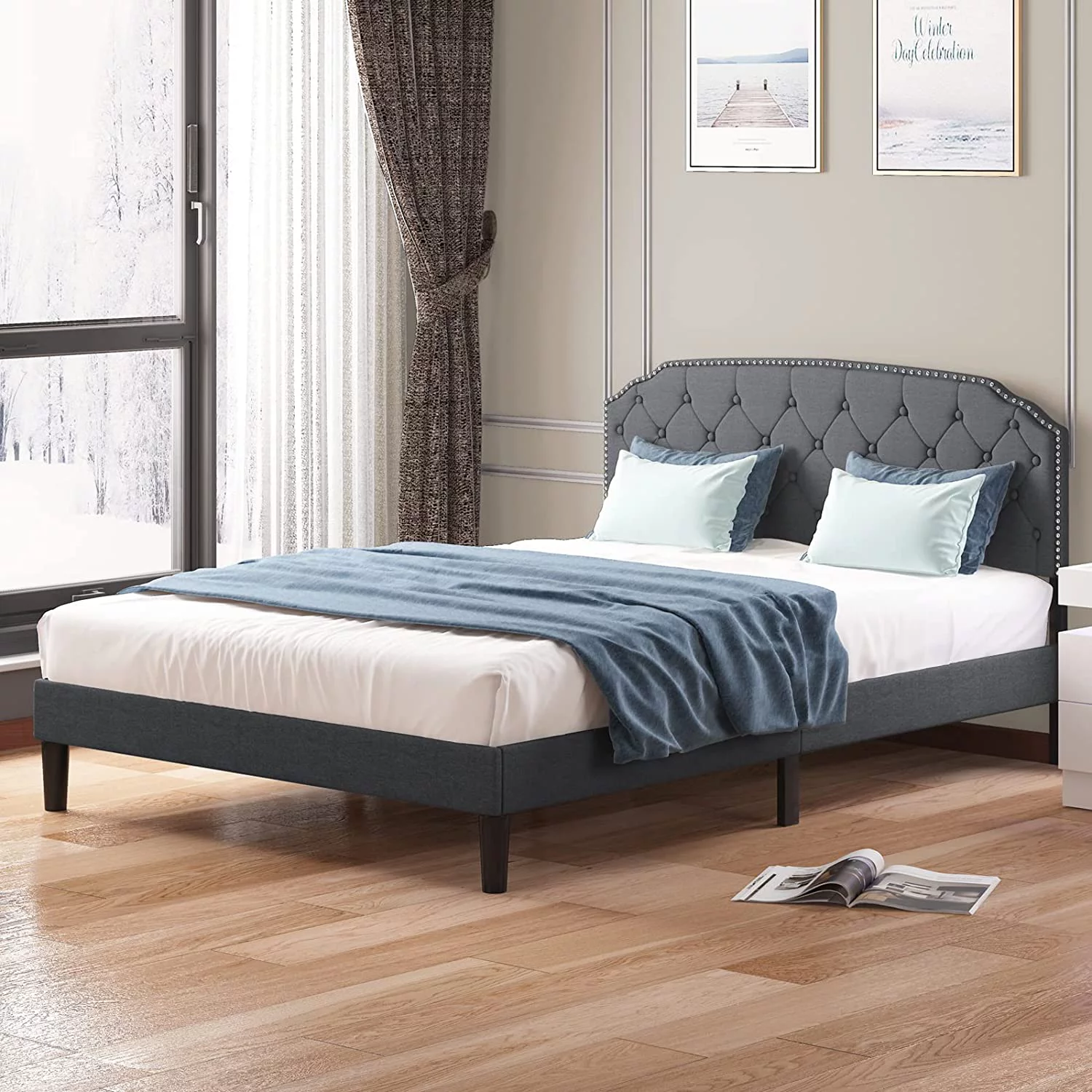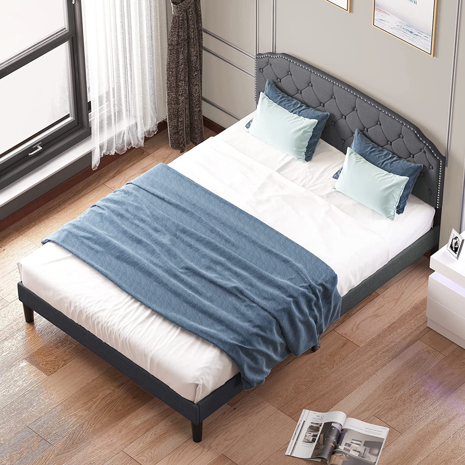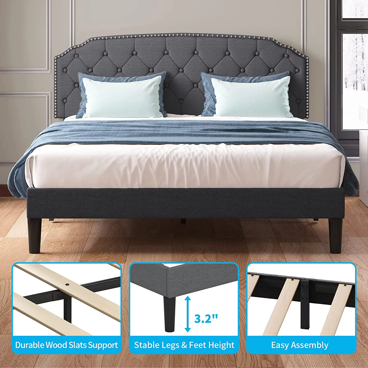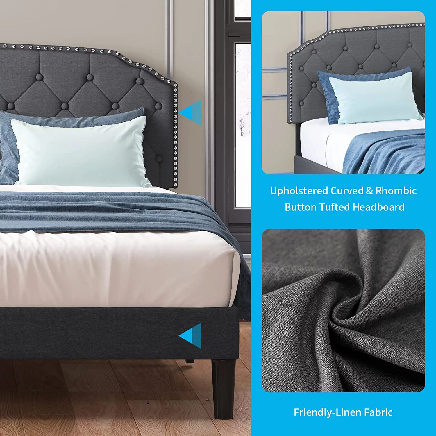 Mjkone Queen Size Platform Bed Frame with Diamond Button Tufted Upholstered Headboard,Stylish Modern Soft Bed Frame with Sturdy Wood Slat Support, No Box Spring Needed,Easy Assembly,Dark Grey