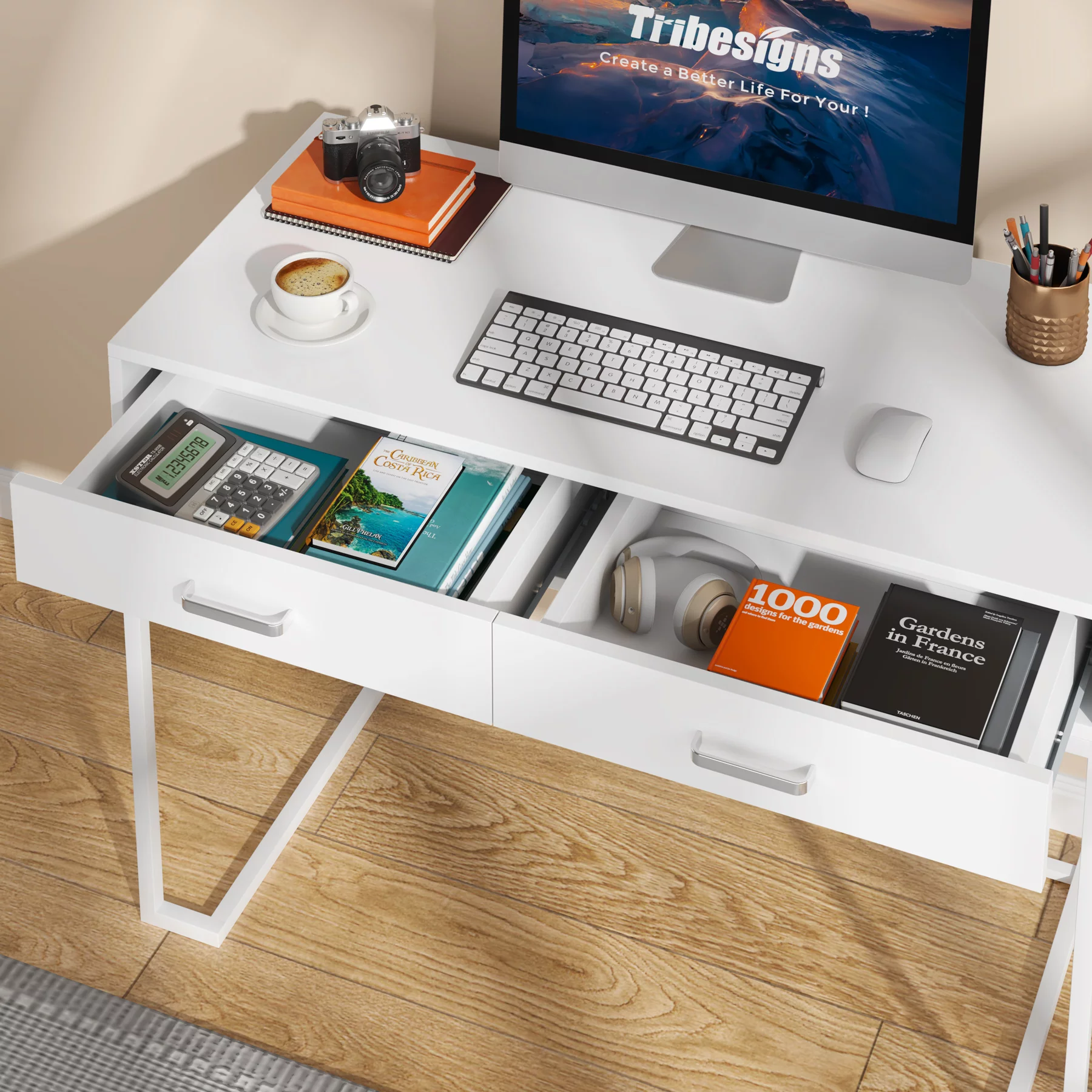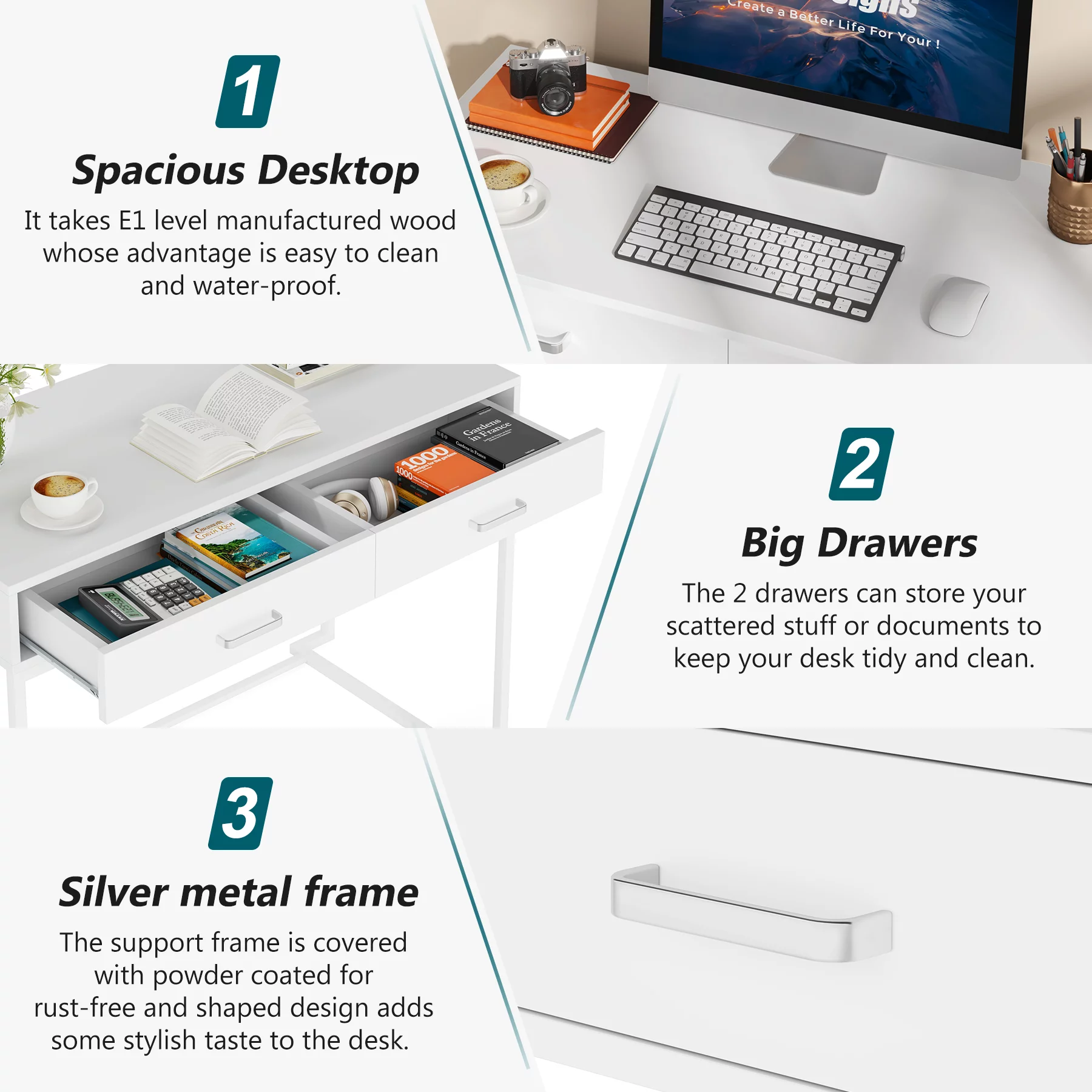 Computer Desk, Home Office Desk Writing Desk Workstation with 2 Storage Drawers, Simple and Modern Vanity Table, Rectangular, White