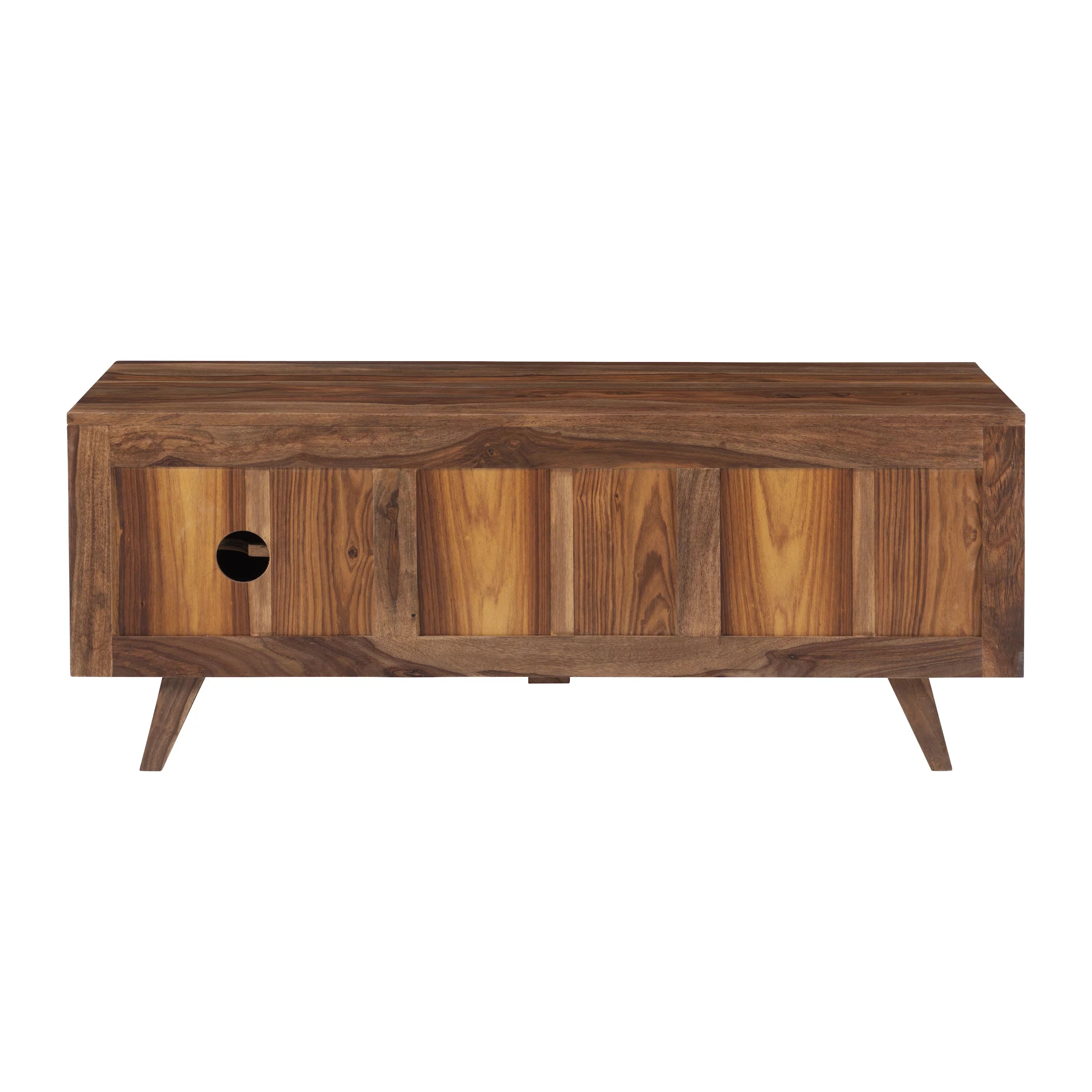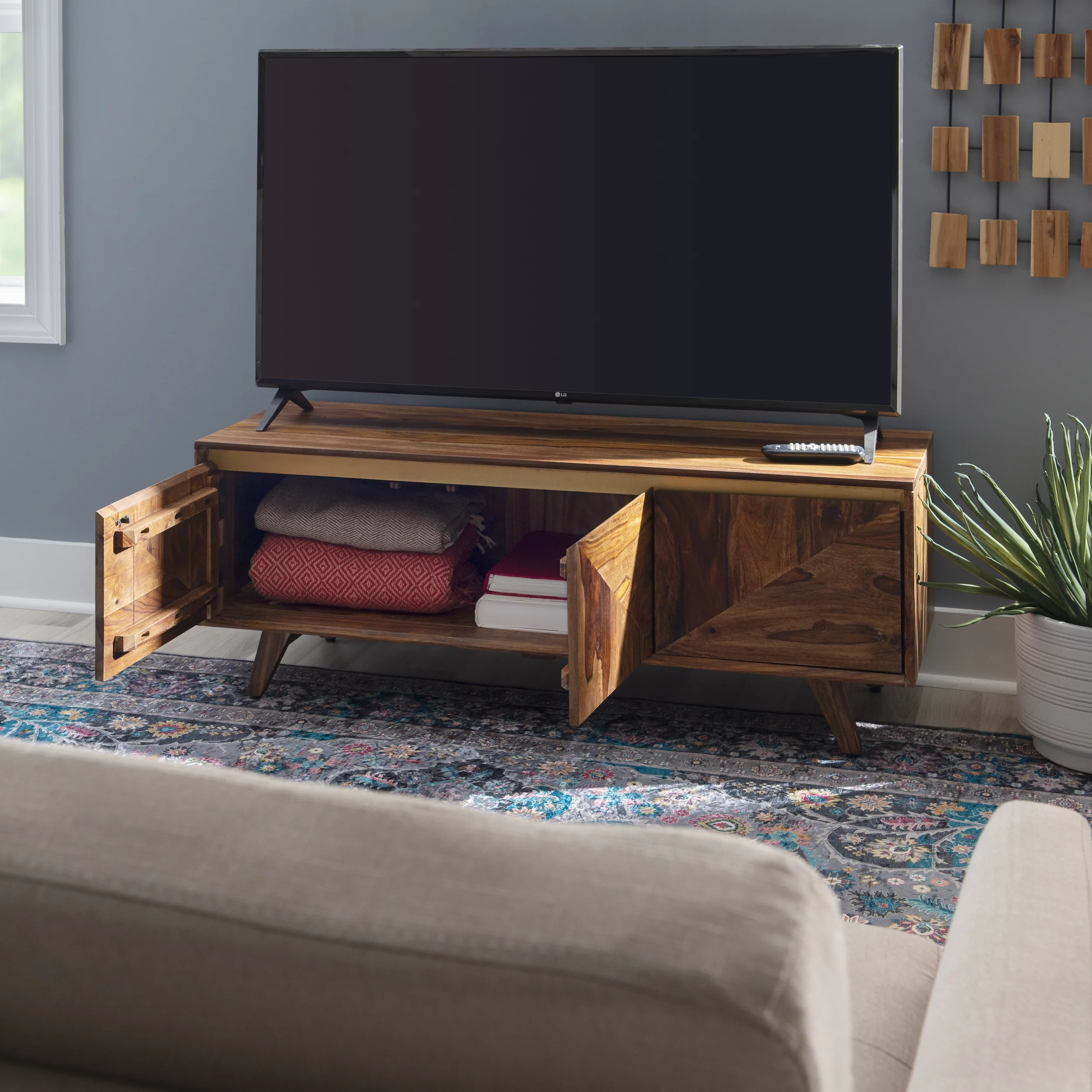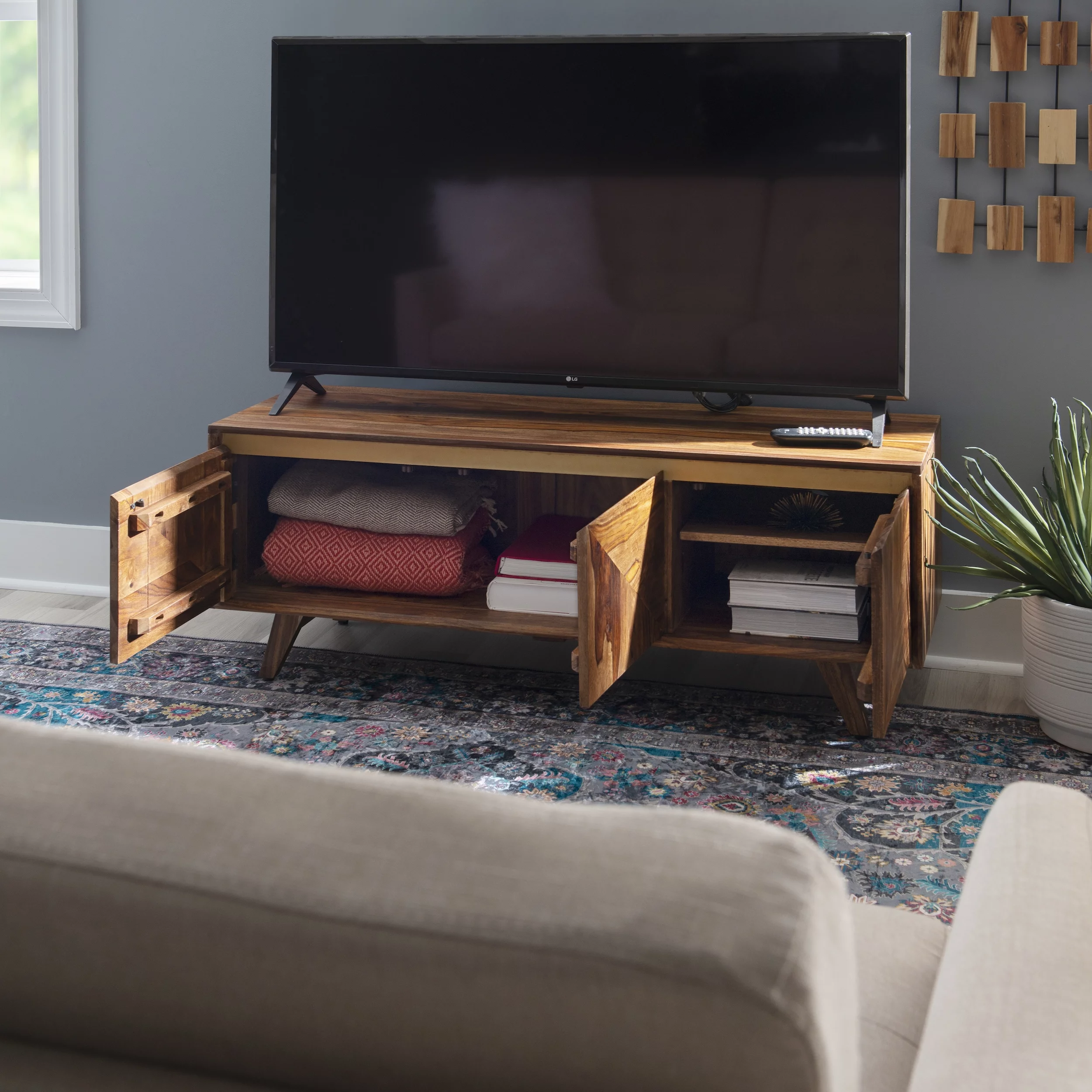Powell Graycrest Mid-Century Modern 3-Door Wood Indoor Console Table with Shelves, Brown