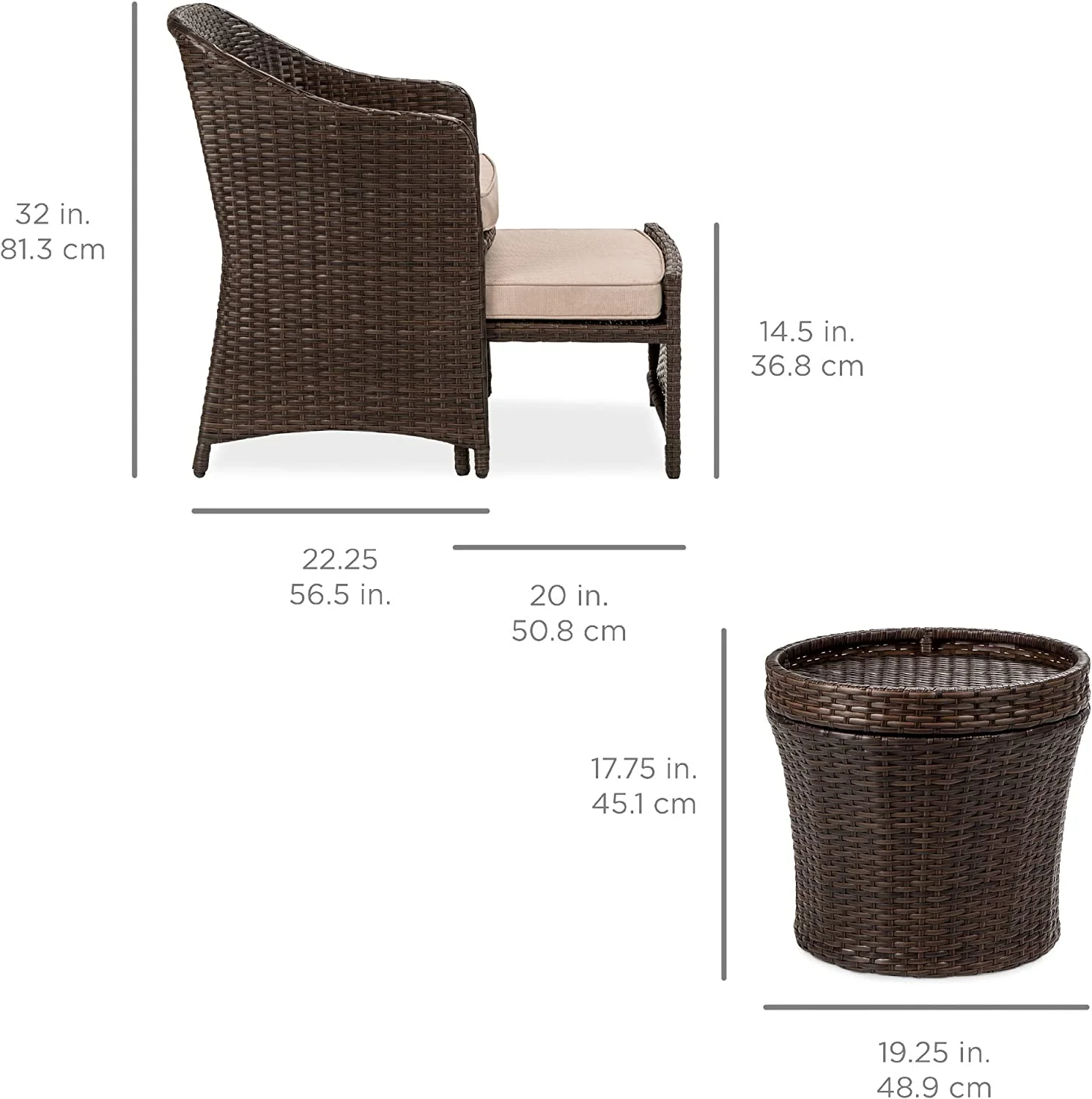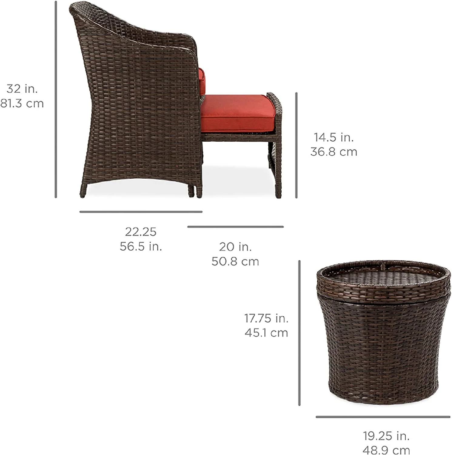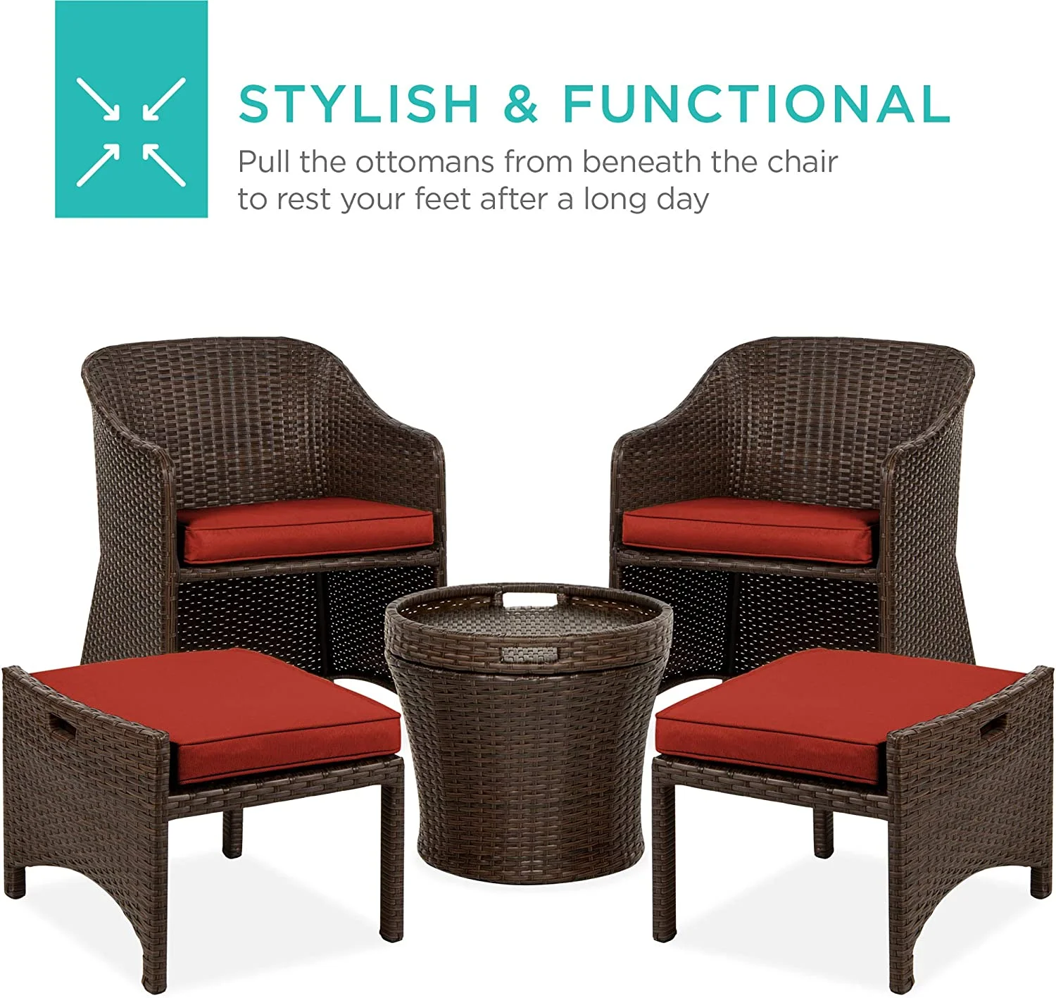 5-Piece Outdoor Patio Furniture Set, No Assembly Required Wicker Conversation Bistro & Storage Table for Backyard, Porch, Balcony w/Space-Saving Design - Brown/Red
