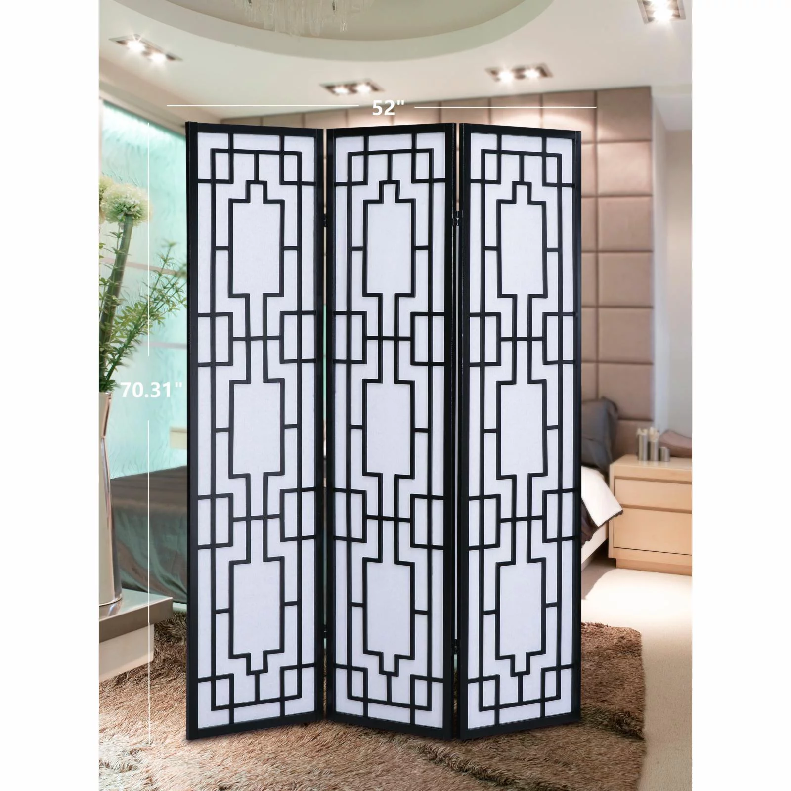 Roundhill Furniture Sudoku Paper and Wood 3-Panel Room Divider Screen in Black
