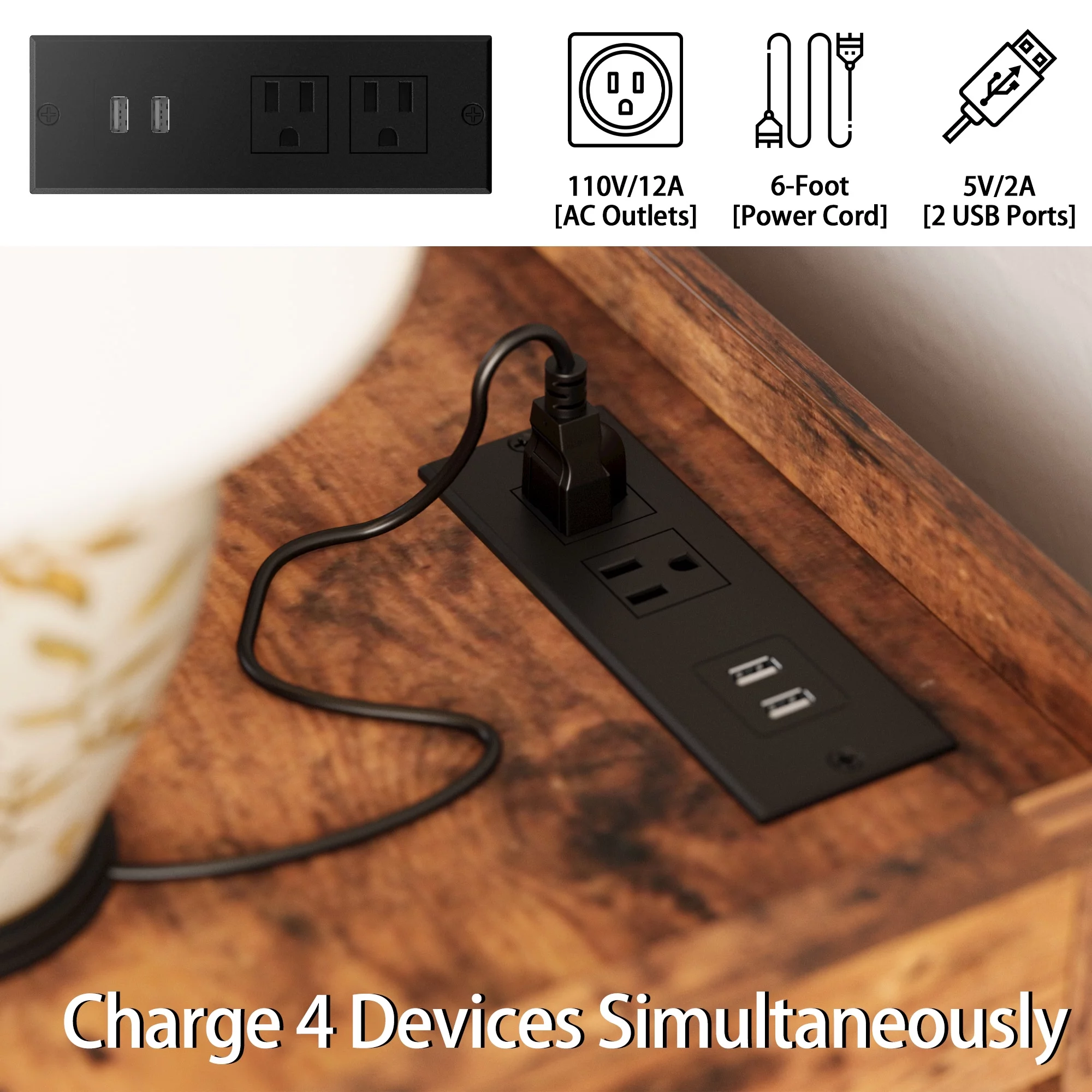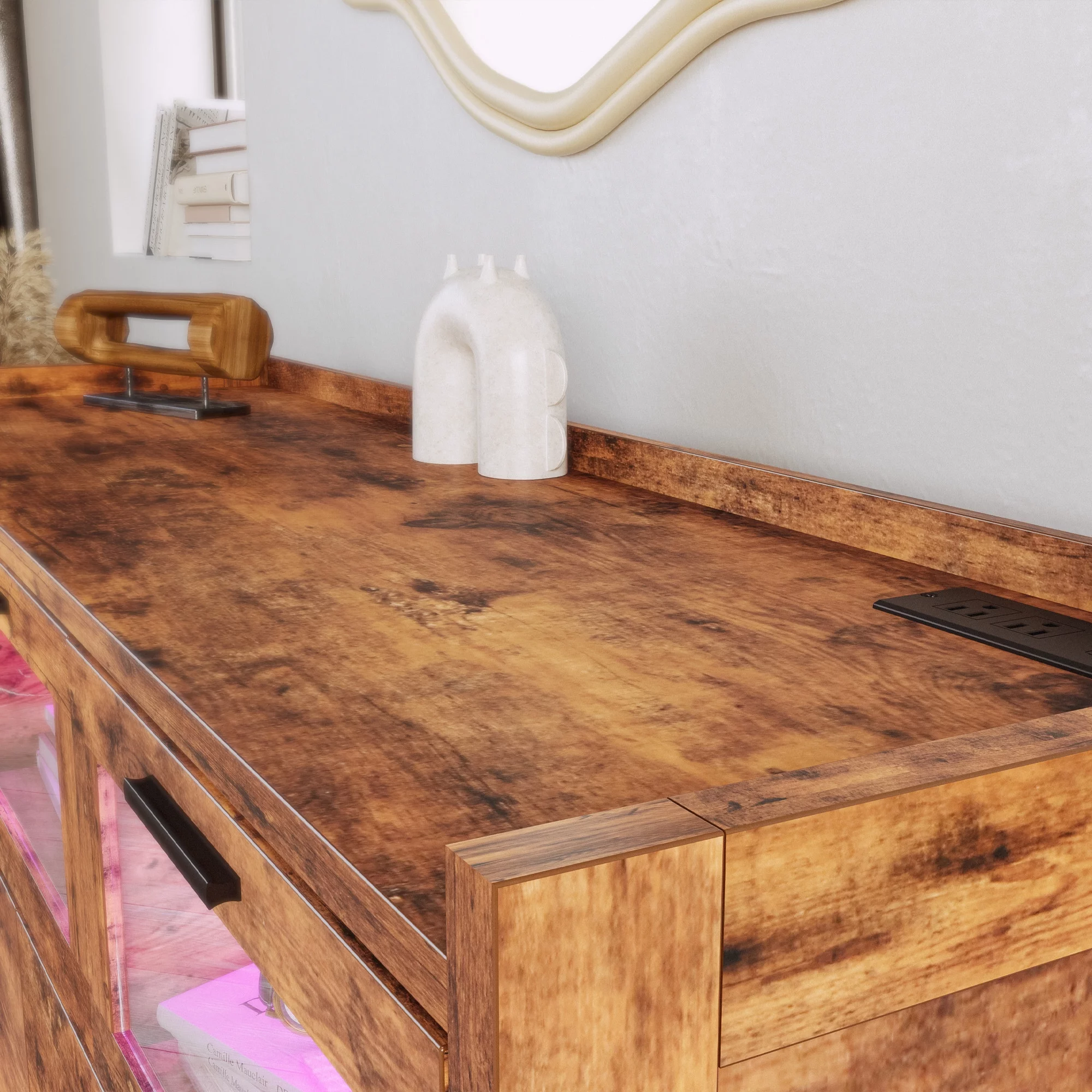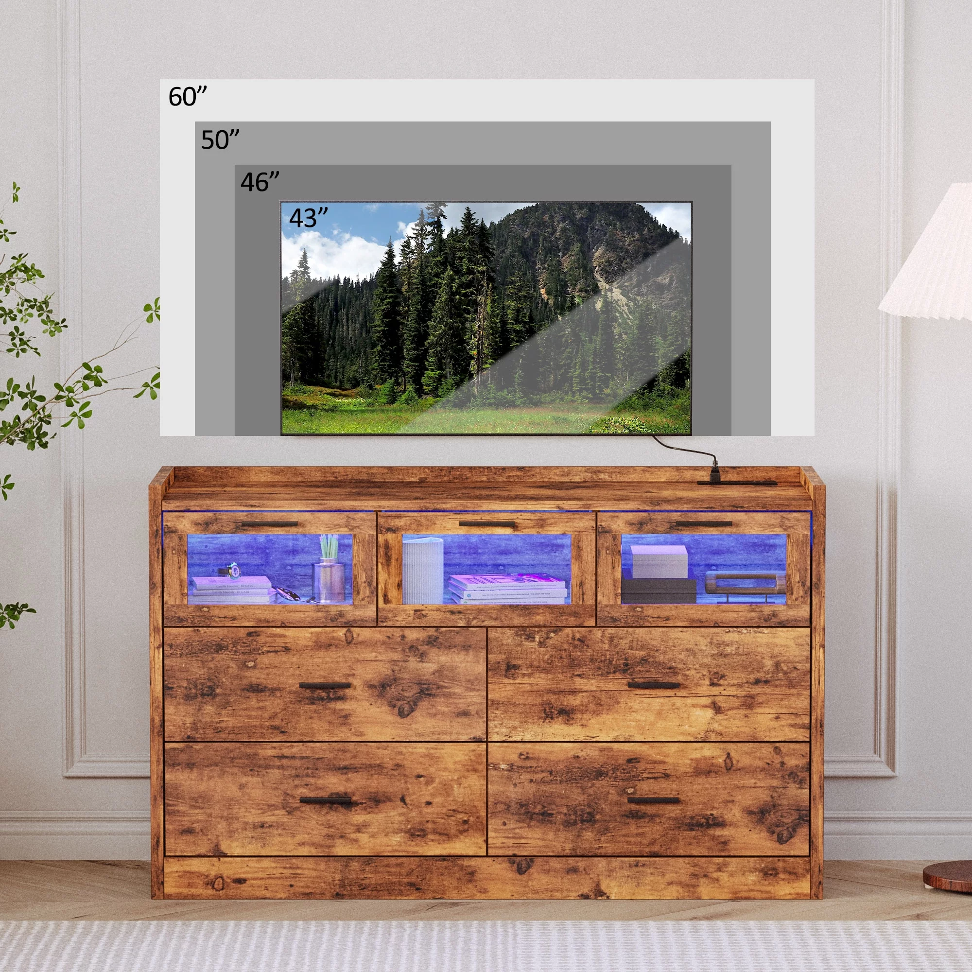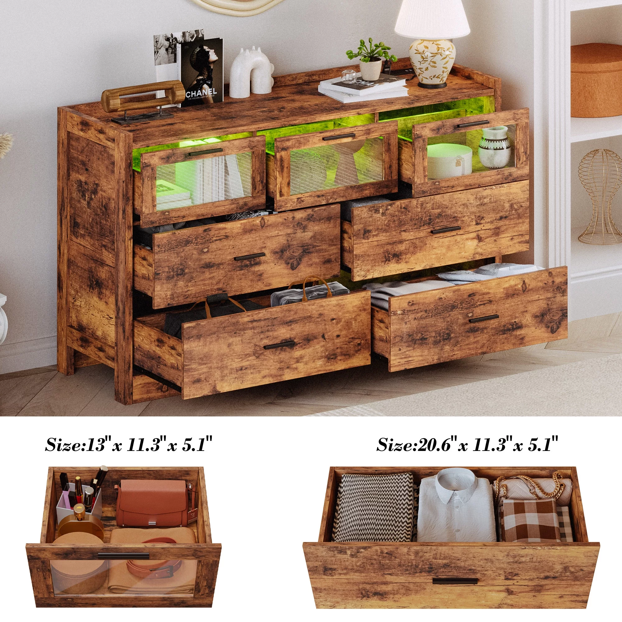 LIKIMIO 7 Glass Drawers 47" Wood Dresser with LED/Power Strip/Adult, Brown,Metal, Station,Charging