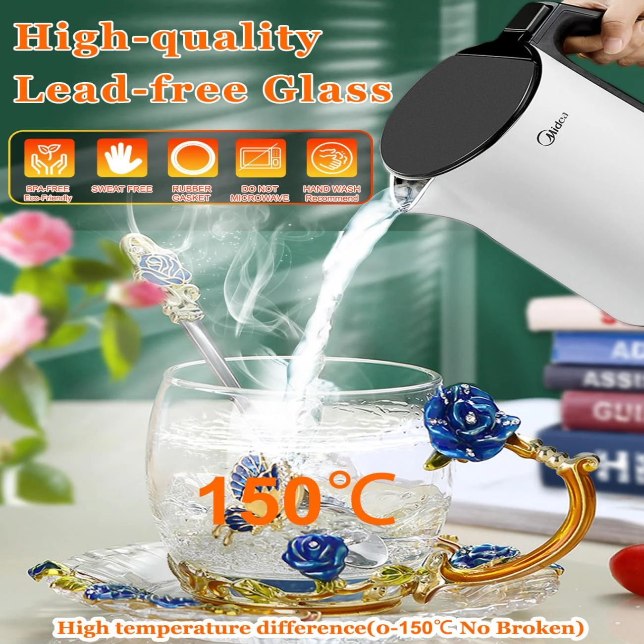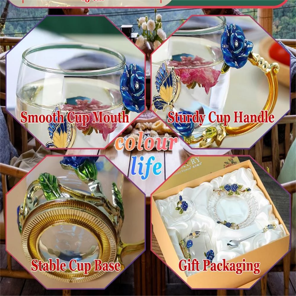 Glass Tea Cup Coffee Cup, Enamel Colored Handmade 3d Vintage Flower Cup with Lid, Coaster and Spoon, Unique Blue Rose Enamel Design, Heat-Resistant Tea Cup Crystal Glass Gift Set (320ml)