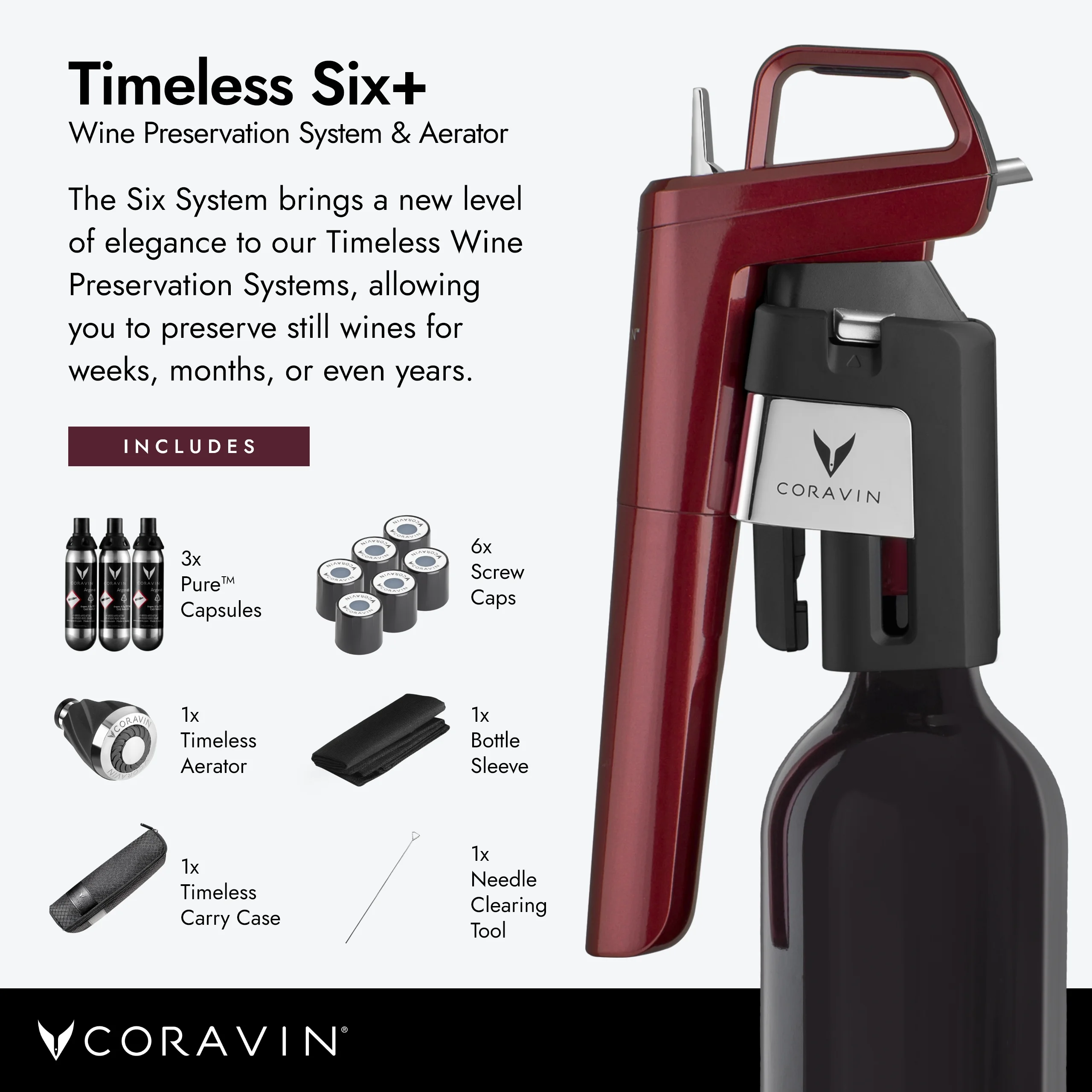 Coravin Timeless Six Plus Wine Preservation System - By-the-Glass Wine Saver - Wine Aerator, 3 Gas Capsules, 6 Screw Caps, Clearing Tool & Carry Case - White Wine, Red Wine & More - Burgundy