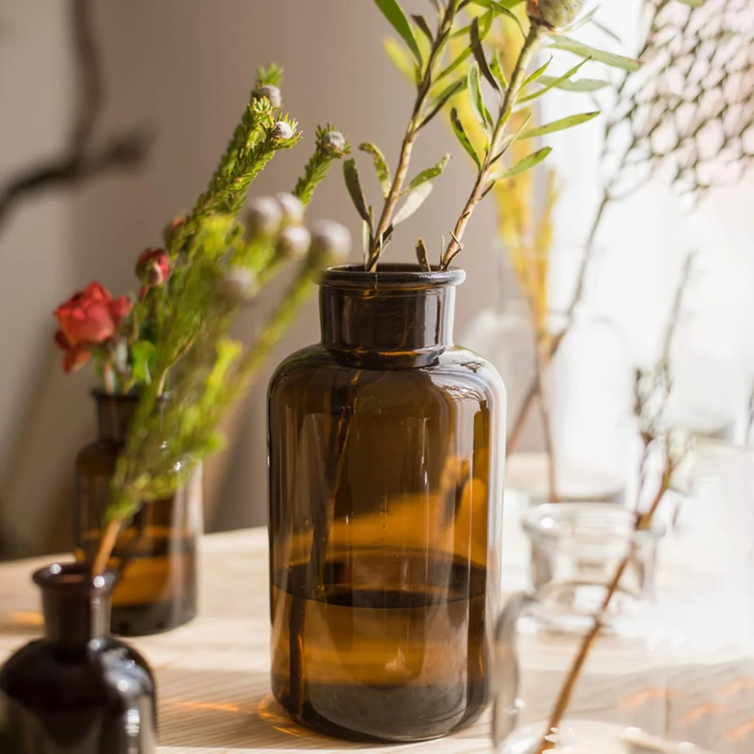 Set of 8 Amber Glass Vase, 17oz Boho Flower Vase Bud Vases Decorative Brown Medicine Glass Bottles Vintage Small Apothecary Jars for Home Décor, Dining Table, Wedding Centerpiece, Bridal Shower