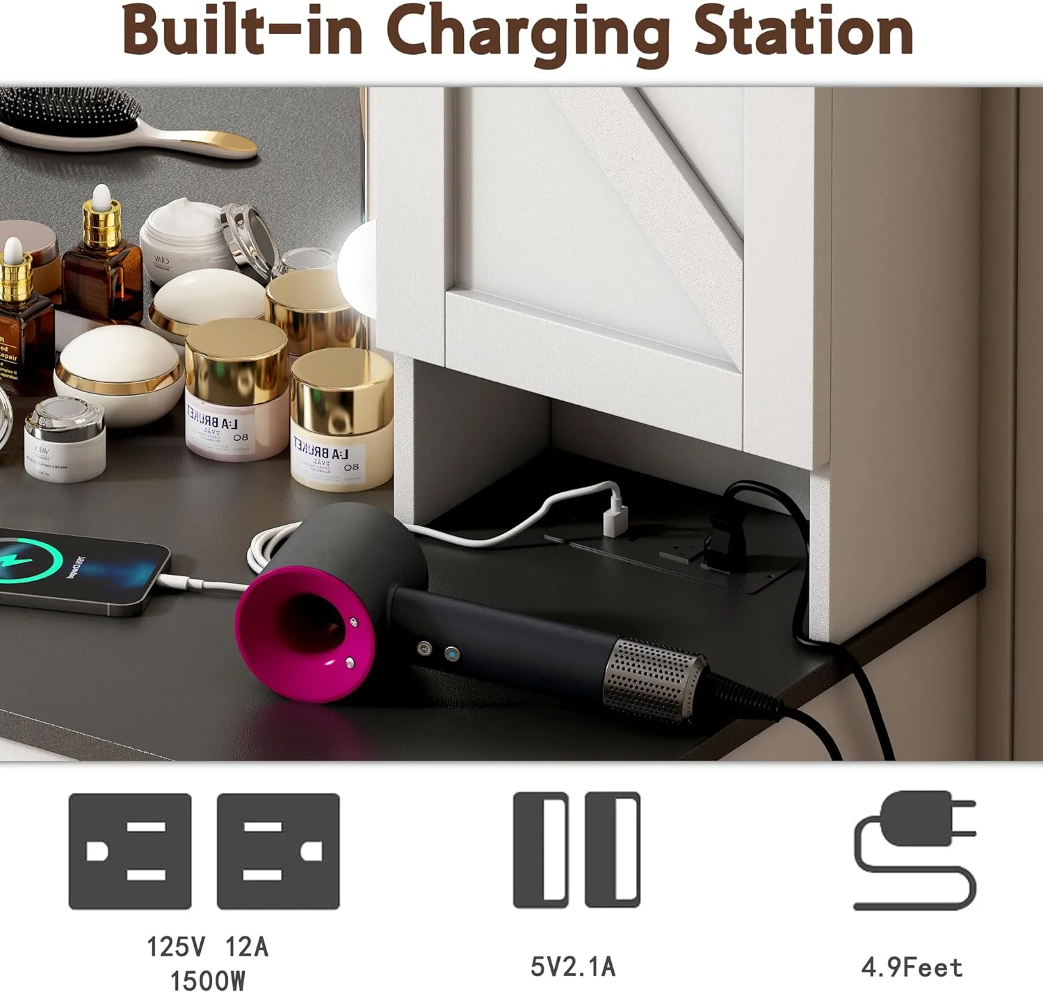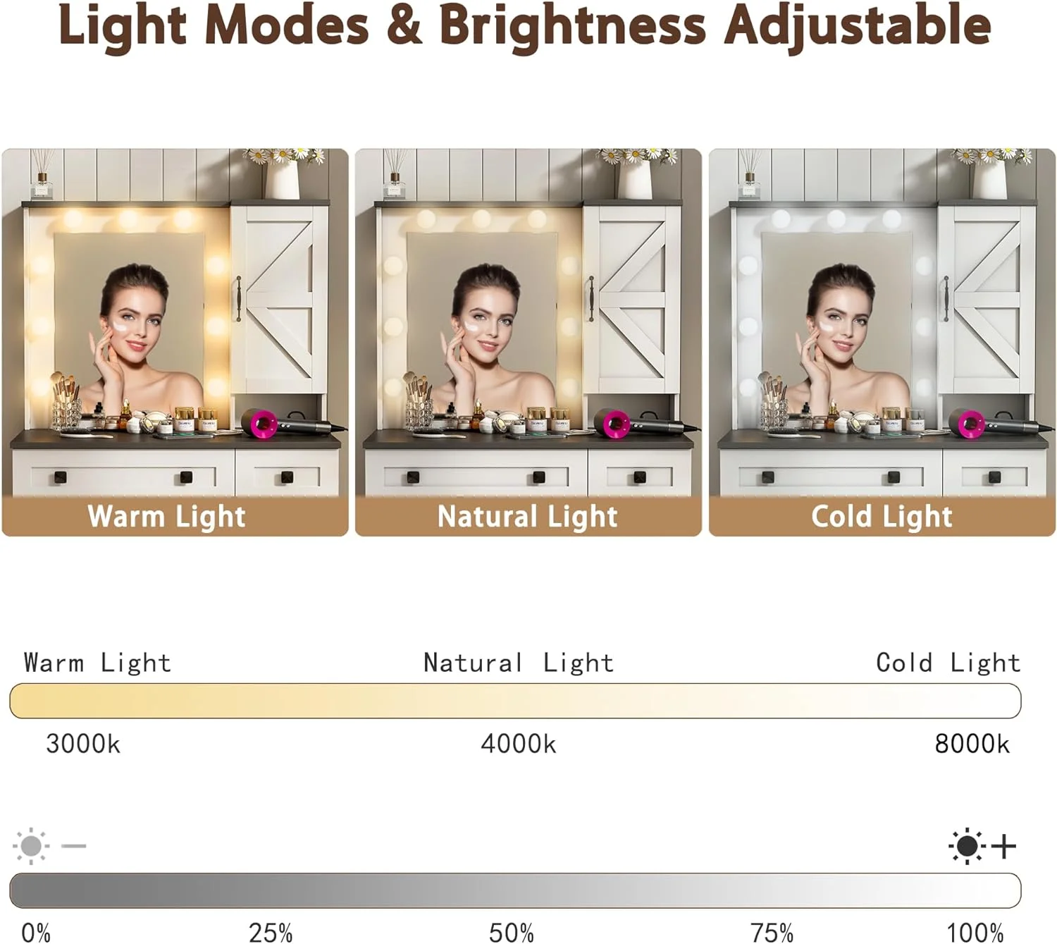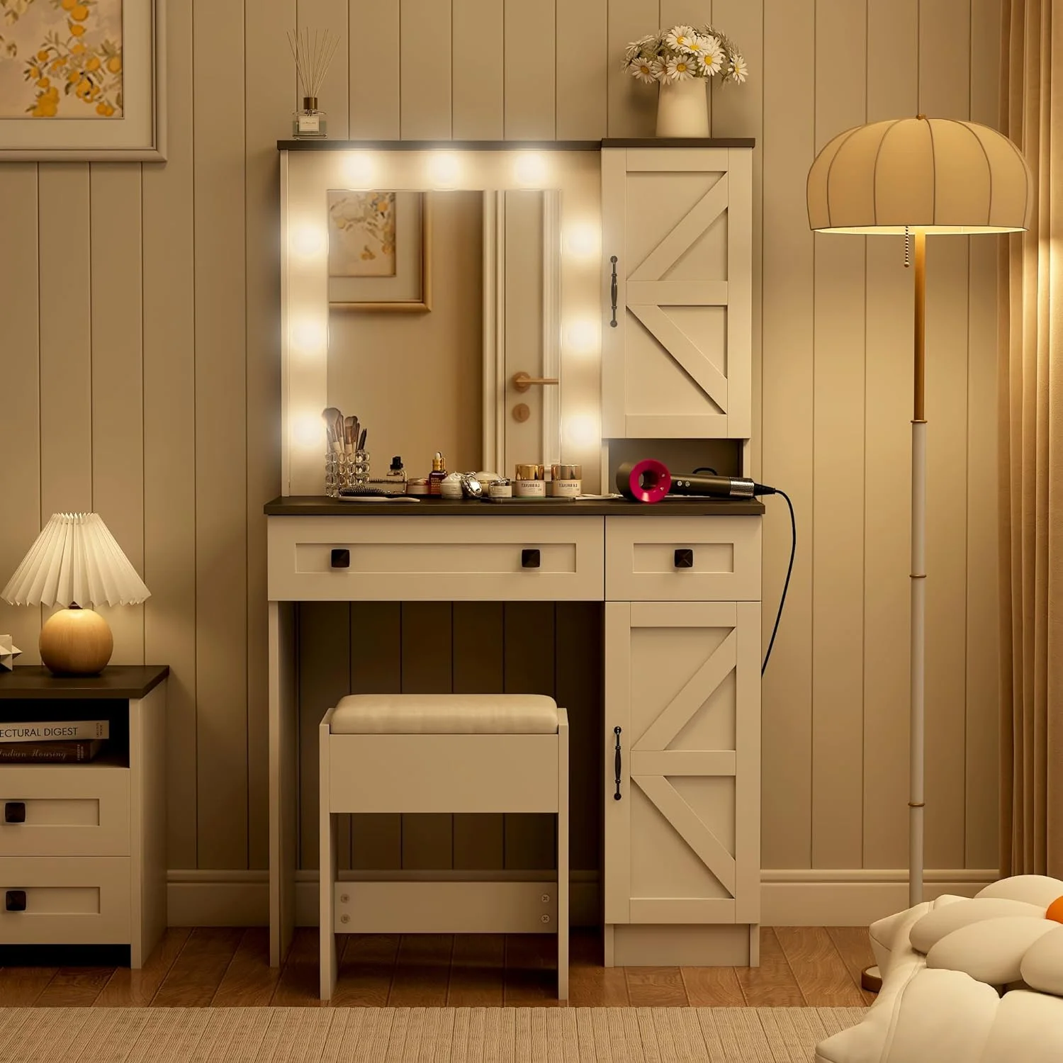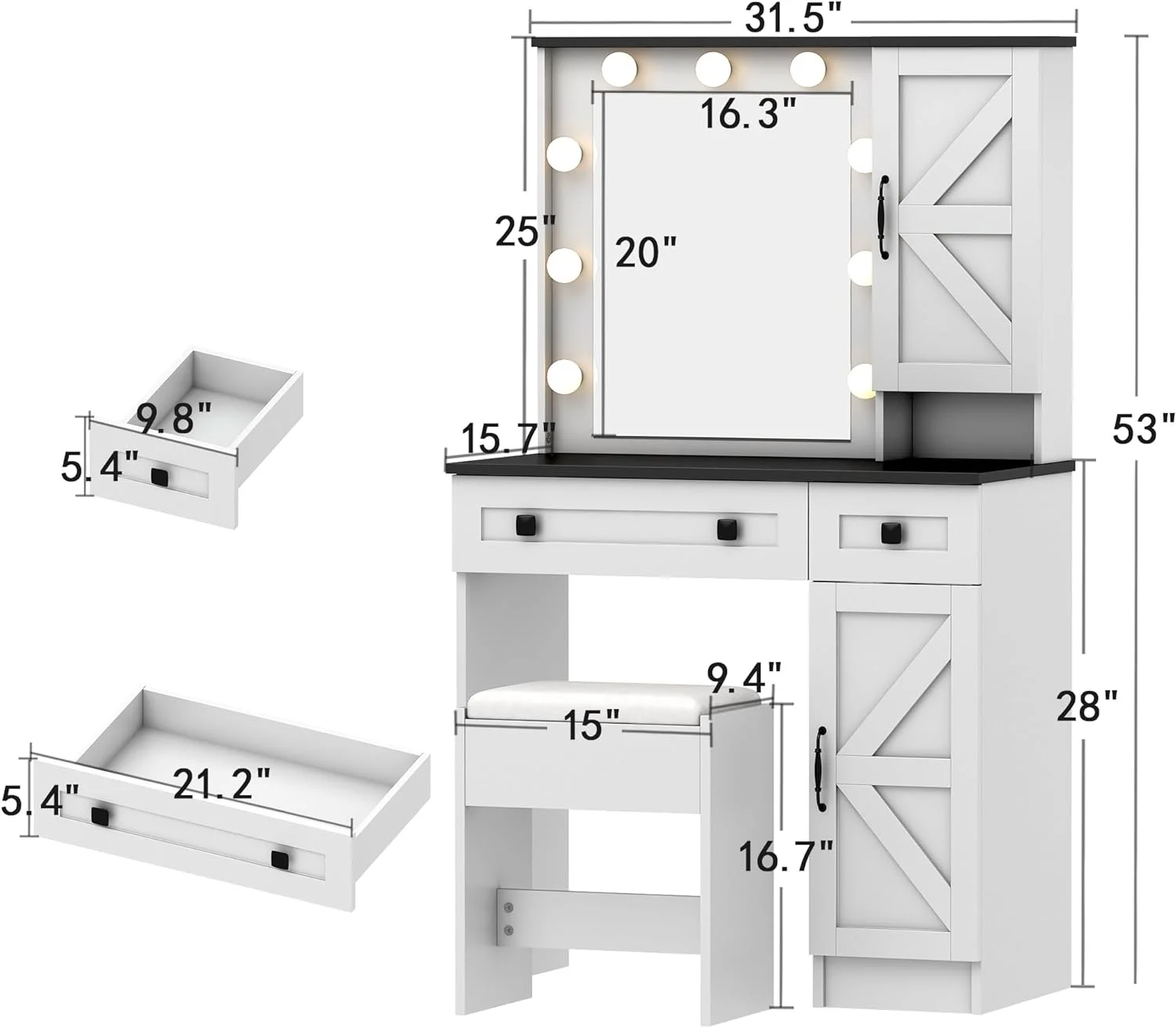 Wanan 31.5" Makeup Vanity Desk with Lights, Farmhouse Vanity Table and Bench Set with Power Outlet
