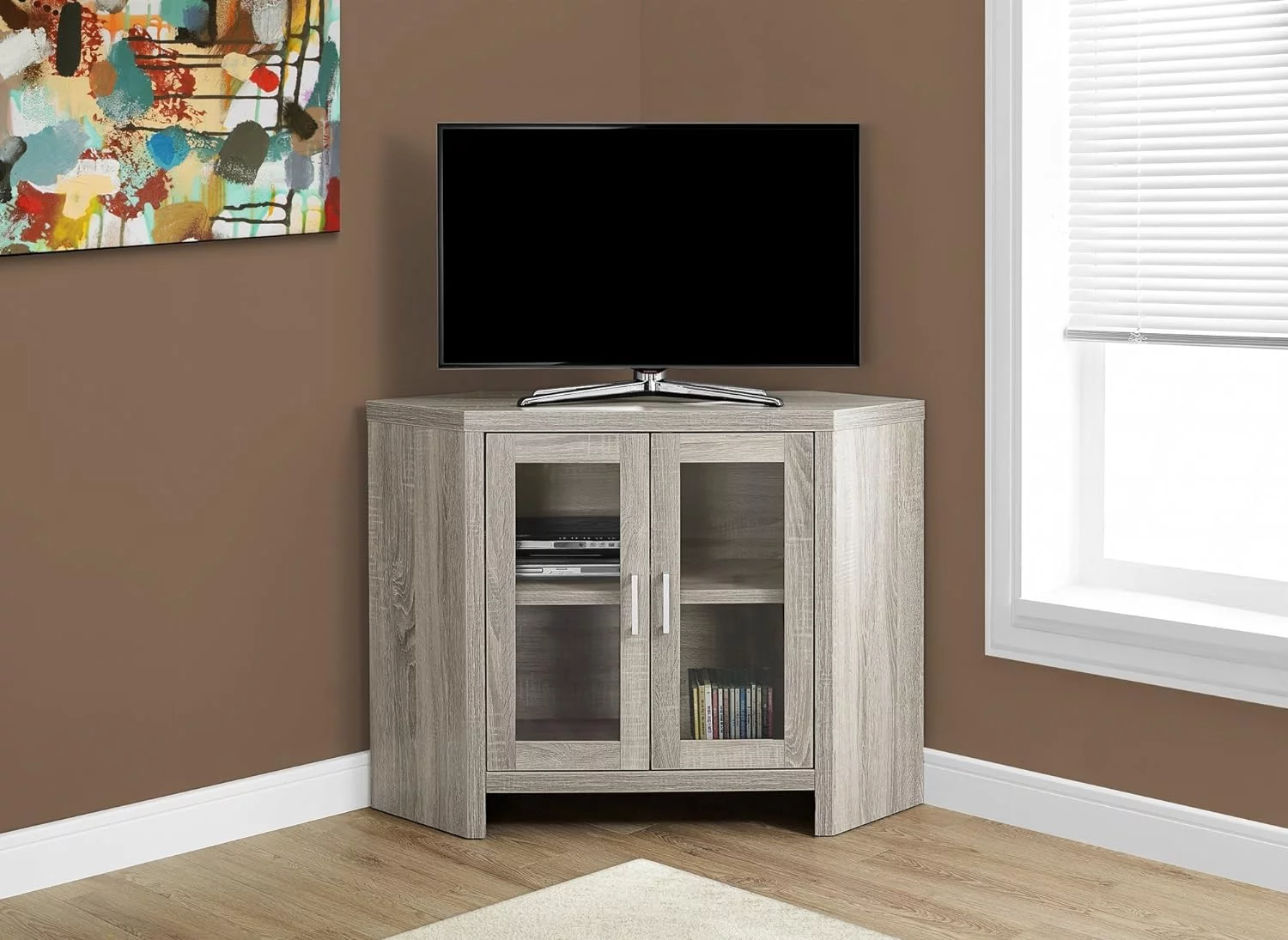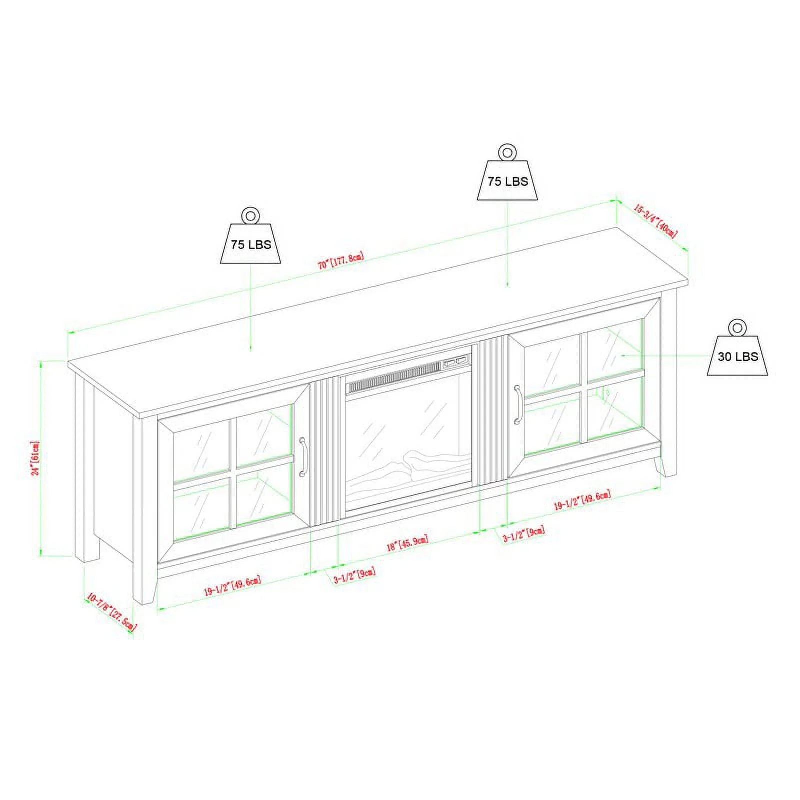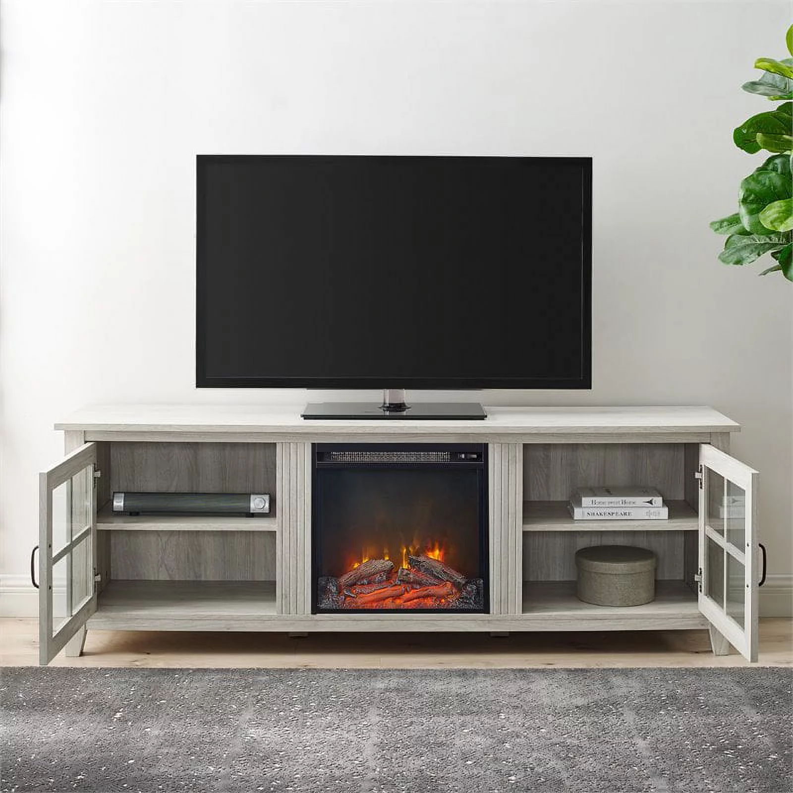 70" Glass Door TV Console with 18" Electric Fireplace Unit in Birch