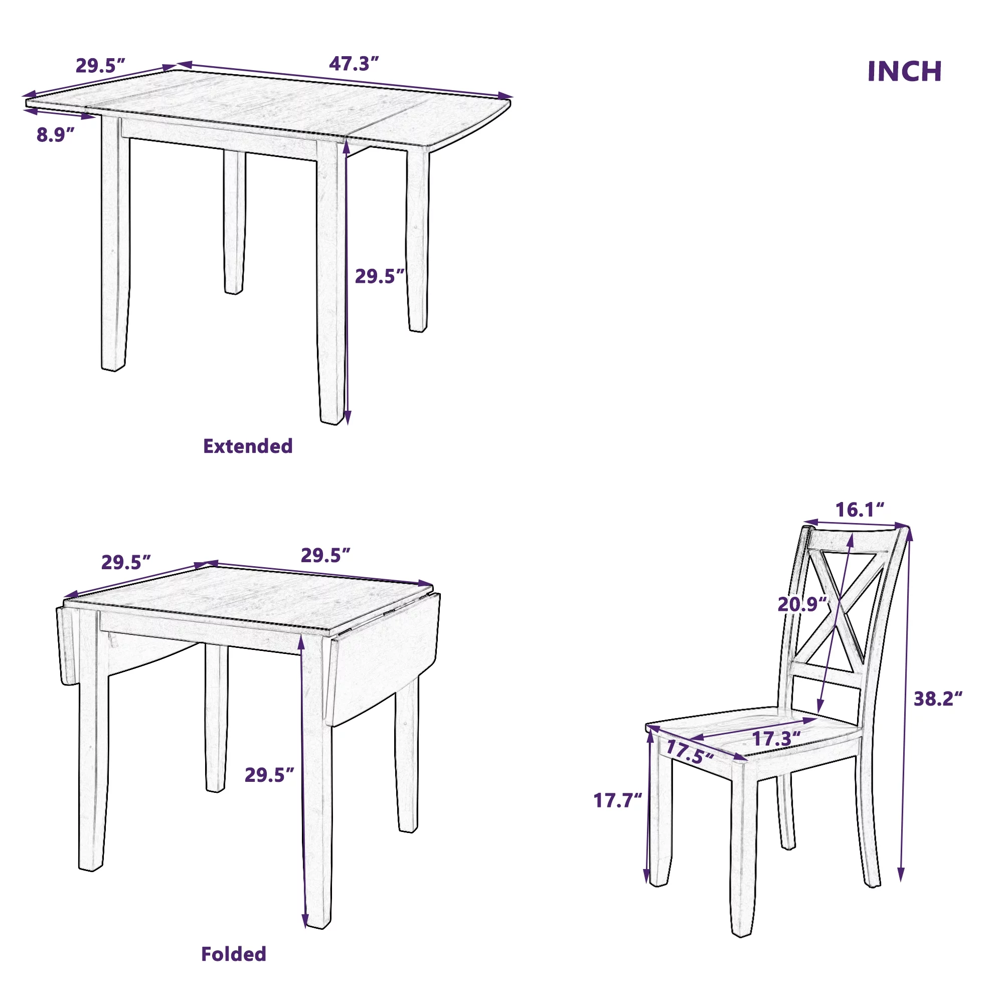 TOPMAX 3-Piece Wood Drop Leaf Breakfast Nook Dining Table Set with 2 X-back Chairs for Small Places, Brown