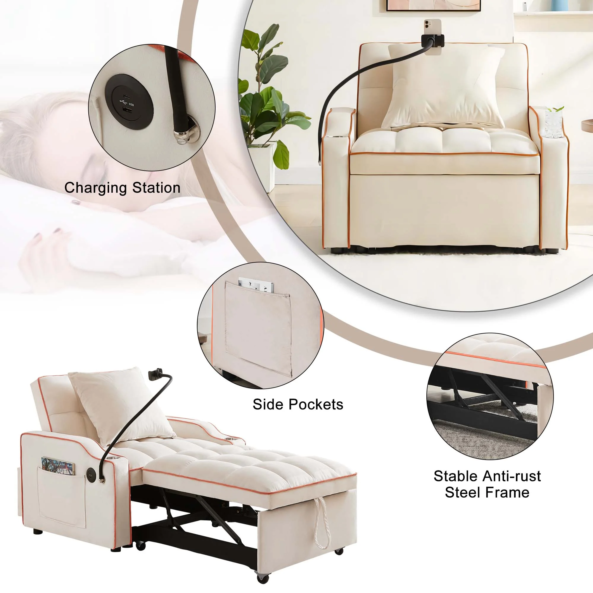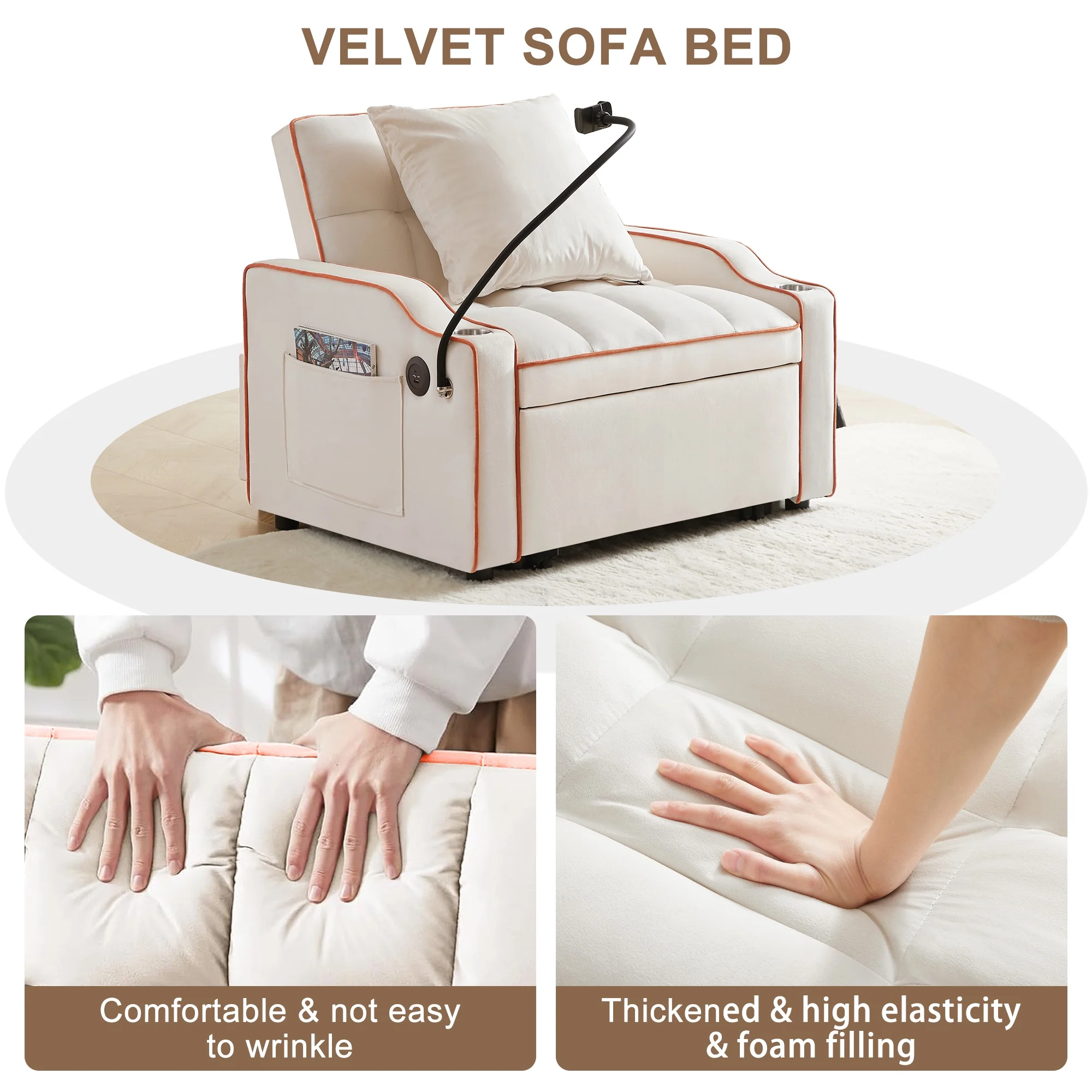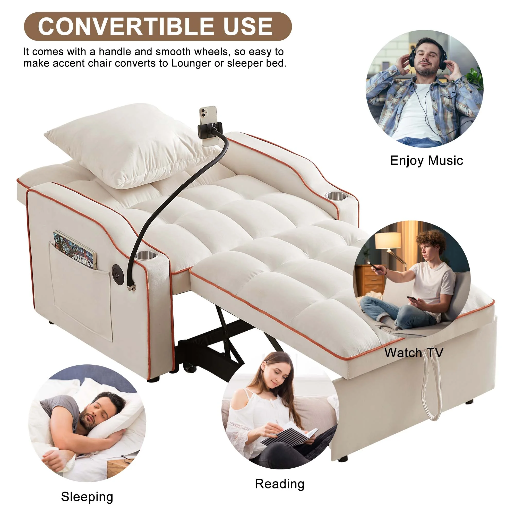 Aukfa Sleeper Chair Bed, Convertible Pull Out Sofa Bed with USB Port, Cup Holders and Swivel Phone Holder, Beige
