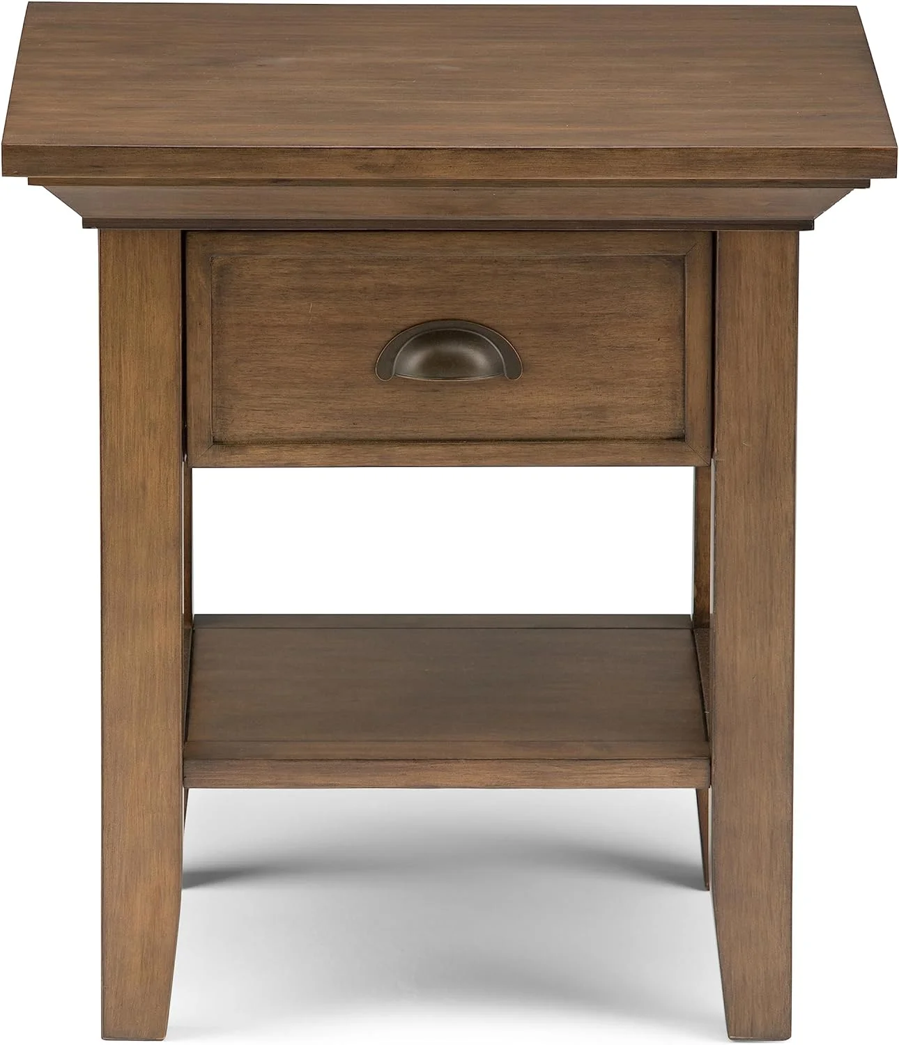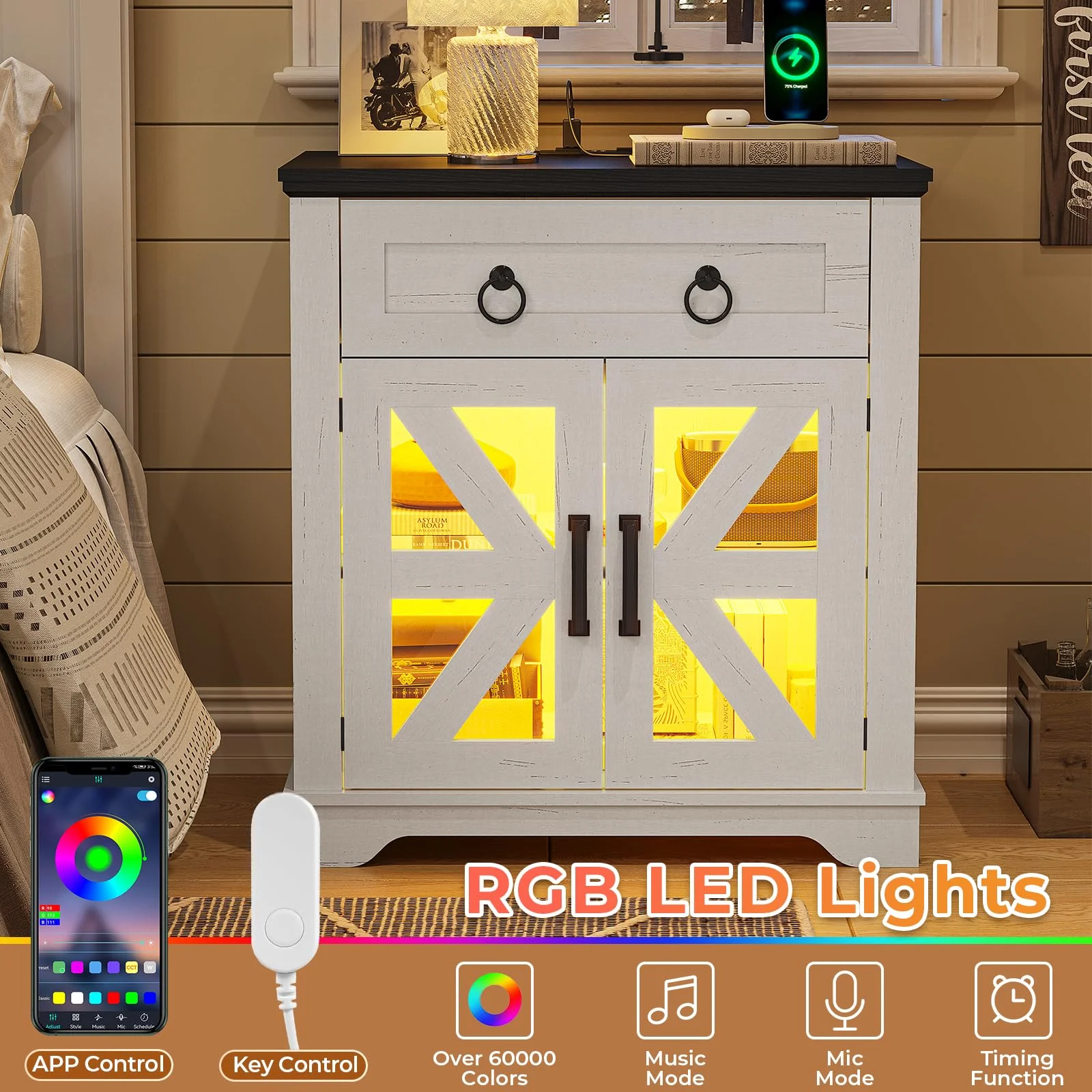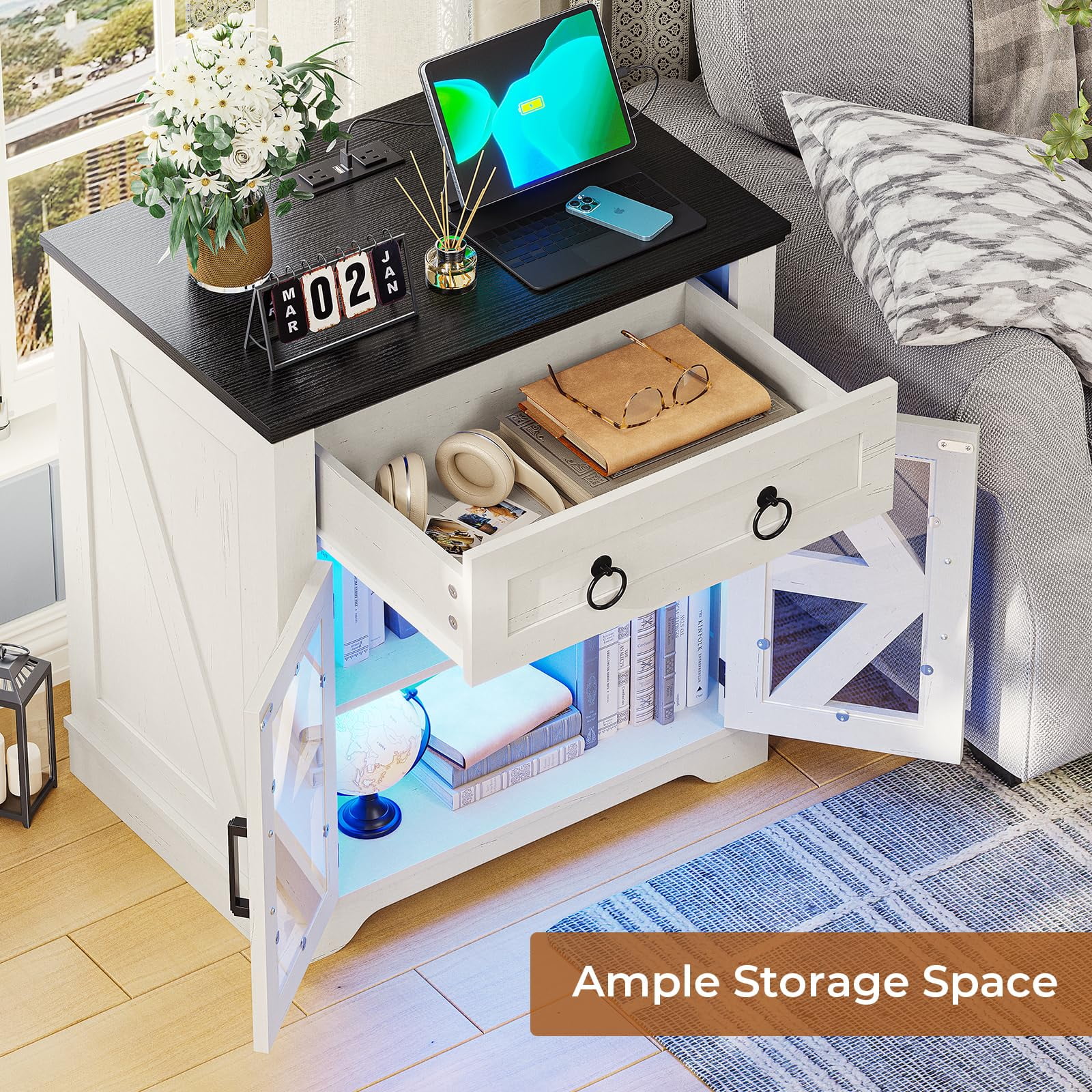 Farmhouse End Table with Charging Station, Side Table with LED Lights, White Night Stand for Living Room, Bedroom