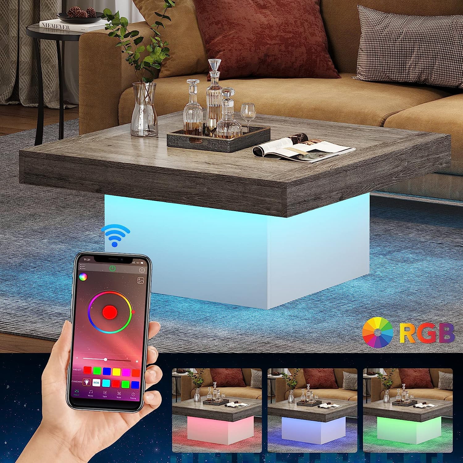 Tribesigns Square LED Coffee Table Grey and White Coffee Table Engineered Wood Coffee Table for Living Room Rustic Gray & White Low Coffee Table