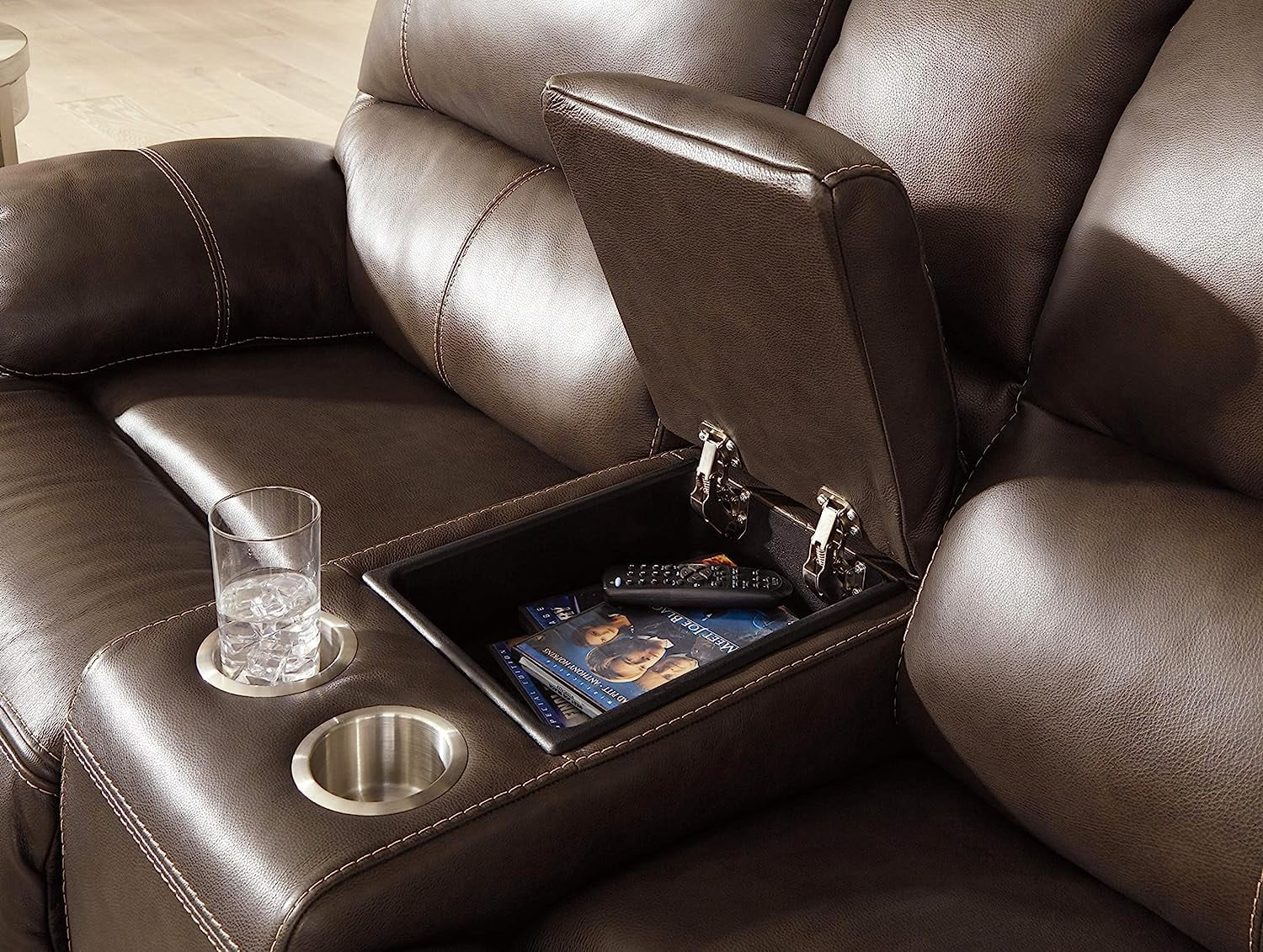 Ashley Furniture Ricmen Leather Power Reclining Loveseat in Walnut