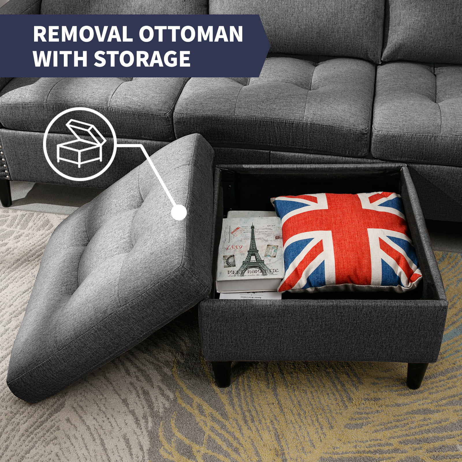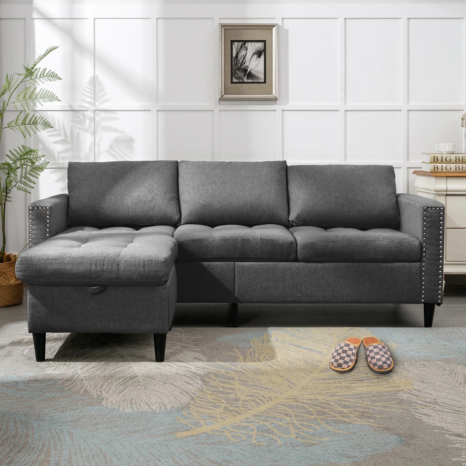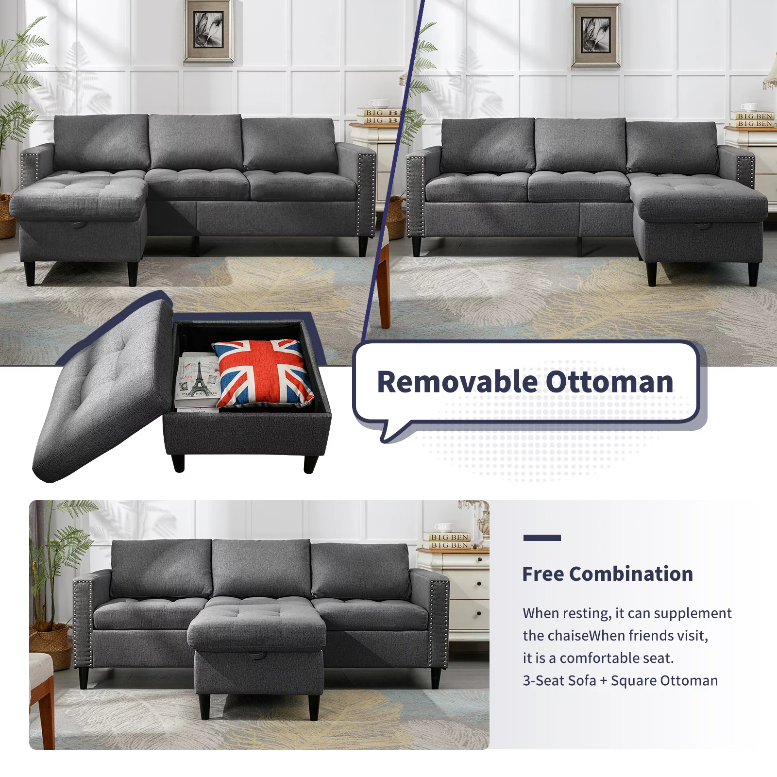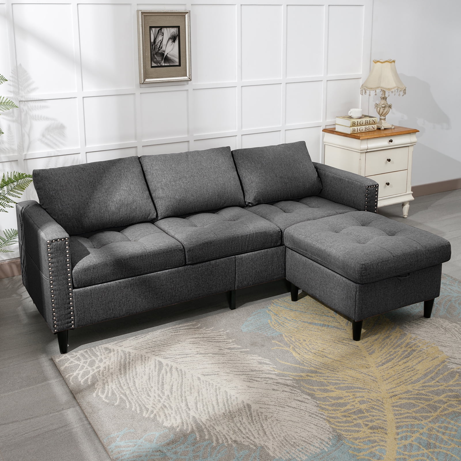 ZAFLY Reversible Sectional Couch, Set 3 Seat L Shaped Modular Sleeper Sofa Bed with Flexible Storage Ottoman Chaise, Modern Sofa Couches for Living Room/Apartment/Office - Dark Grey