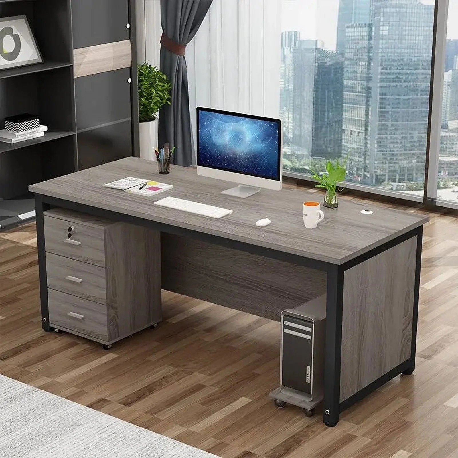 Rivet Square Meeting Table 48"W x 48"D Weathered Oak Top/Charcoal Painted Steel Base