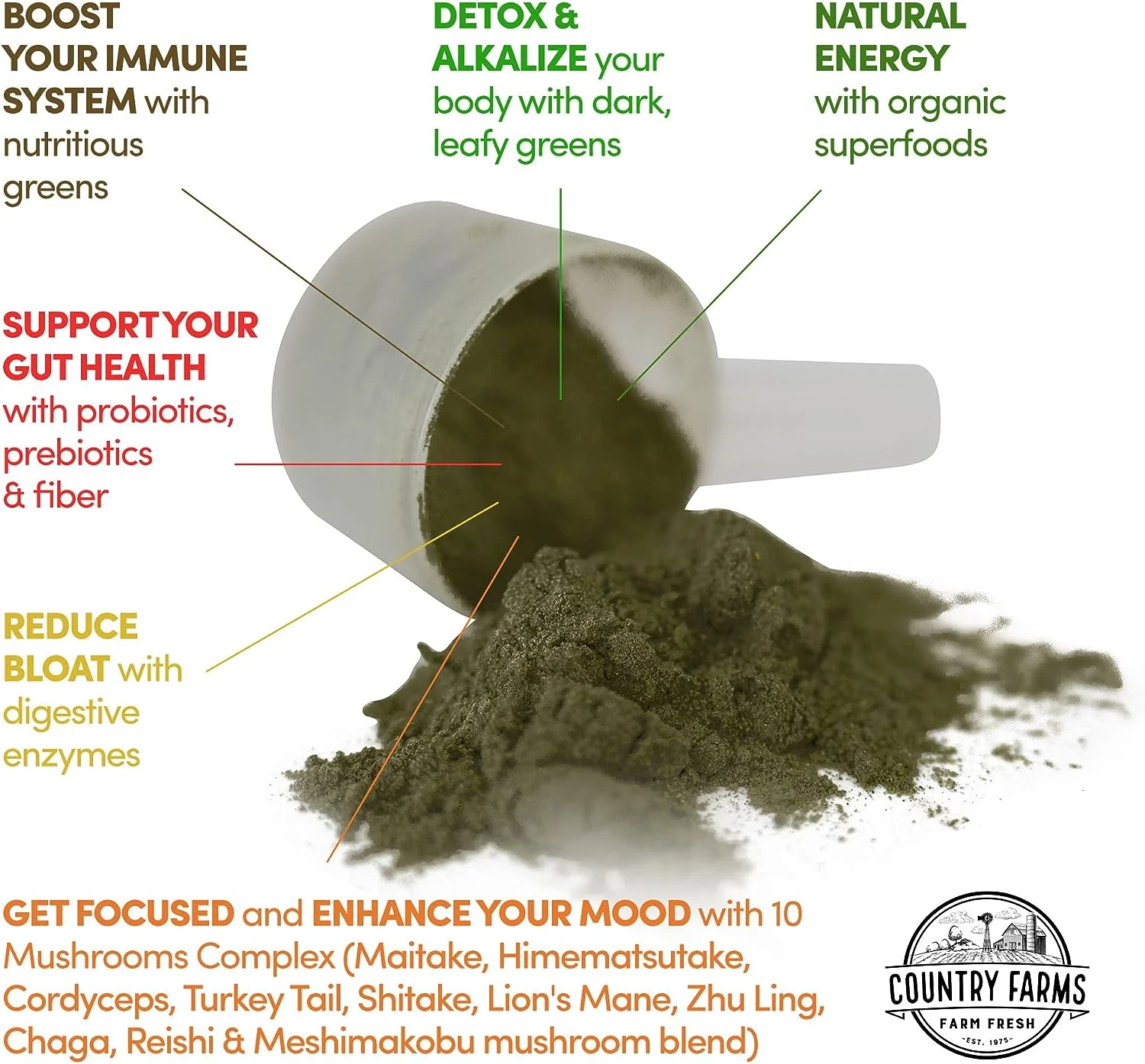 Country Farms Super Greens Natural Flavor, 50 Organic Super Foods, USDA Organic Drink Mix, Mushrooms & Probiotics, Supports Energy, 20 Servings, 10.6 Oz, 2 Packs