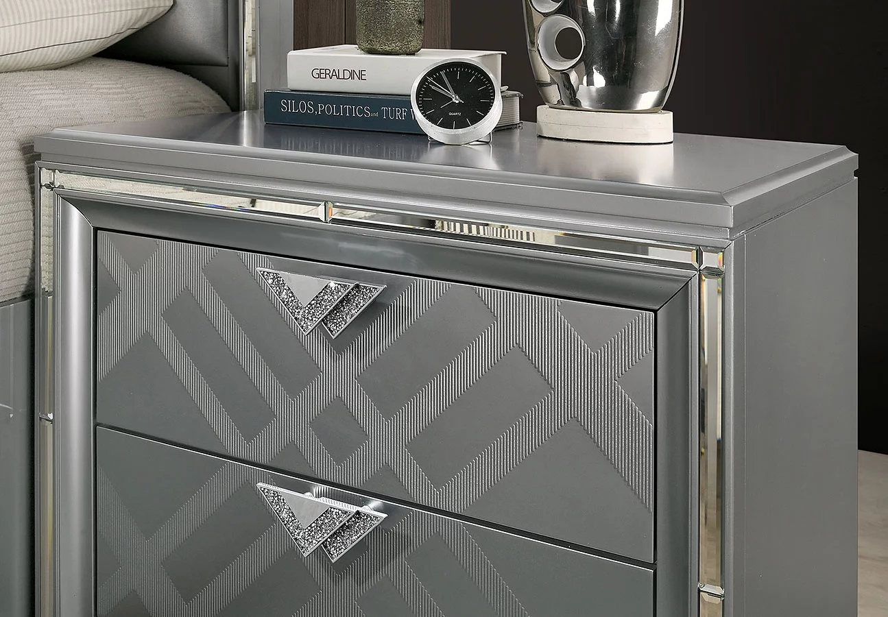 Contemporary Silver Eastern King Size Bed w LED Dresser Mirror USB 2x Nightstands 5pc Set Bedroom Furniture Chrome Pulls