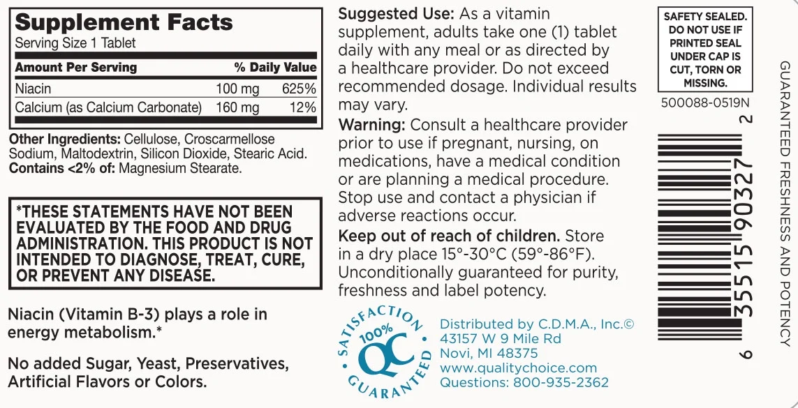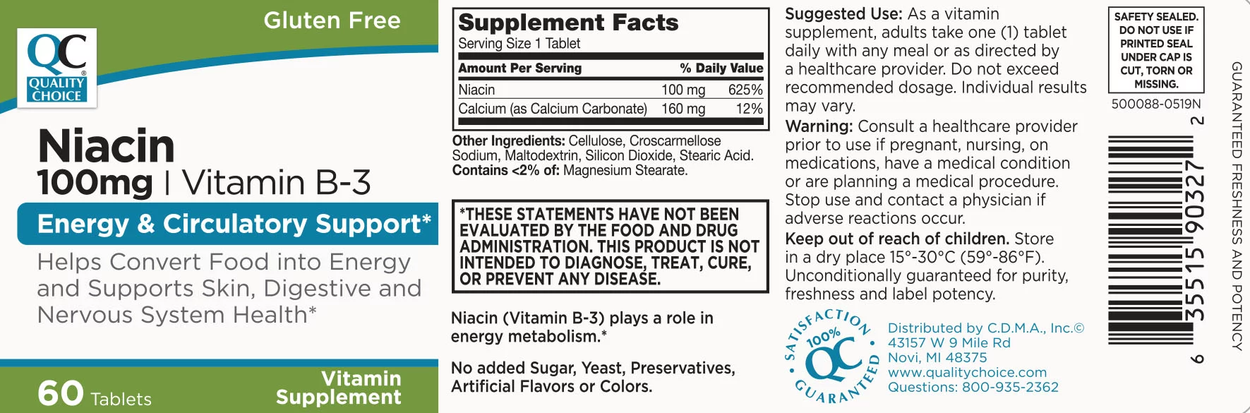 Quality Choice Niacin 100mg Vitamin B-3 Energy & Circulatory Support Tablets, 60 Count - Pack of 6
