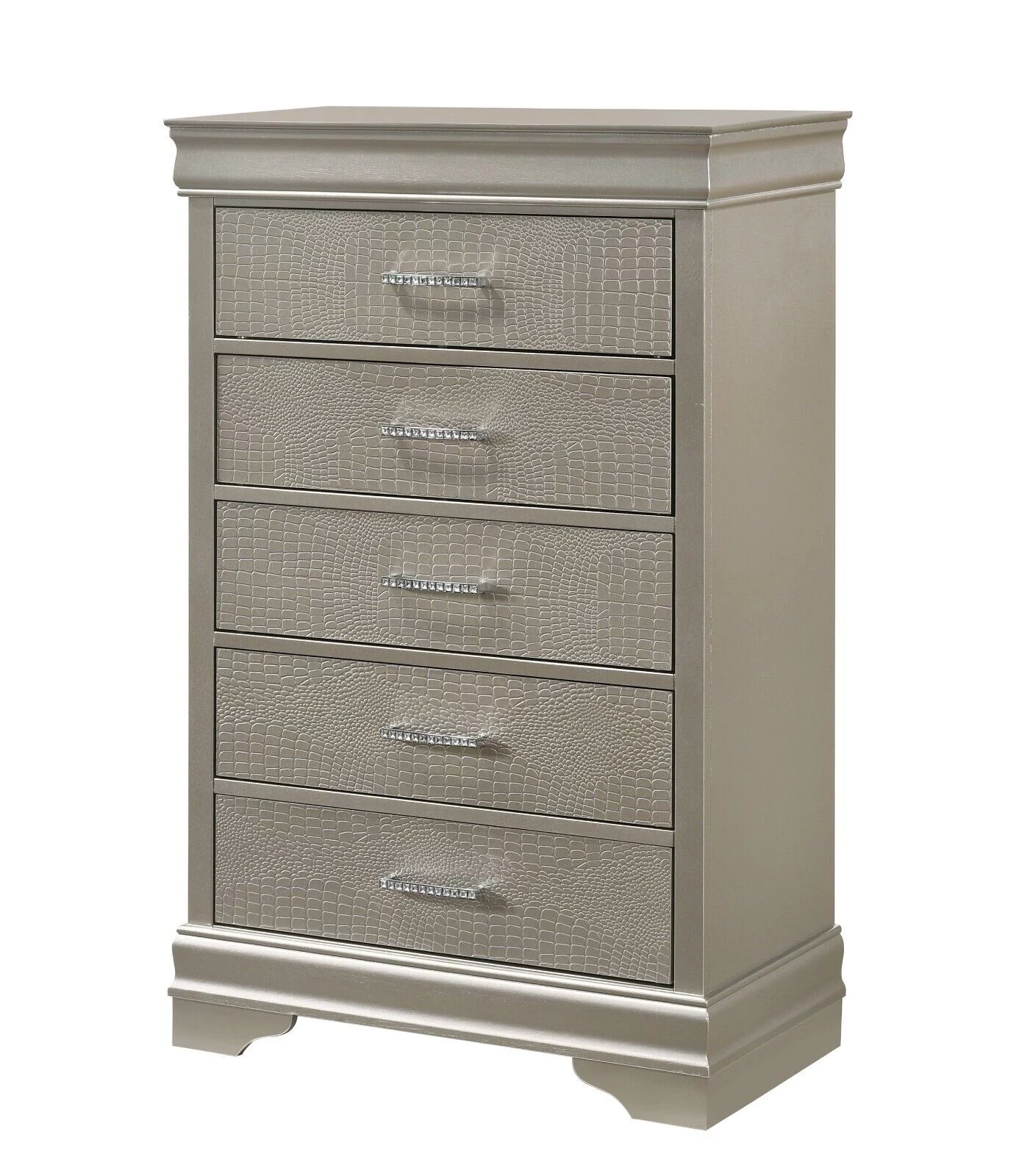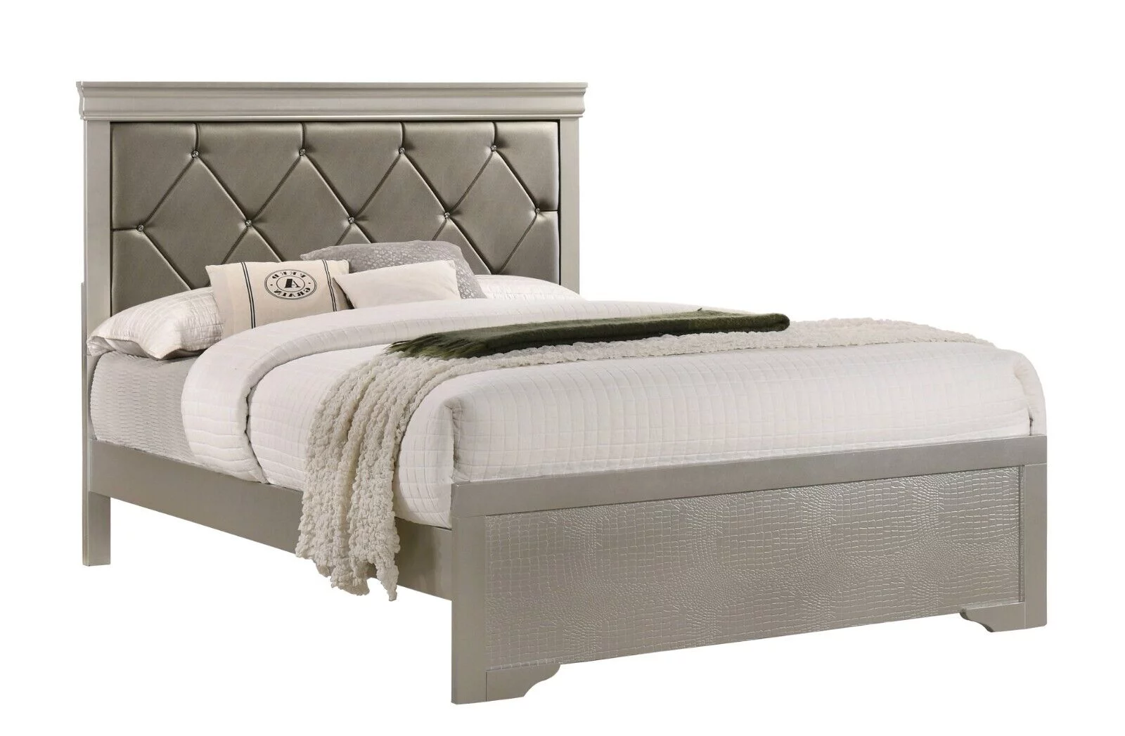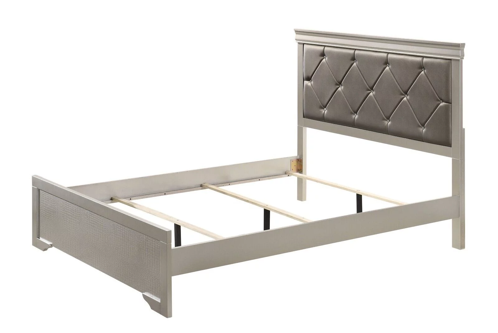 4Pc Silver Finish California King Size Panel Upholstery Bed Dresser Mirror Nightstand Set Wooden Bedroom Furniture