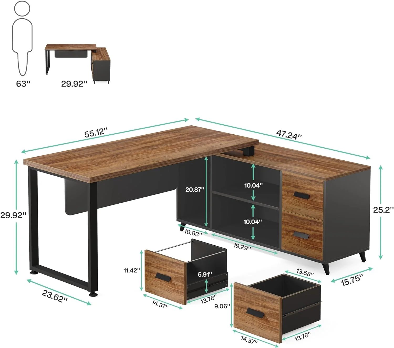 L Shaped Desk with File Drawer, 55 Inch Executive Office Desk with File Cabinet Storage Shelves