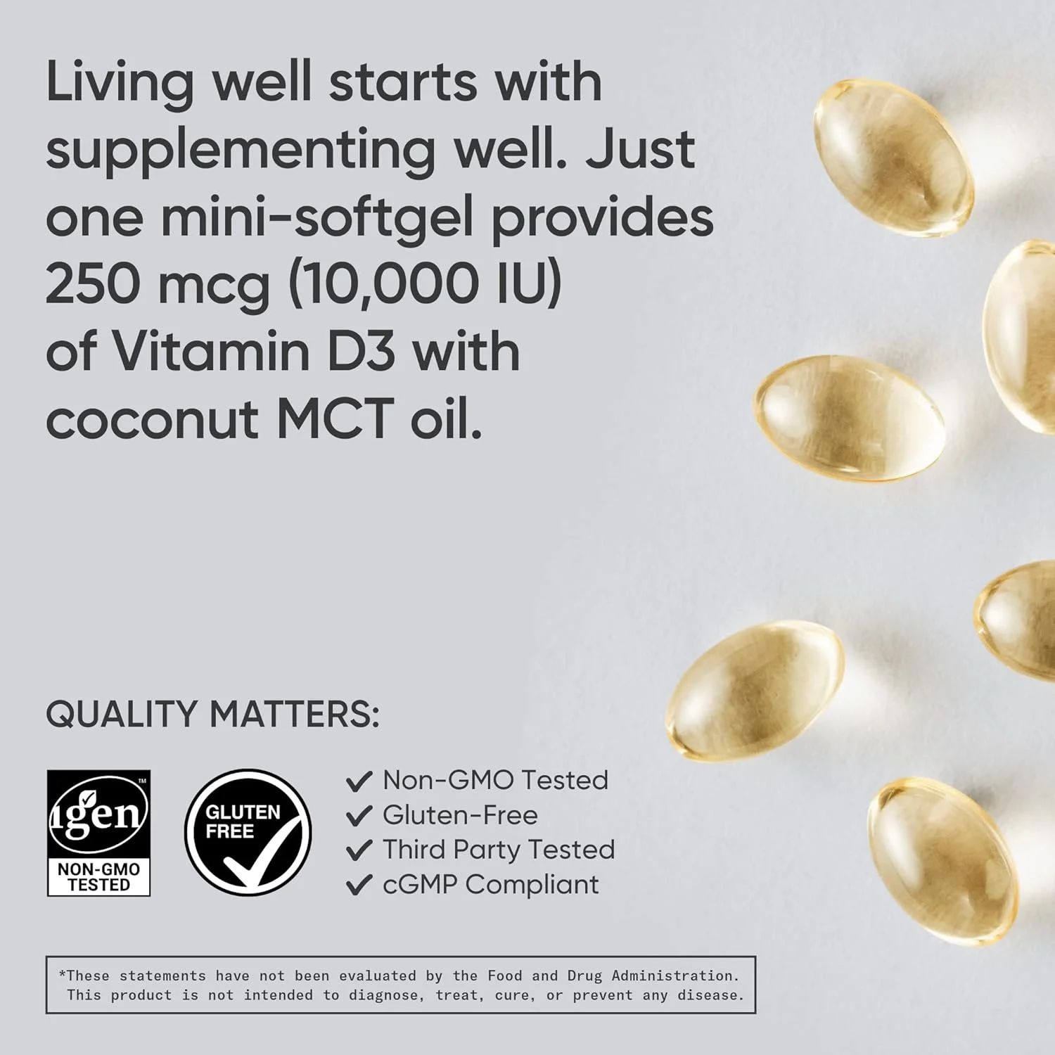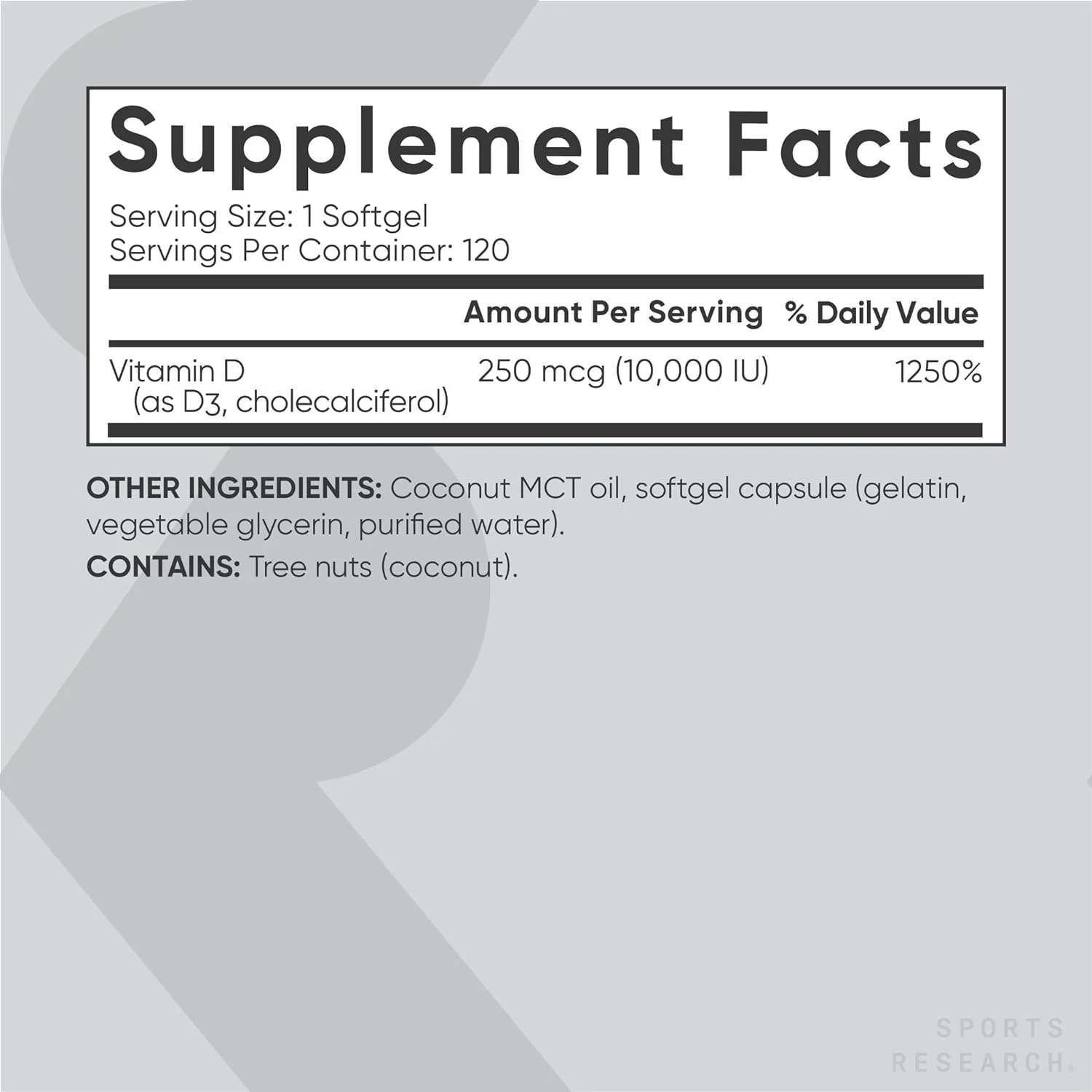 Sports Research Vitamin D3 10,000 IU with Coconut MCT Oil - High Potency Vitamin D Supplement for Immune & Bone Support - Non-GMO Verified, Gluten & Soy Free – 120 Liquid Softgels