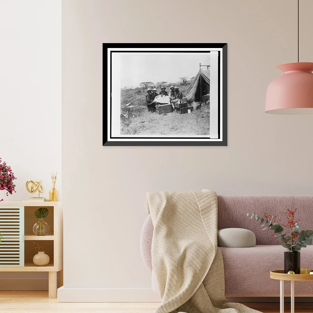 Historic Framed Print, [Edgar A. Mearns with Childs Frick and three men seated around makeshift table at campsite during Frick expedition to Abyssinia], 17-7/8" x 21-7/8"