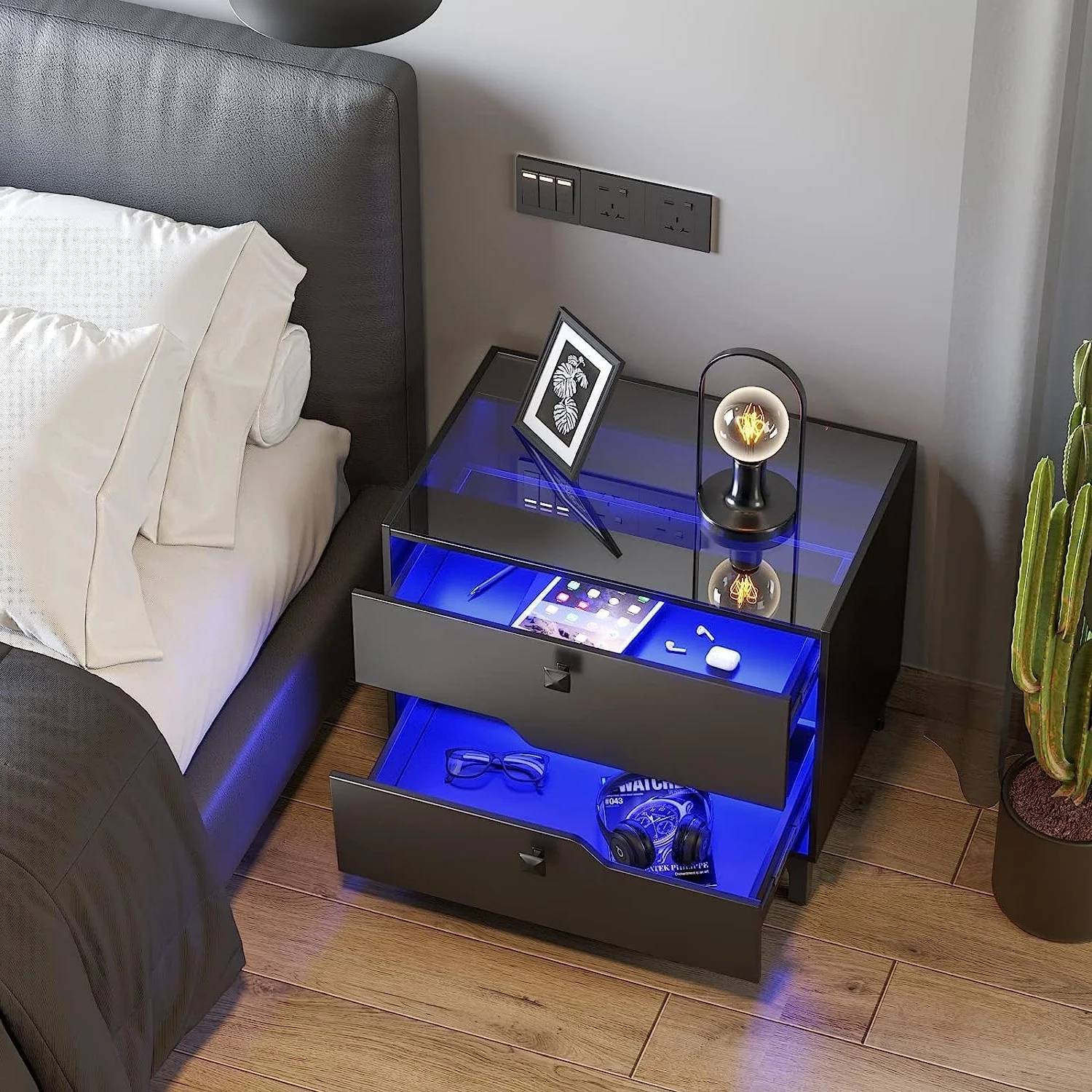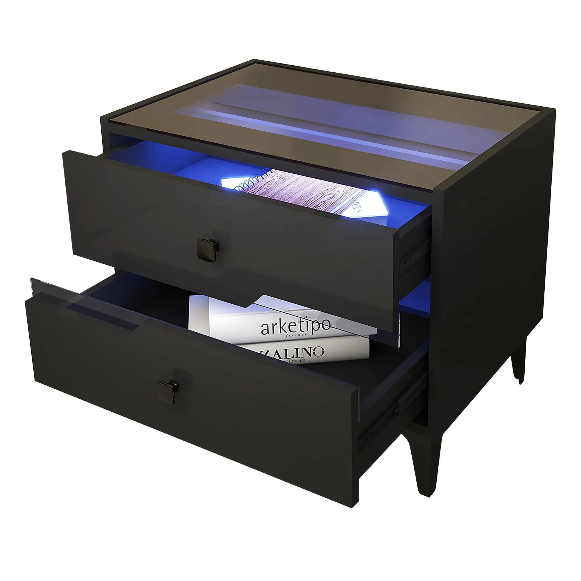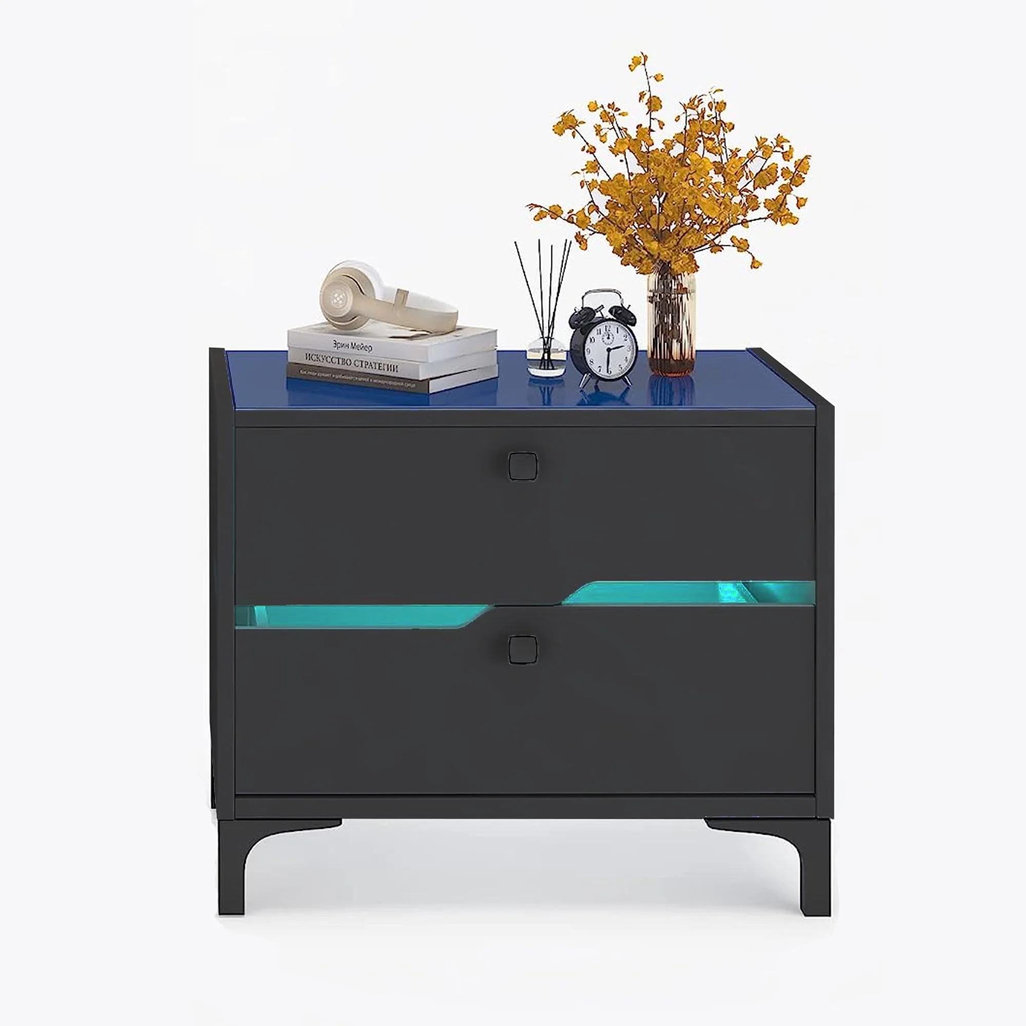 Glavbiku Modern Wood Bedside Table with 2 Drawers,Nightstand with LED Light for Bedroom,Adult,Black