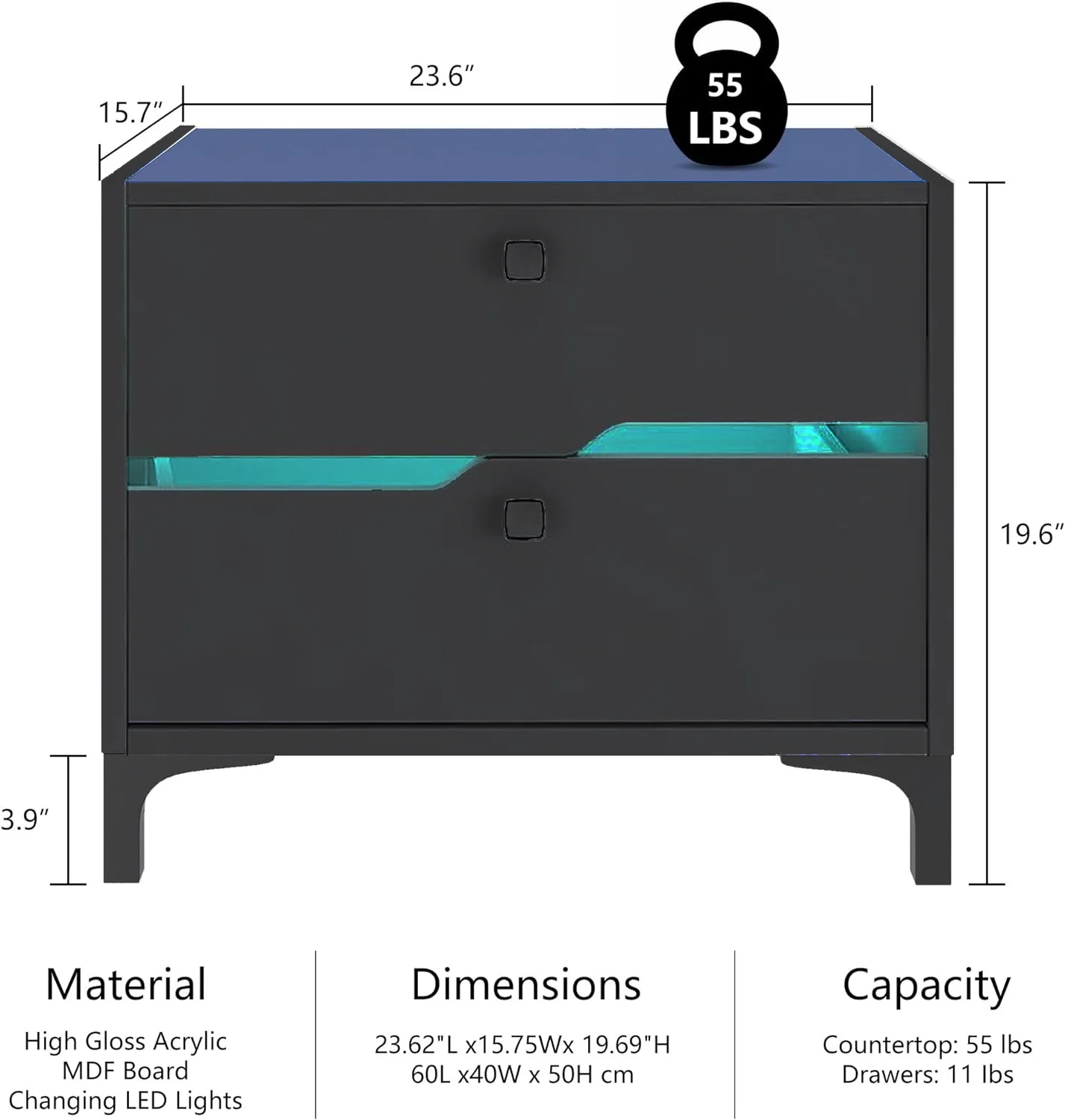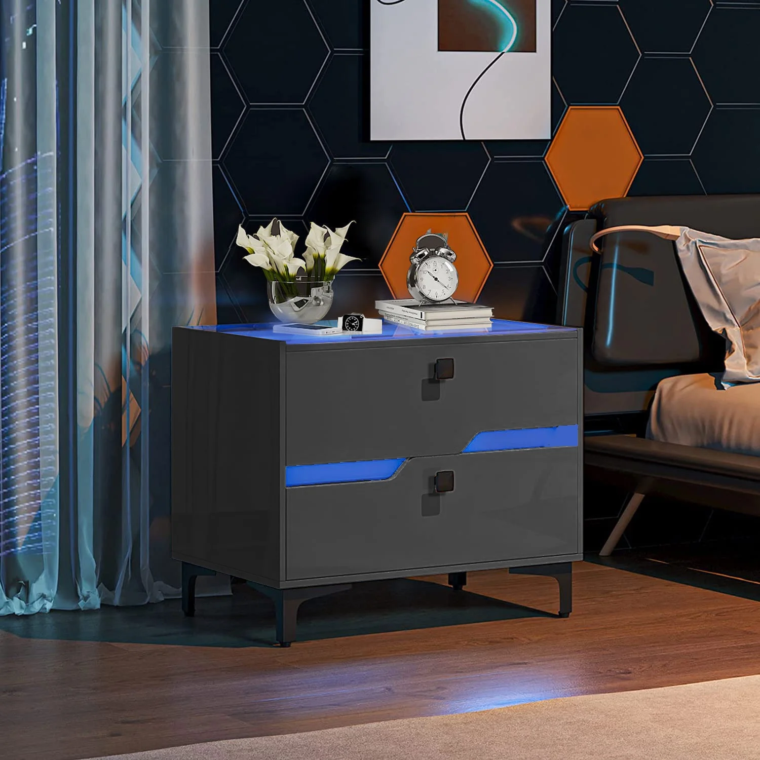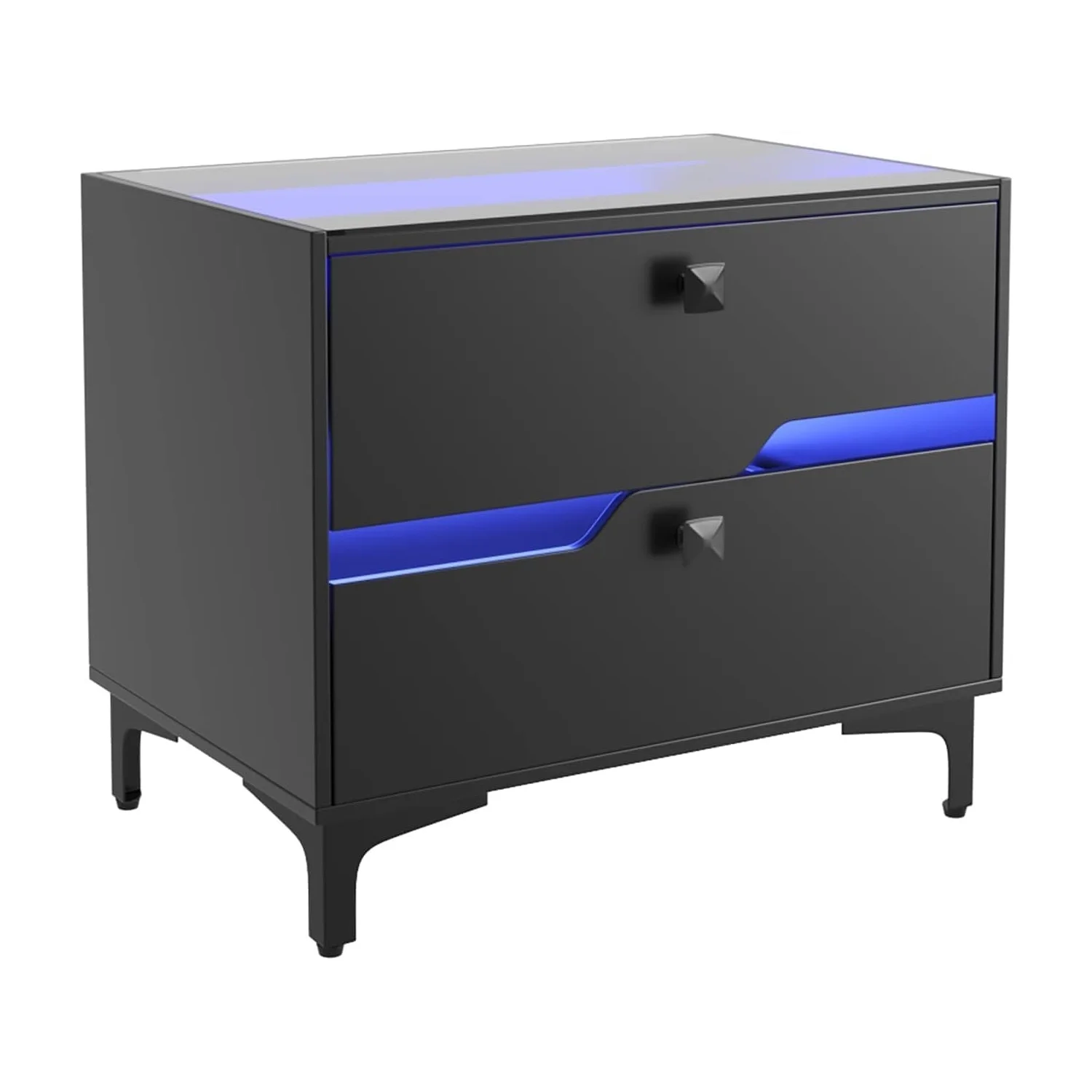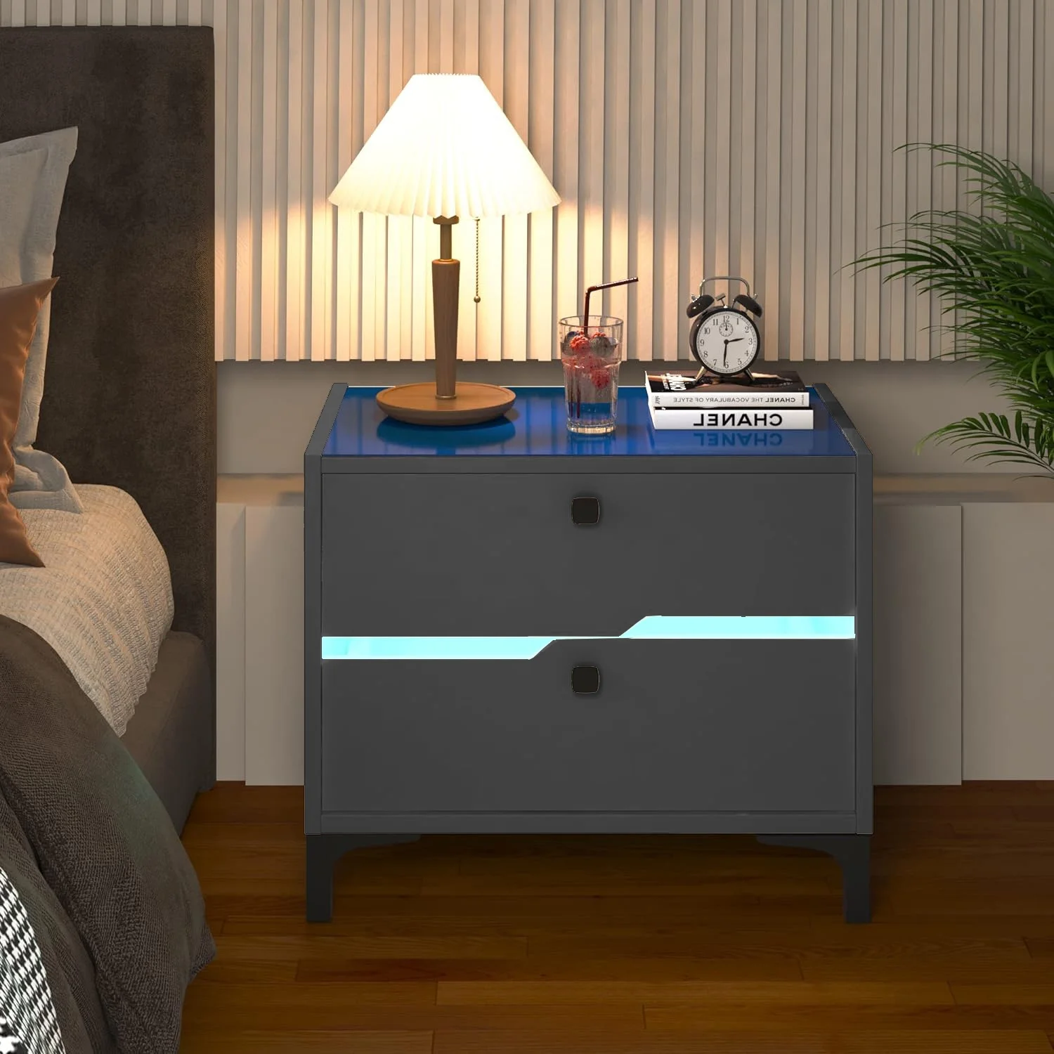Glavbiku Modern Wood Bedside Table with 2 Drawers,Nightstand with LED Light for Bedroom,Adult,Black
