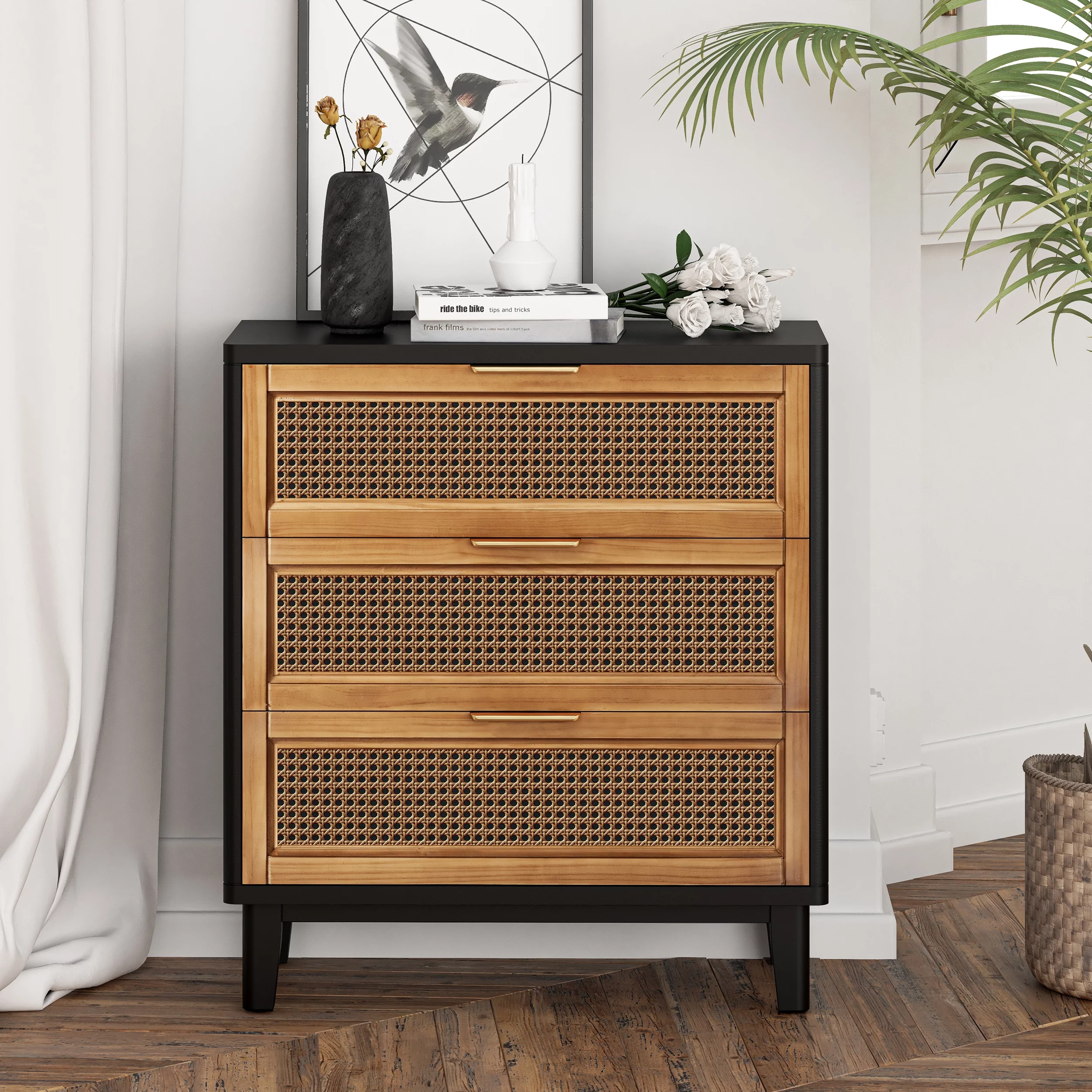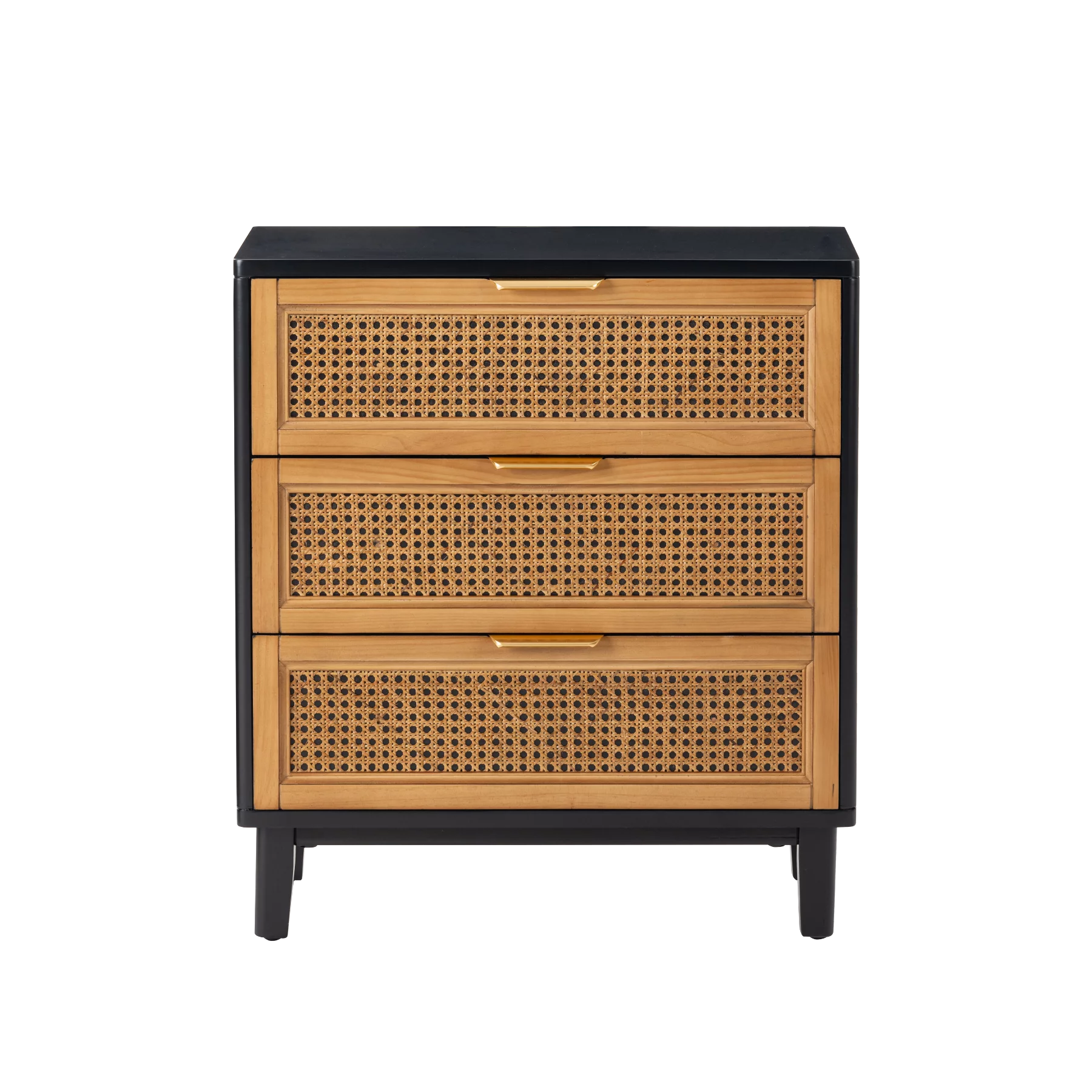 COZAYH Farmhouse 3-Drawer Nightstand, Woven Cane Front Accent Dresser with Brass Pull for Living Room, Bedroom, Fully-Assembled, Black