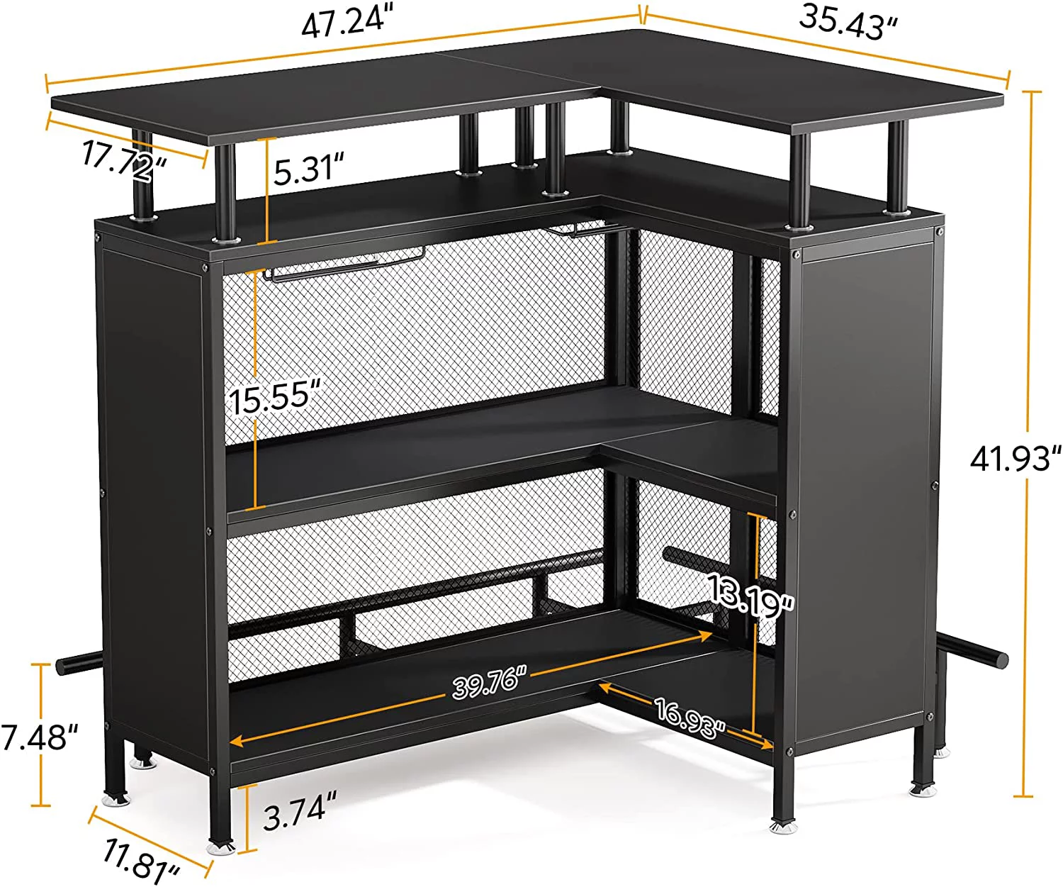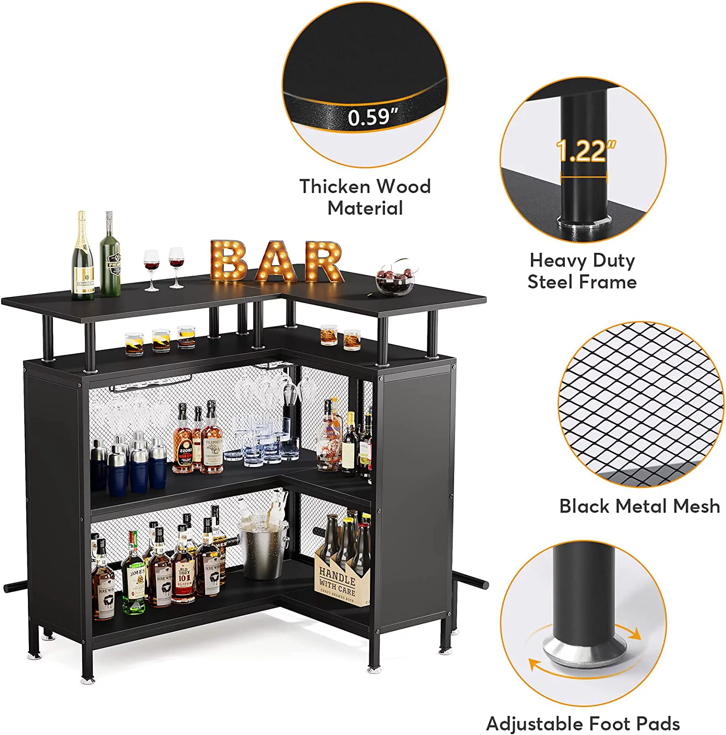 Tribesigns L-Shaped Home Bar Unit, Liquor Bar Table with 4 Stemware Racks and 2-Tier Shelves, Footrest for Home/Kitchen/Bar/Pub, Bar Table, Black