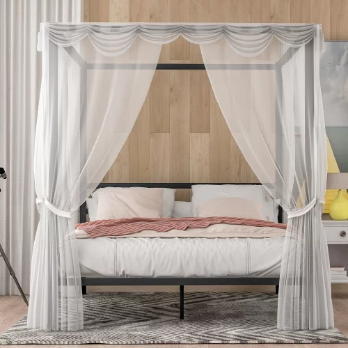 Queen Canopy Bed Frame Metal Four Posters 14 inch Platform with Built-in Headboard Strong Metal Slat Mattress Support,No Box Spring Needed, Black