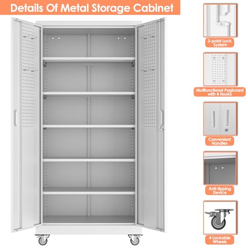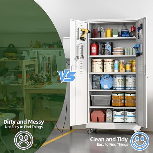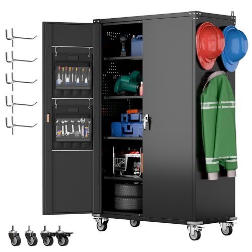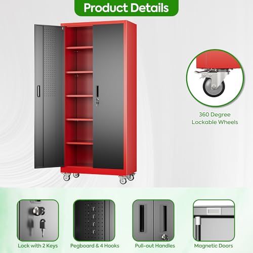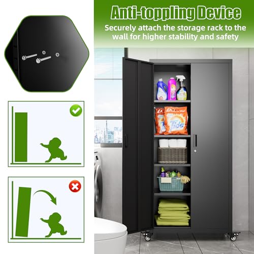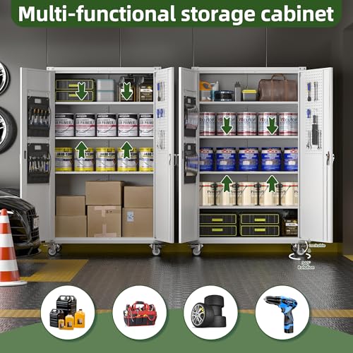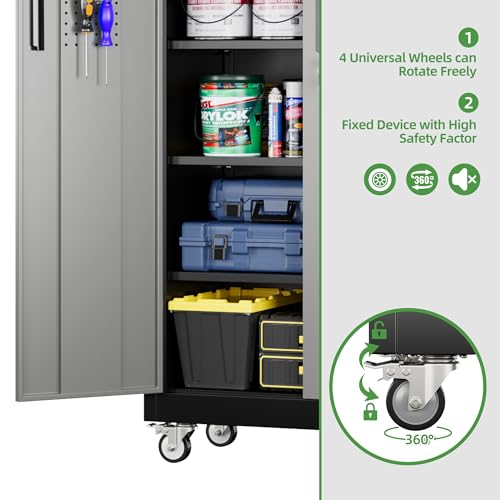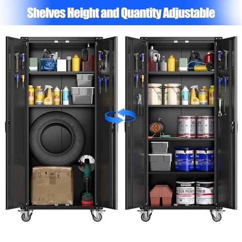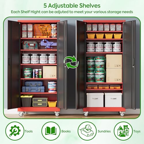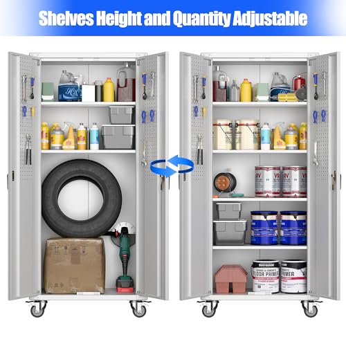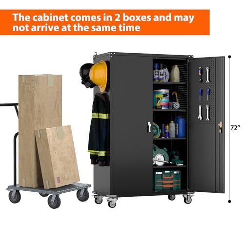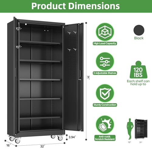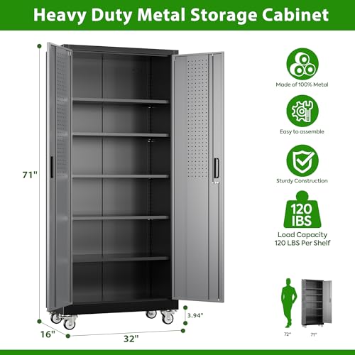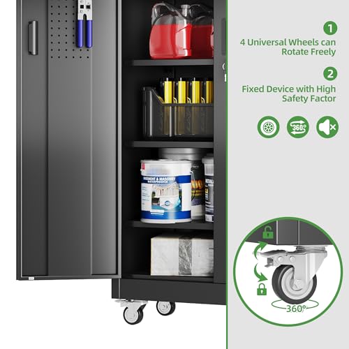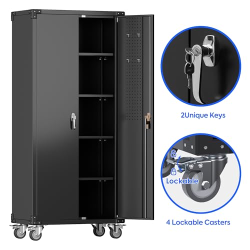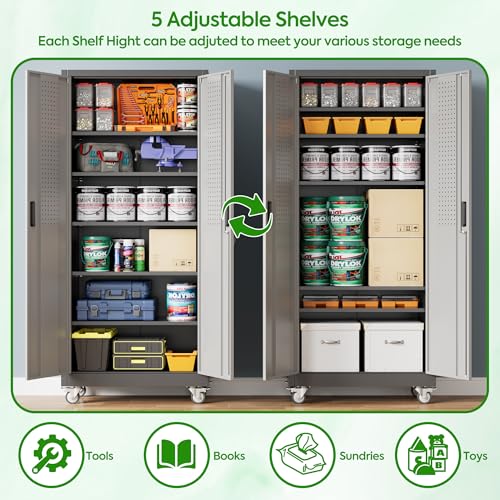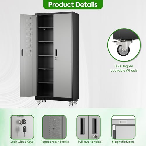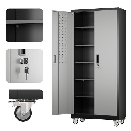 71" Metal Storage Cabinet with Wheels and Pegboard, Lockable Rolling Steel Storage Cabinet with 5 Adjustable Shelves and Door for Garage, Office, Kitchen, Assembly Required(Black and Grey)