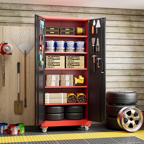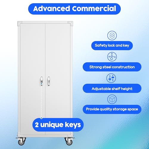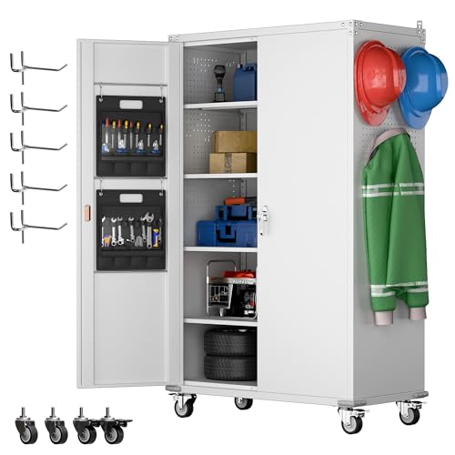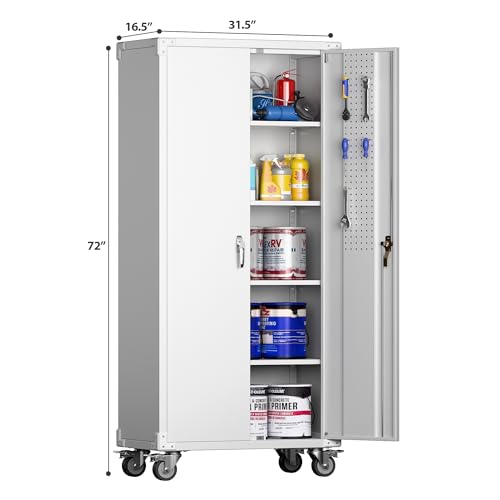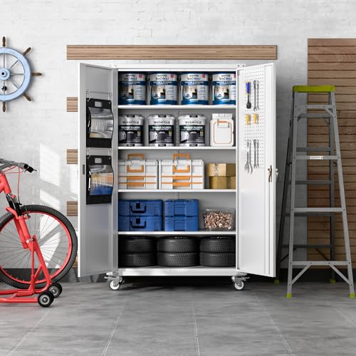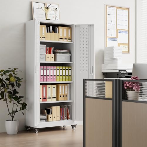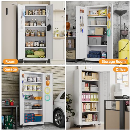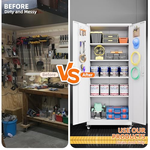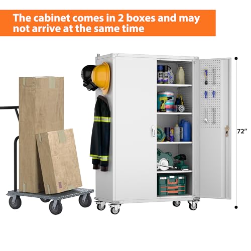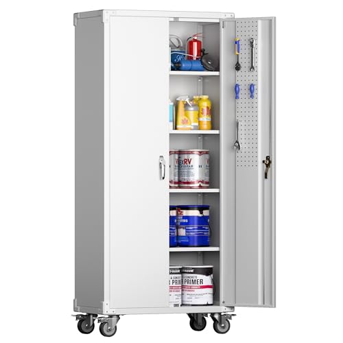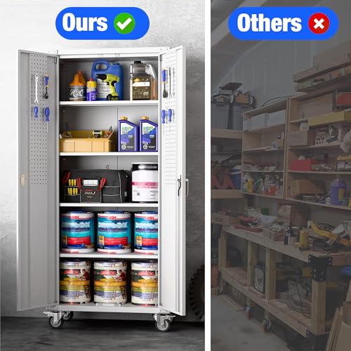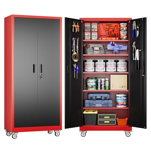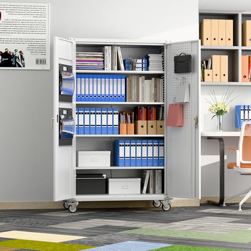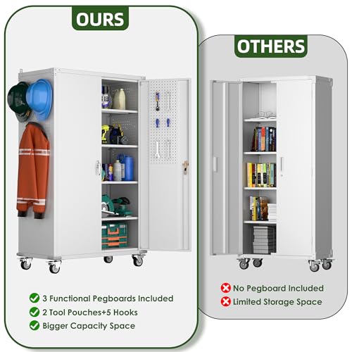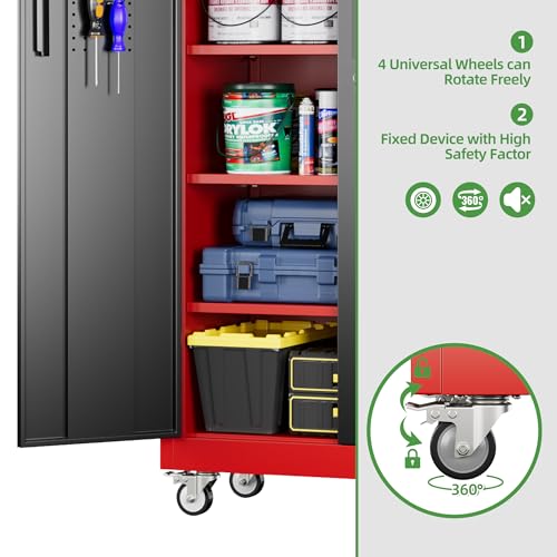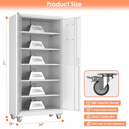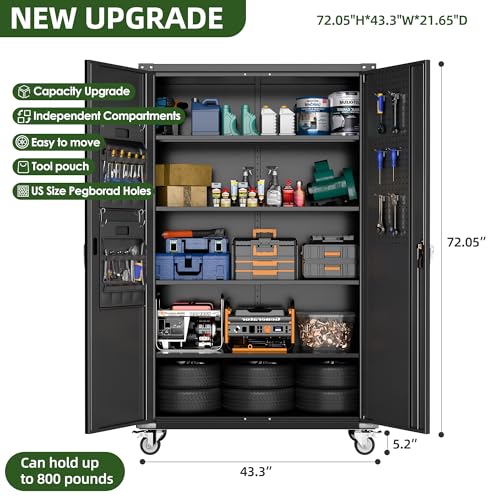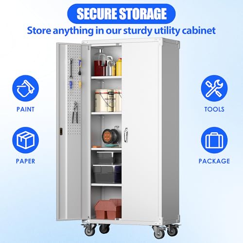 71" Metal Storage Cabinet with Wheels and Pegboard, Lockable Rolling Steel Storage Cabinet with 5 Adjustable Shelves and Door for Garage, Office, Kitchen, Assembly Required(Black and Grey)