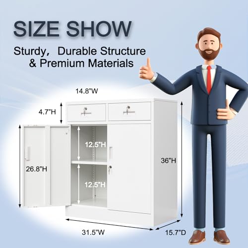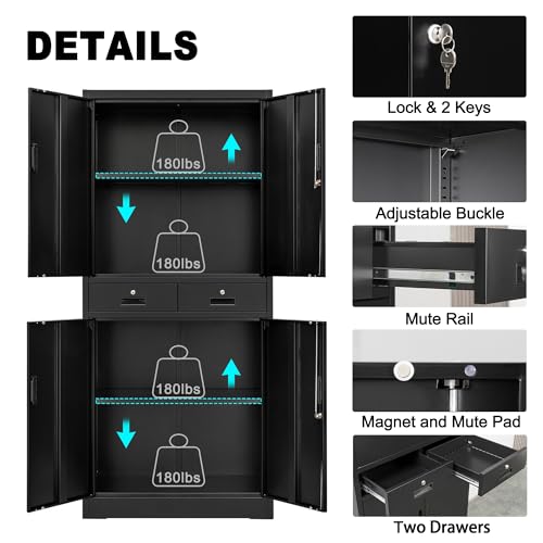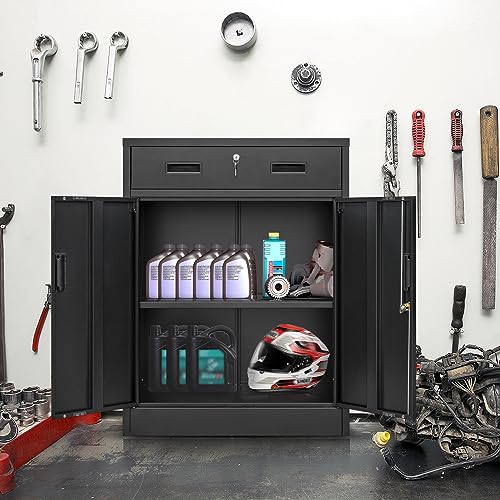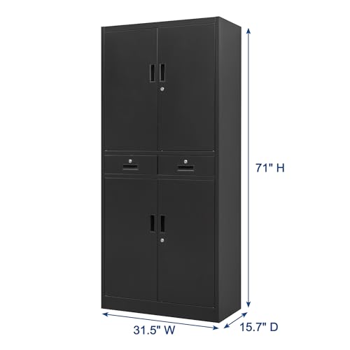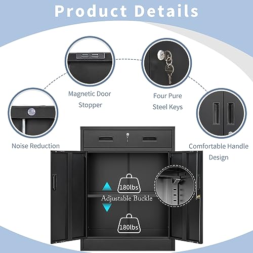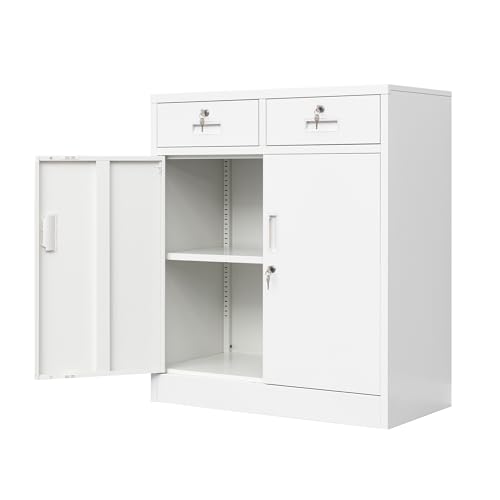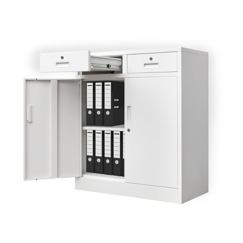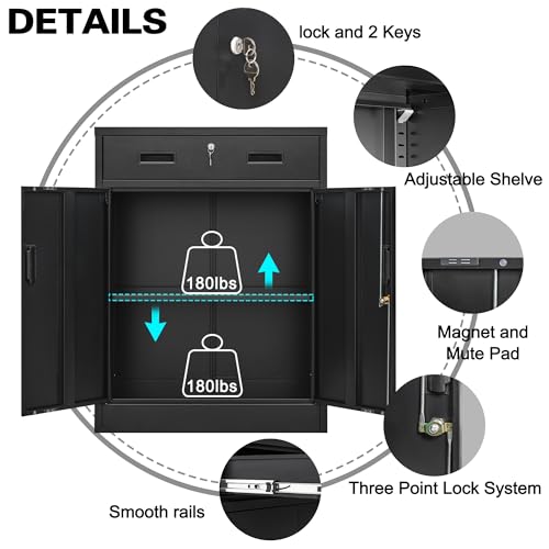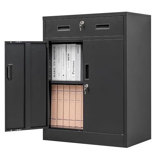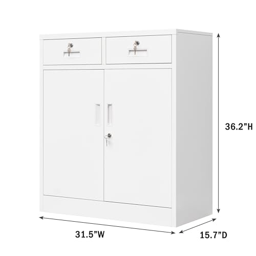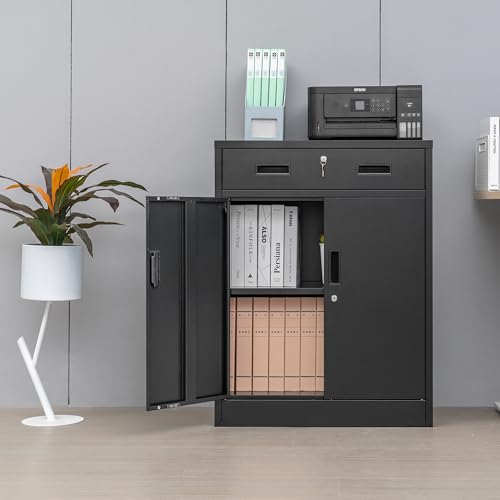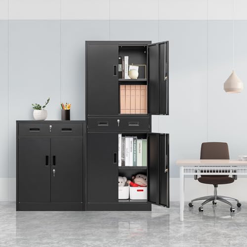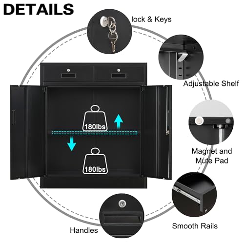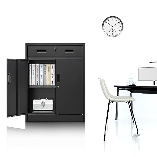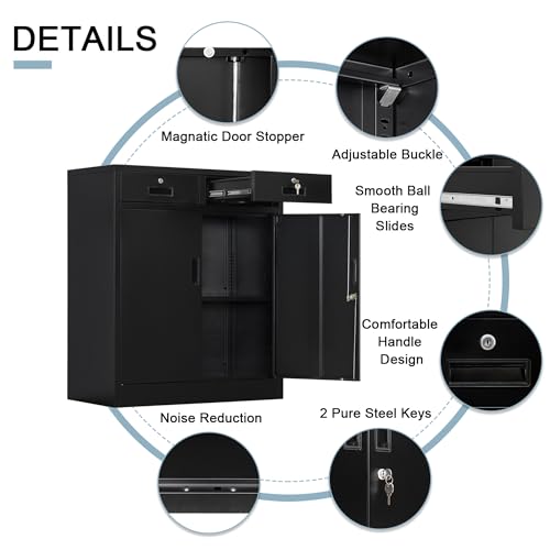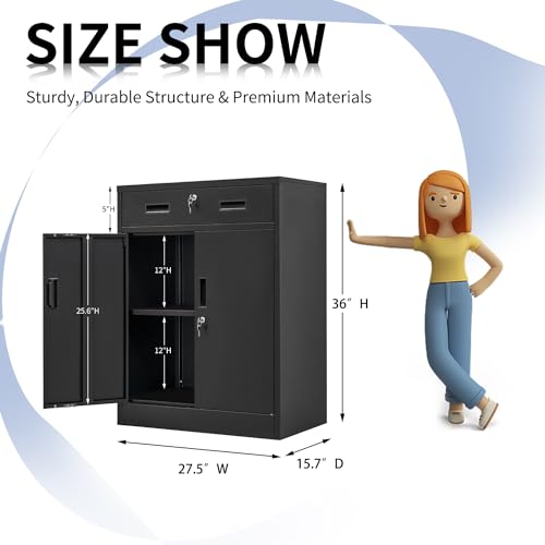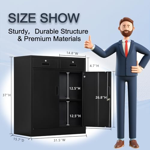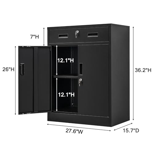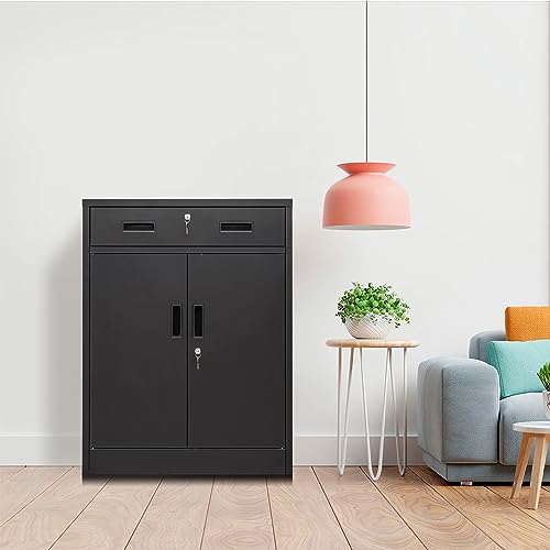 Metal Storage Cabinet with 2 Drawers. Lockable Steel Storage with Doors and Shelve, 37”H Office Cabinet for Home, Garage, Warehouse with Large Space. (Black)