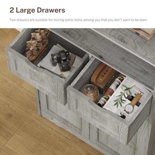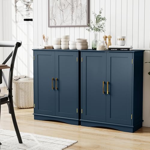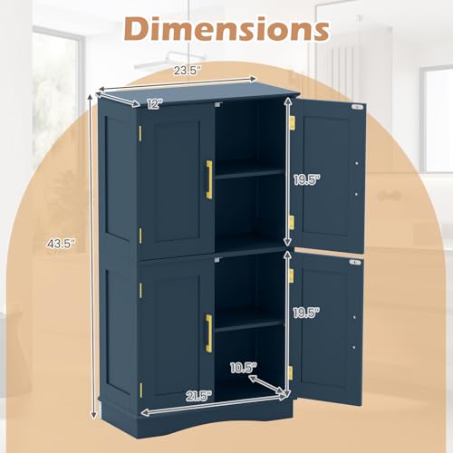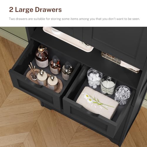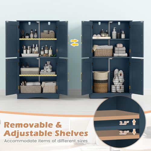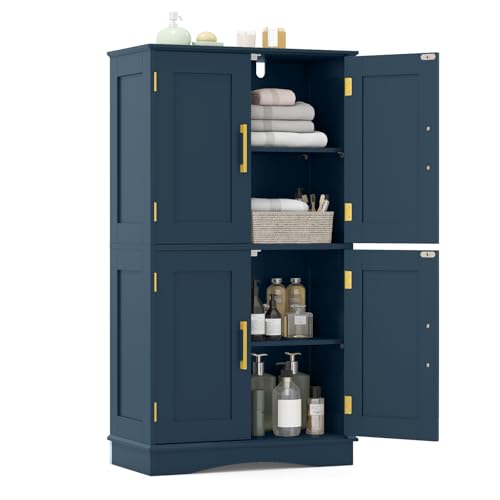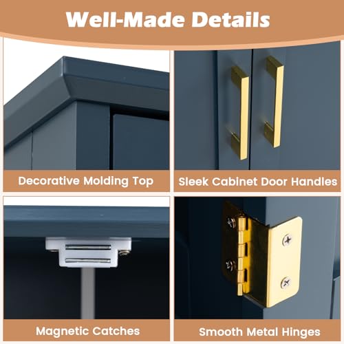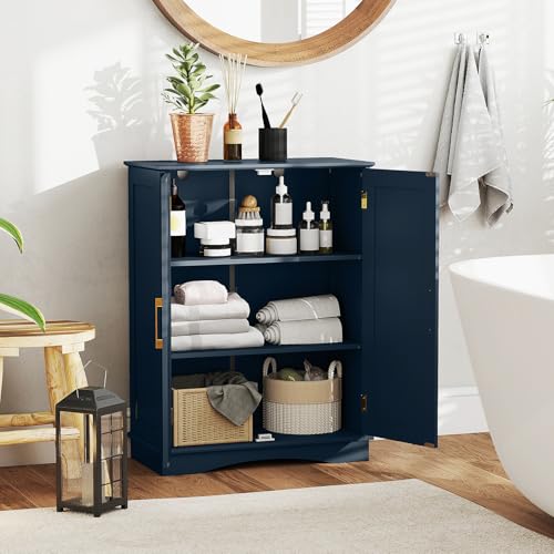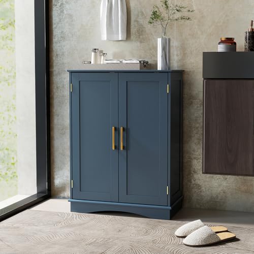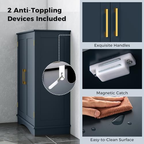ChooChoo Bathroom Floor Storage Cabinet with Flip Glass Drawer, Freestanding with 2 Doors, Adjustable Shelf & 1 Open Storage for Living Room, Hallway, Navy Blue