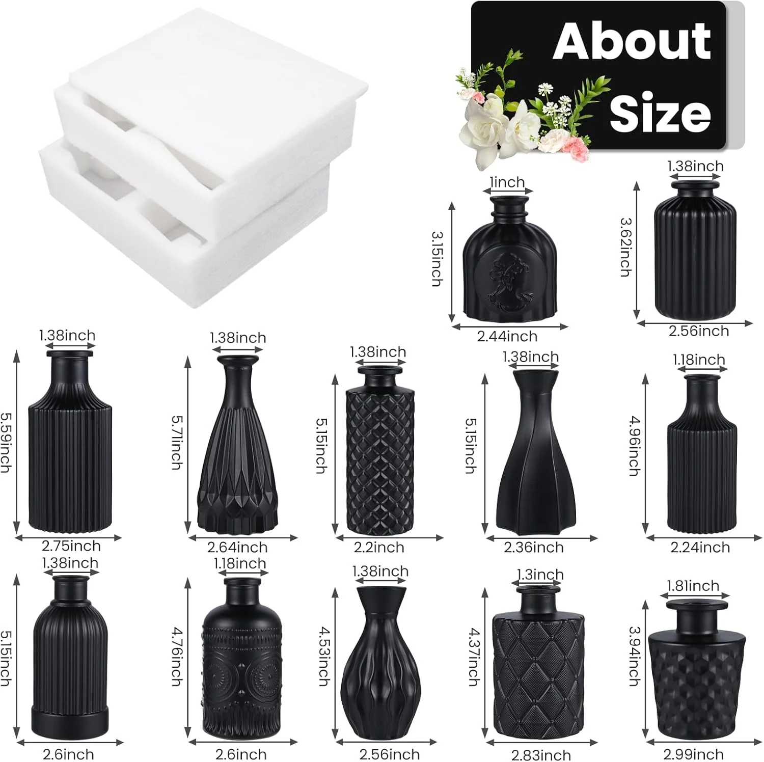 Mini Vintage Glass Bud Vases, Rustic Theme, Green & Black, Set of 12