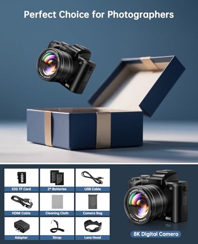8K Digital Cameras for Photography - Autofocus 88MP WiFi Vlogging Camera for YouTube with Dual-Lens - 16X Digital Zoom Vlog Camera with Lens Hood, Flash, Touch Screen, 2 Batteries, 32GB TF Card