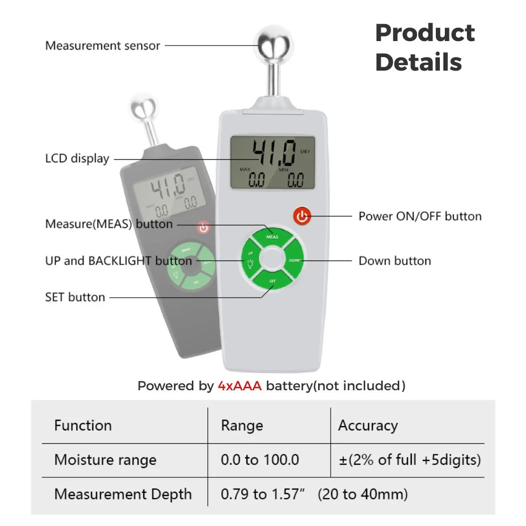 Sensitive Pinless Wood Moisture Meter, AAA Battery Powered Digital Moisture Sensor, Cordless LCD Display Dampness Tester for Masonry Wood Brick Plaster Wall, 0.8-1.6inch Measurement Depth