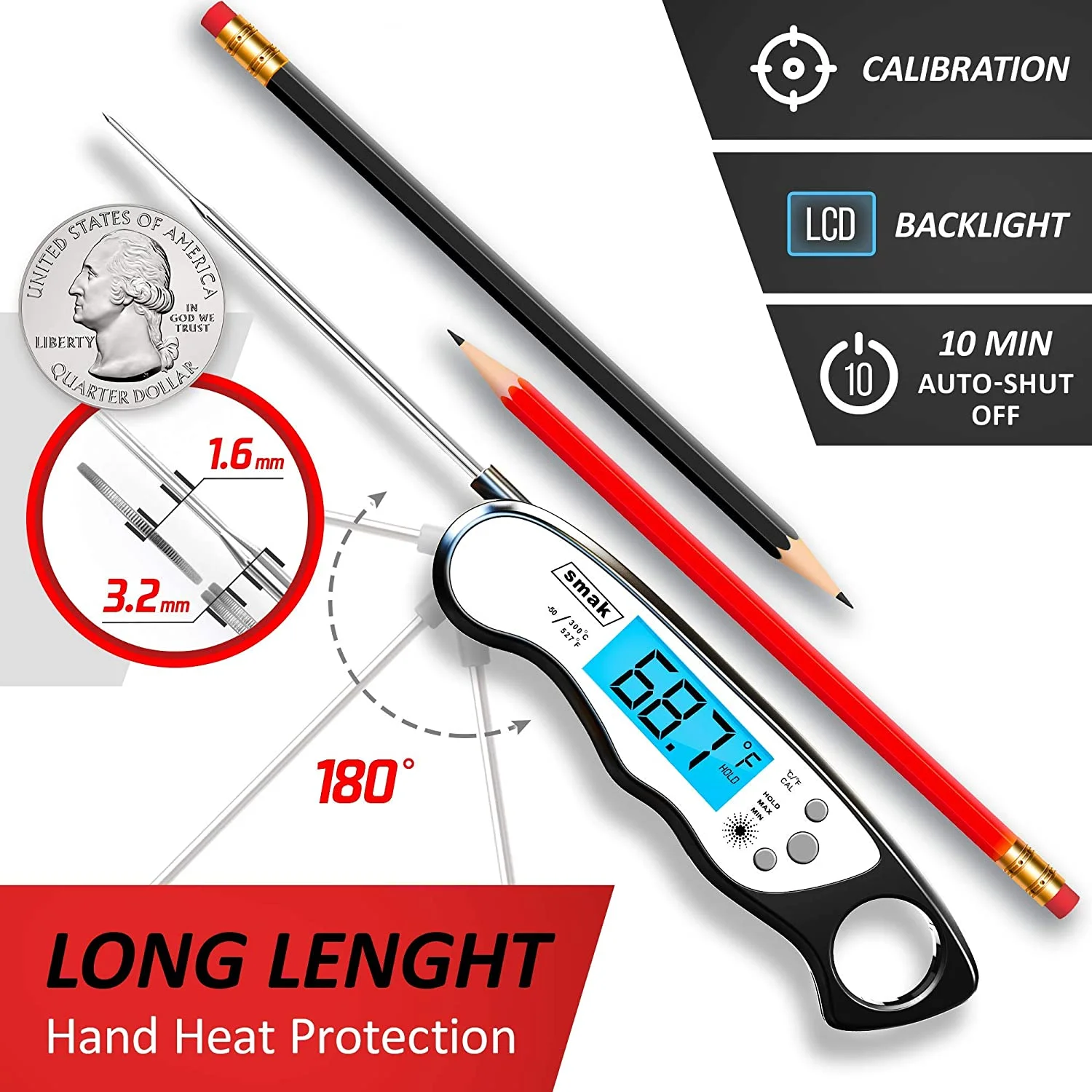 Digital Instant Read Meat Thermometer - Smak Waterproof Kitchen Food Cooking Thermometer with Backlight LCD - Best Super Fast Electric Meat Thermometer Probe for BBQ Grilling Baking Turkey Black