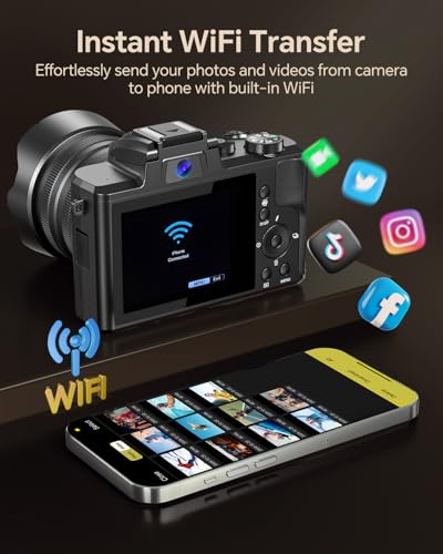 4K Digital Camera for Photography, WiFi 64MP 180° Flip Screen 3" Autofocus Vlogging Camera for YouTube, 16X Zoom Compact Point and Shoot Cameras for Beginner with 32GB Card, 2 Batteries