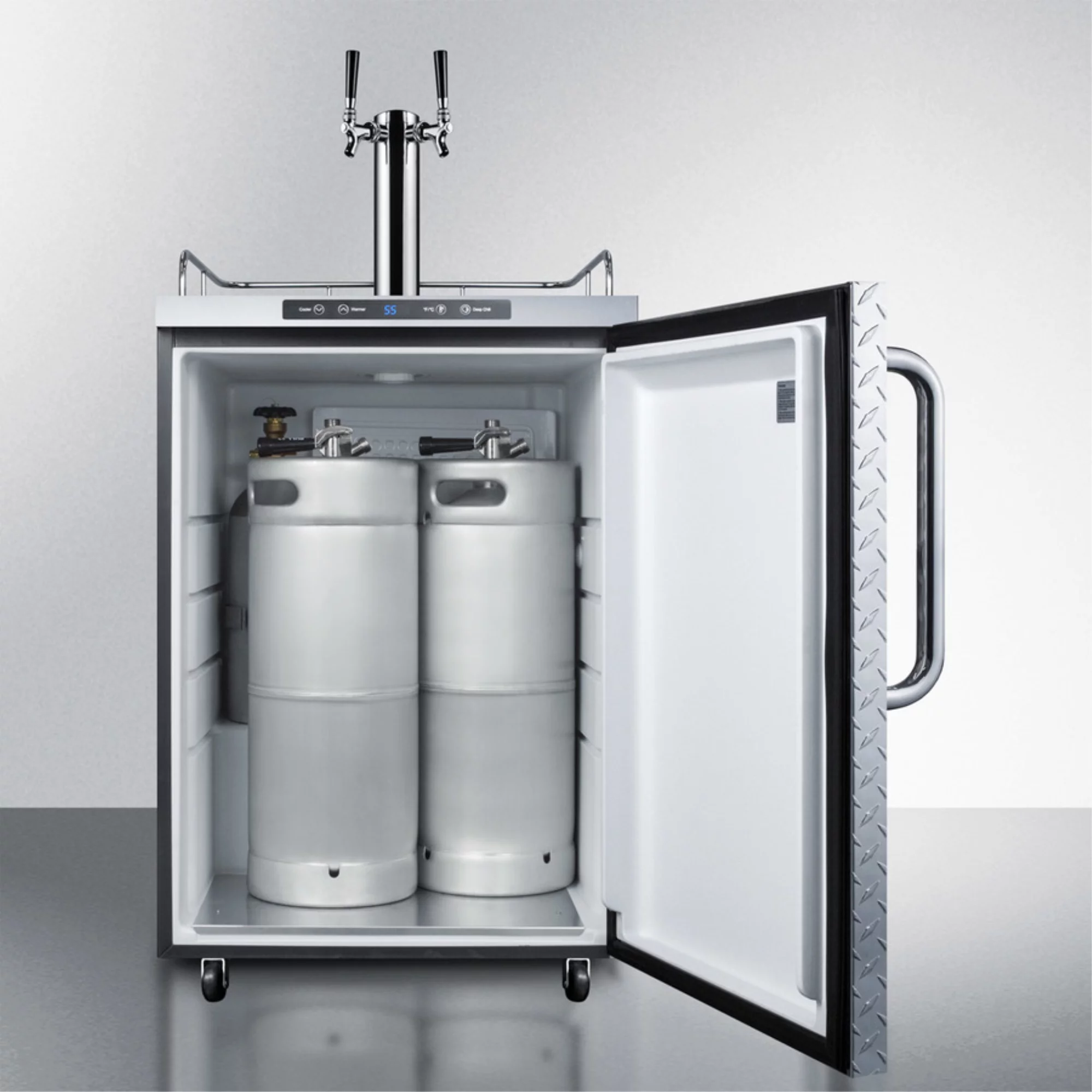 Freestanding residential outdoor beer dispenser, auto defrost with digital thermostat, stainless steel wrapped cabinet, diamond plate door, towel bar handle, and dual tap system