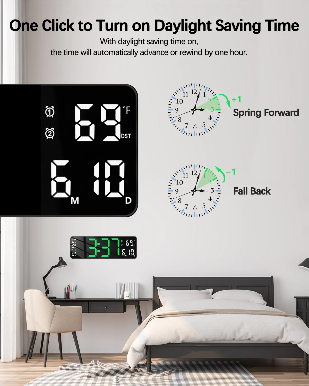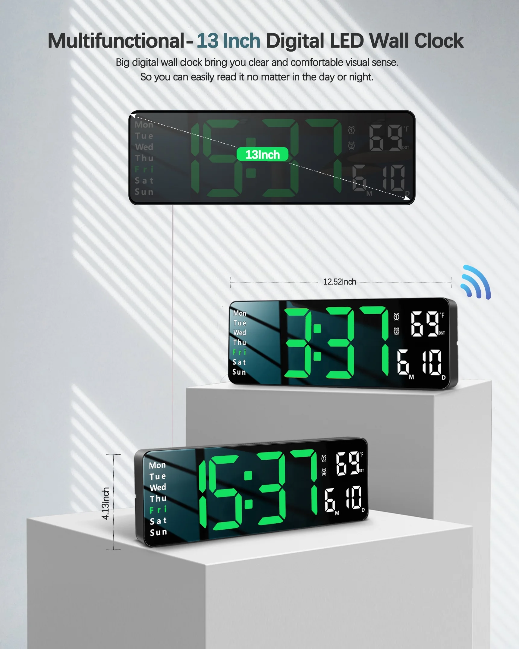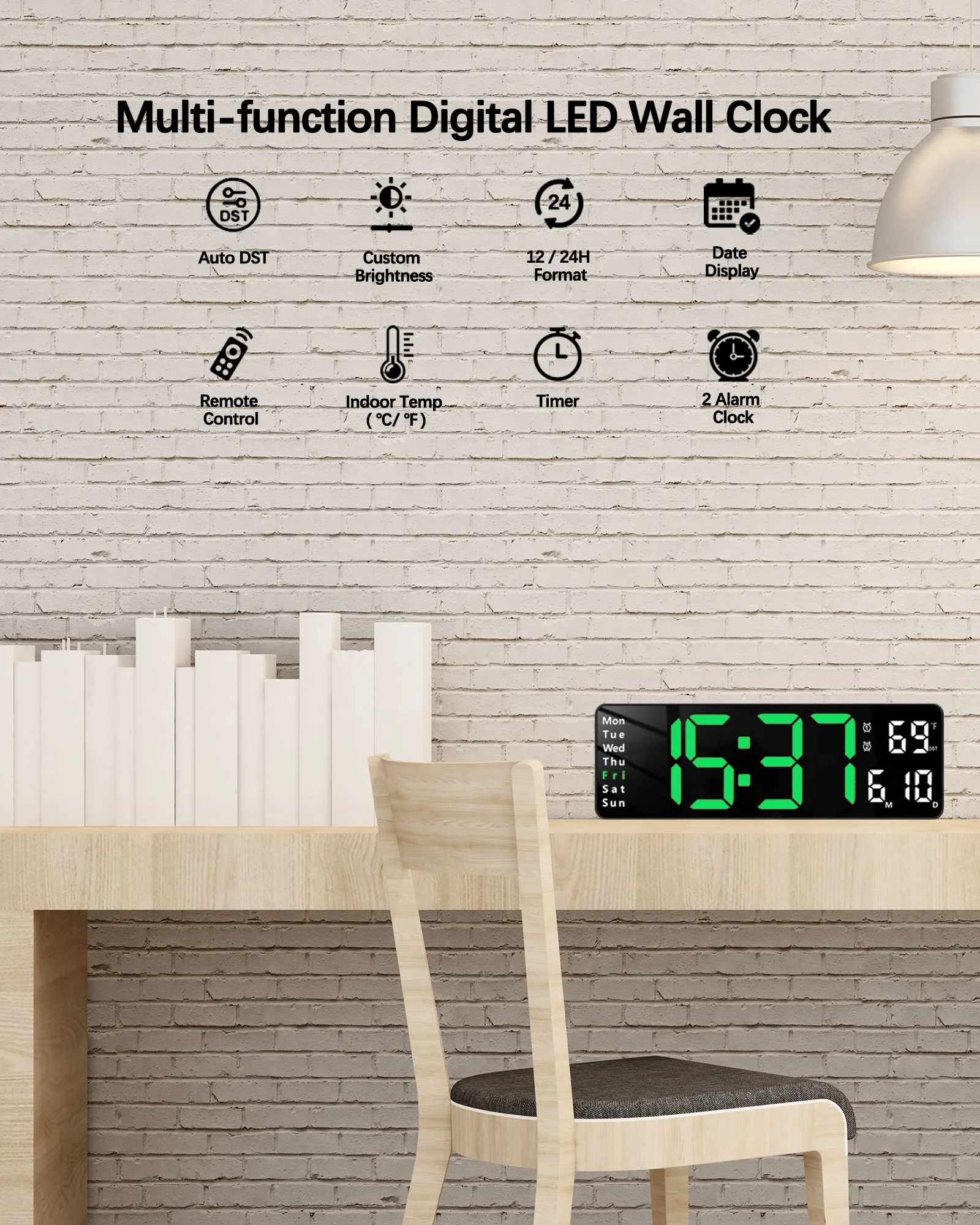 JoFomp Digital Wall Clock - Large LED Display, Loud Alarm, Remote Control, DST, Auto-Dimming, Date and Day, Timer, Temperature - 12/24H Format - Ideal for Living Room, Bedroom, Kitchen