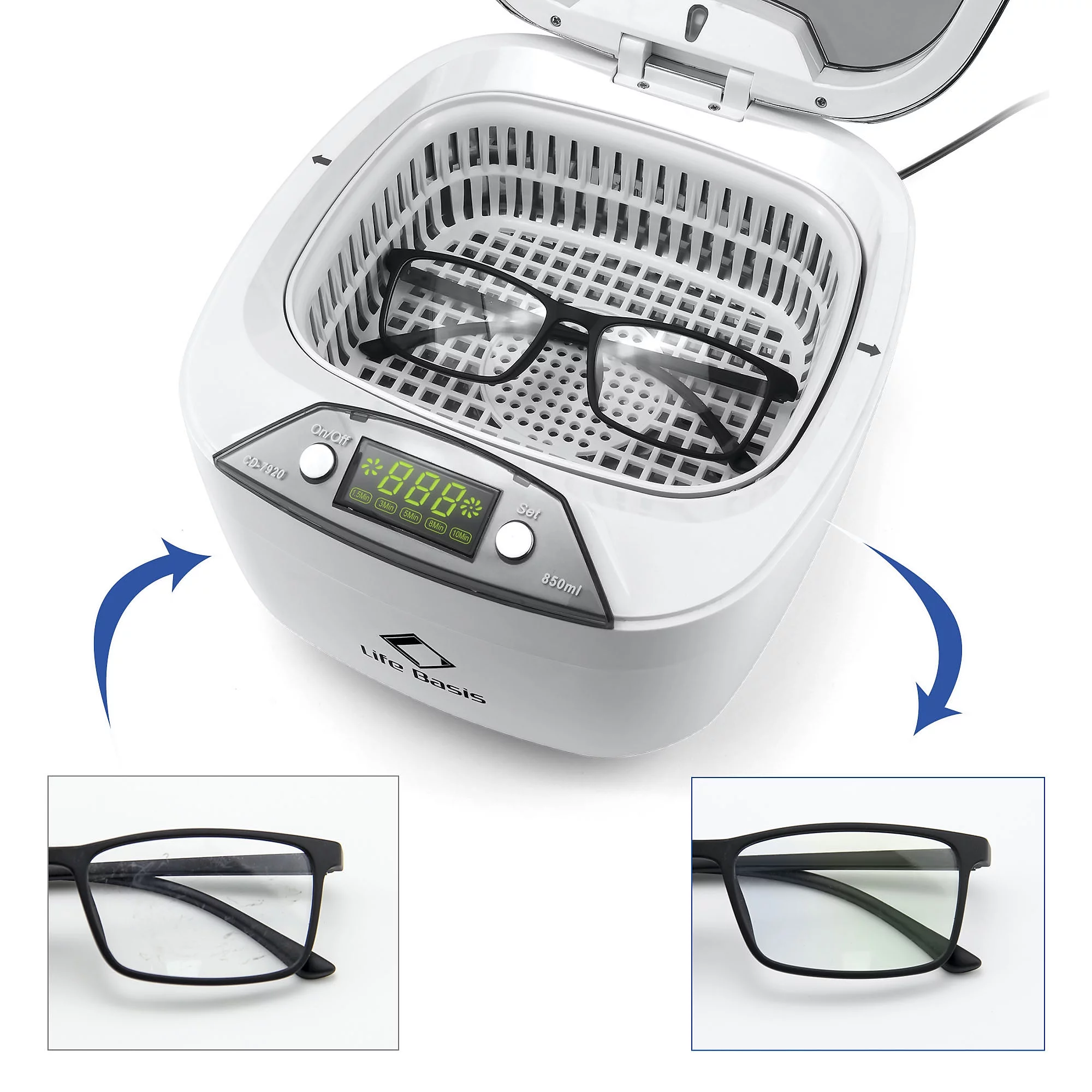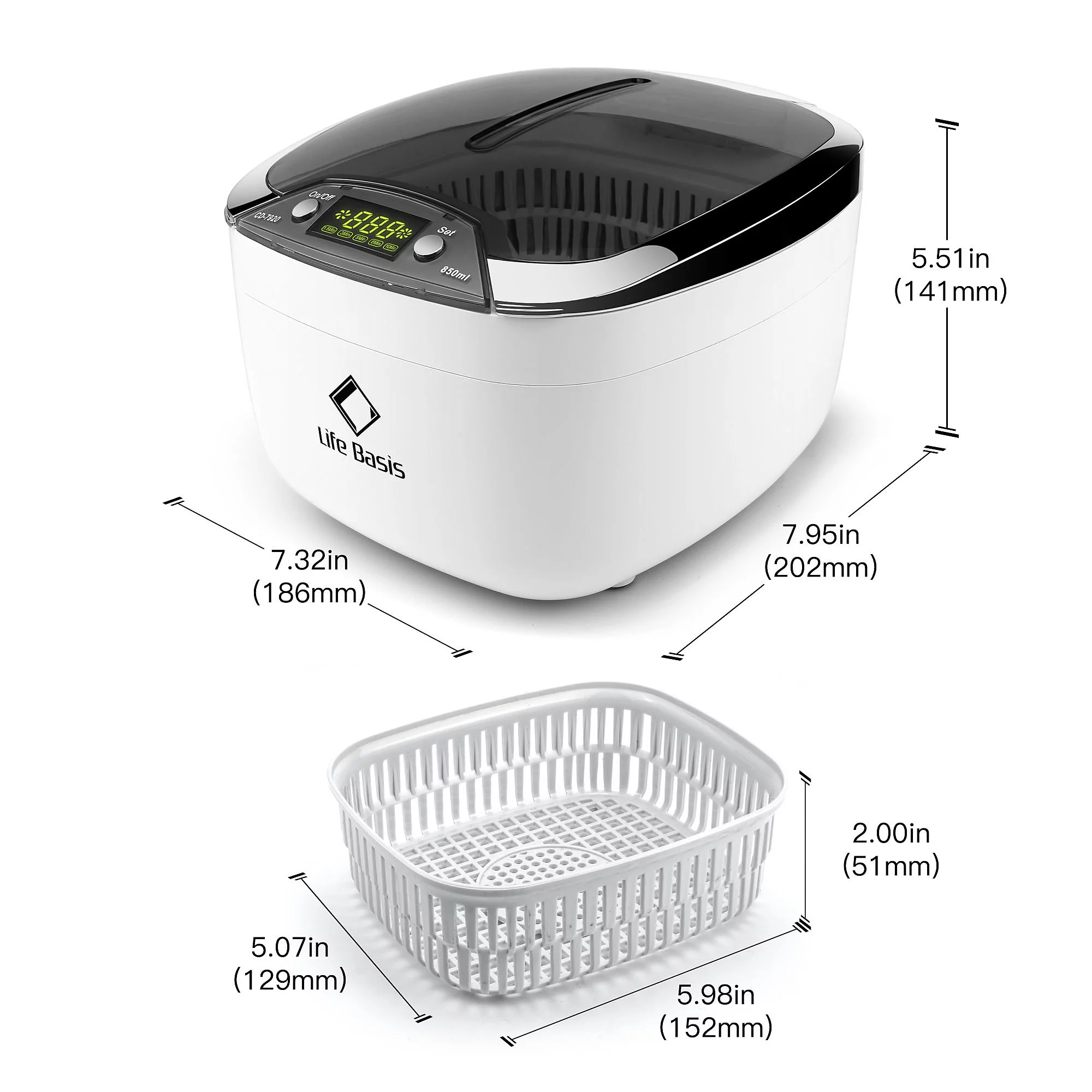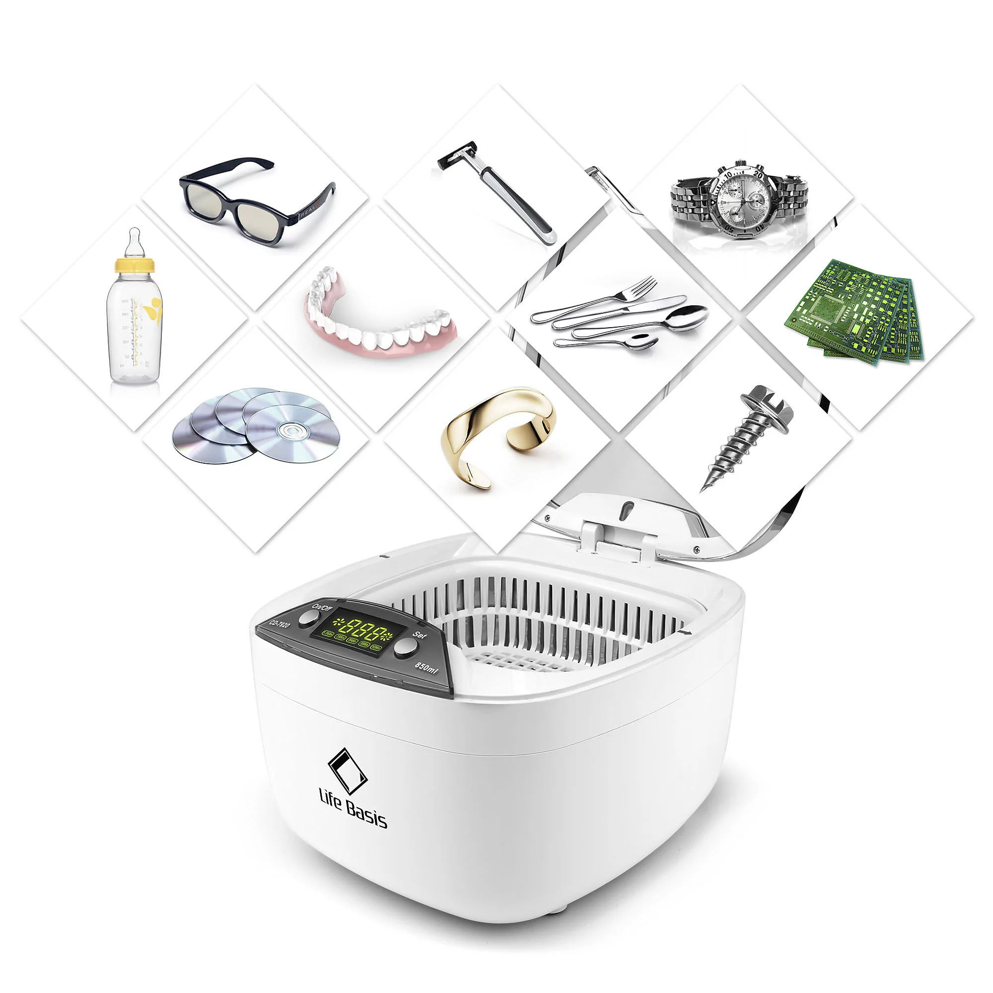 Life Basis Ultrasonic Jewelry Cleaner Ultrasonic Cleaner Machine 850ml (28 Ounces) LCD Screen with 5 Digital Timer Watch Stand CD Holder for Jewelry CD DVD Watches Glasses Makeup Brush